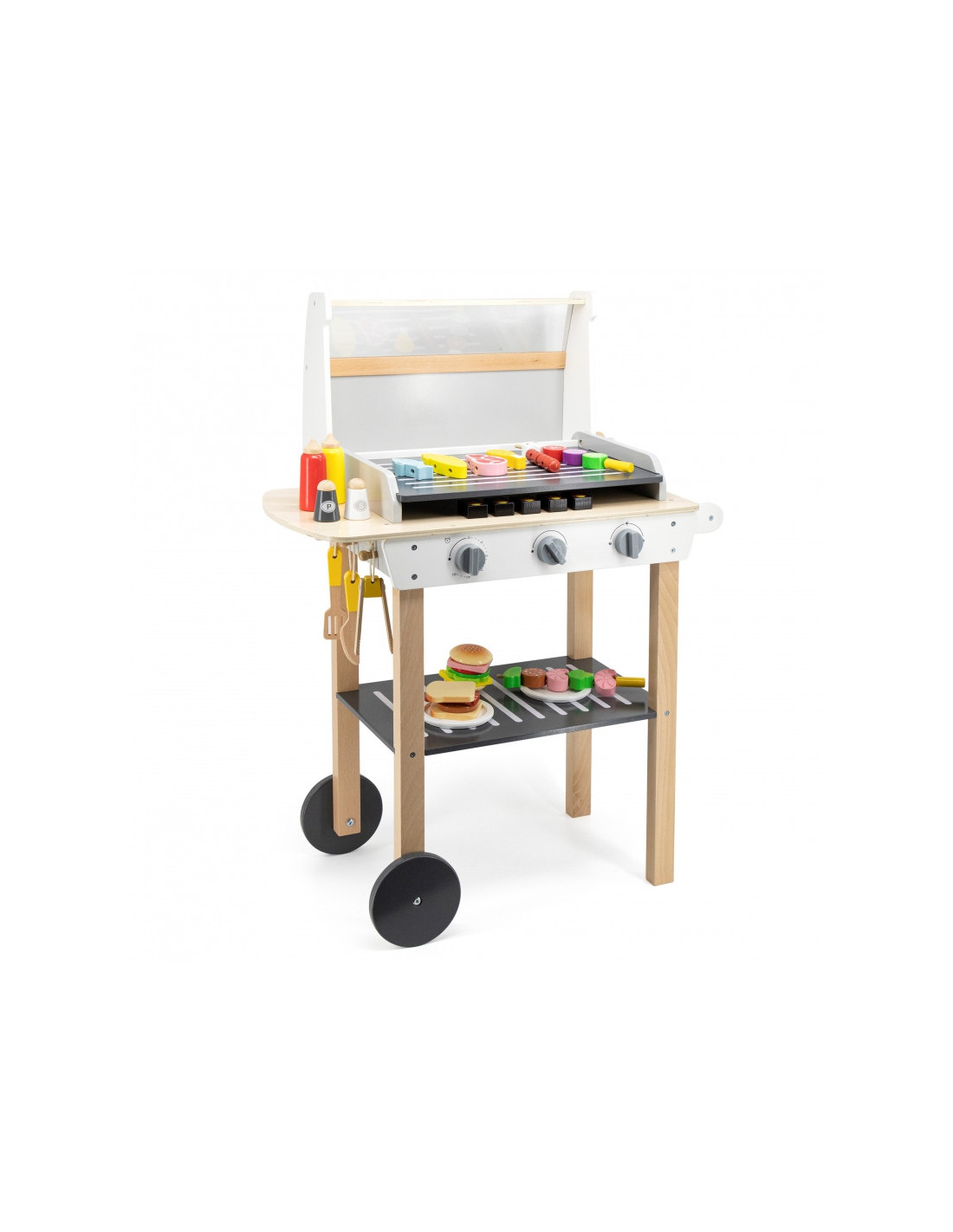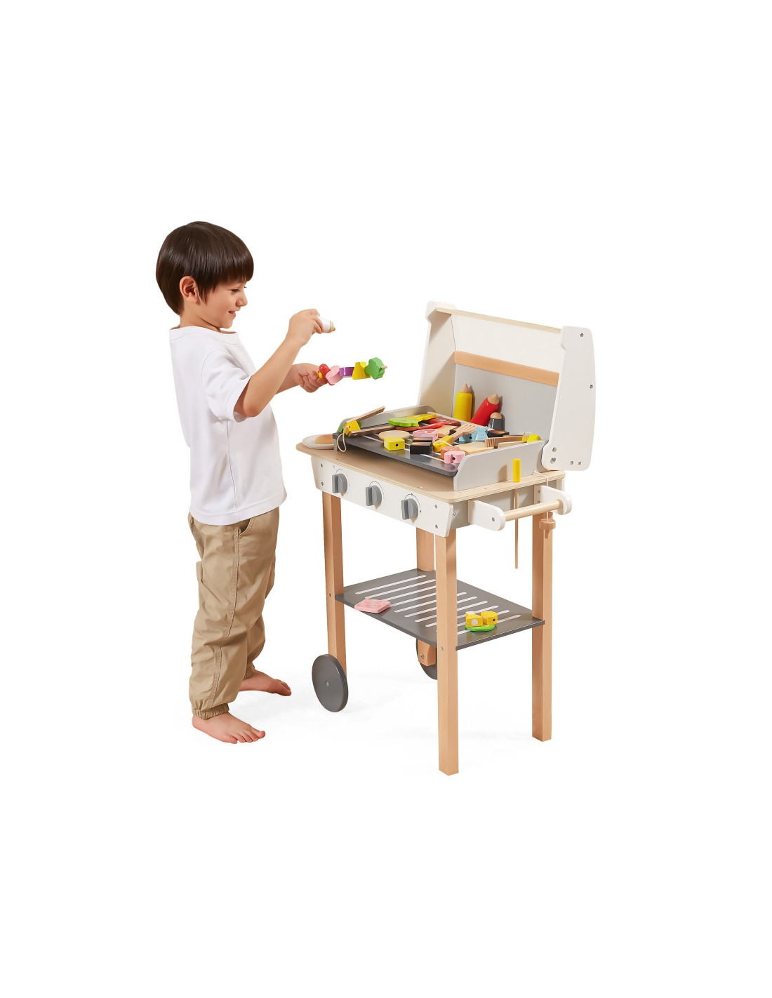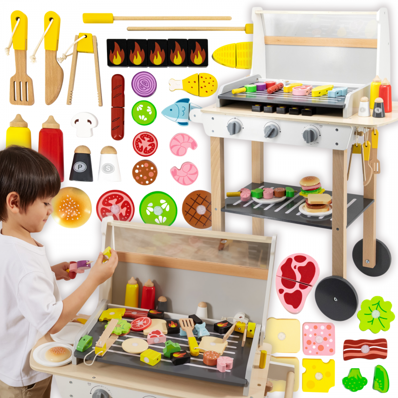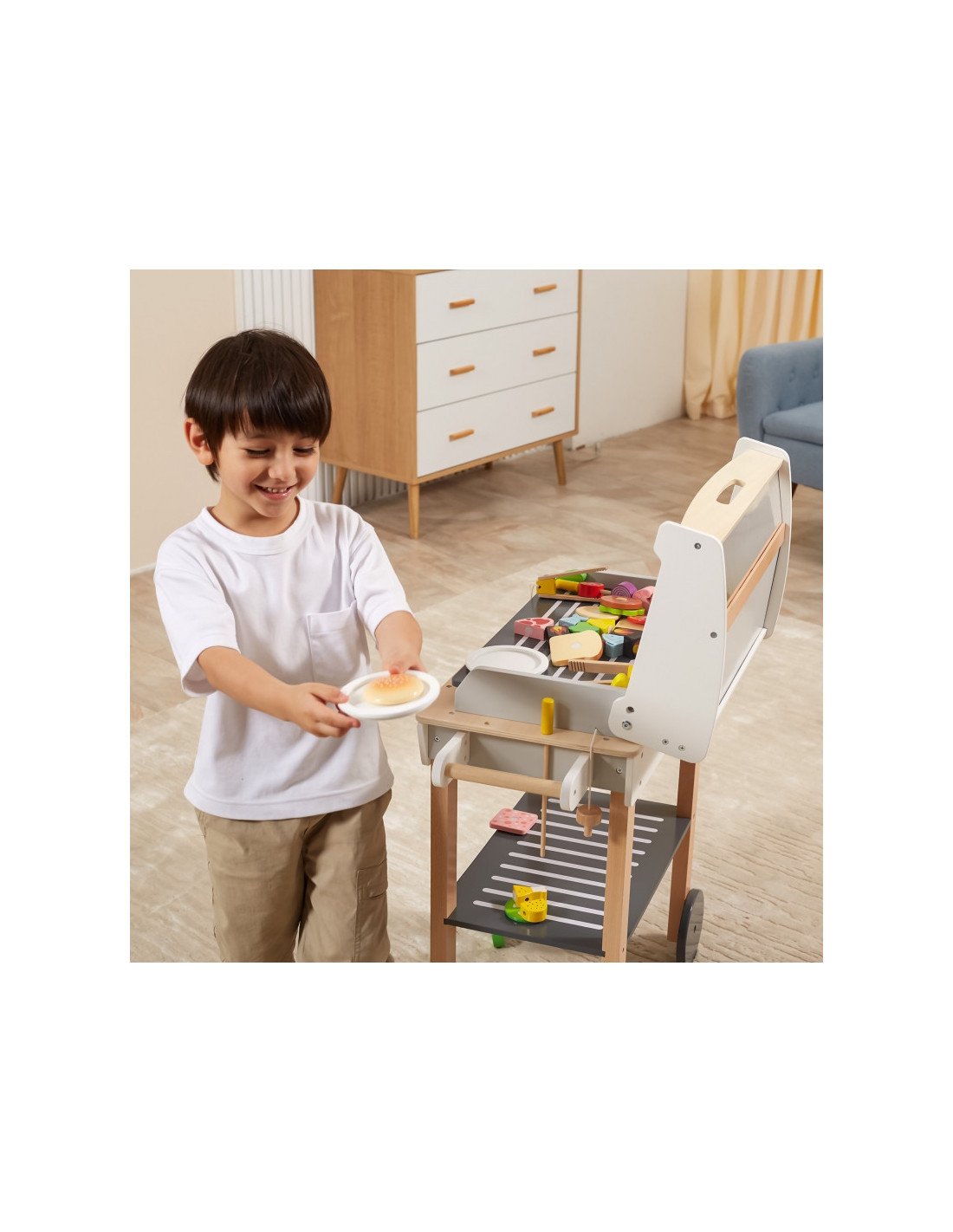 Medinės VIGA kepsninės yra kaip tikros kepsninės! Rinkinį sudaro 47 priedai , tokie kaip prieskonių stiklainiai, kečupas, garstyčios, žnyplės, stalo įrankiai ir kt. Garso efektai sustiprina tikrovišką pojūtį. Vaikai gali gaminti iešmelius, sumuštinius ir mėsainius. Nuimamas dangtis apsaugo „karštas“ groteles po kepimo, o ratukai ir patogi rankena leidžia transportuoti kepsninę bet kur sode ar namuose. Vaikai gali atlikti suaugusiojo, stebinčio šeimos kepsninę, vaidmenį.