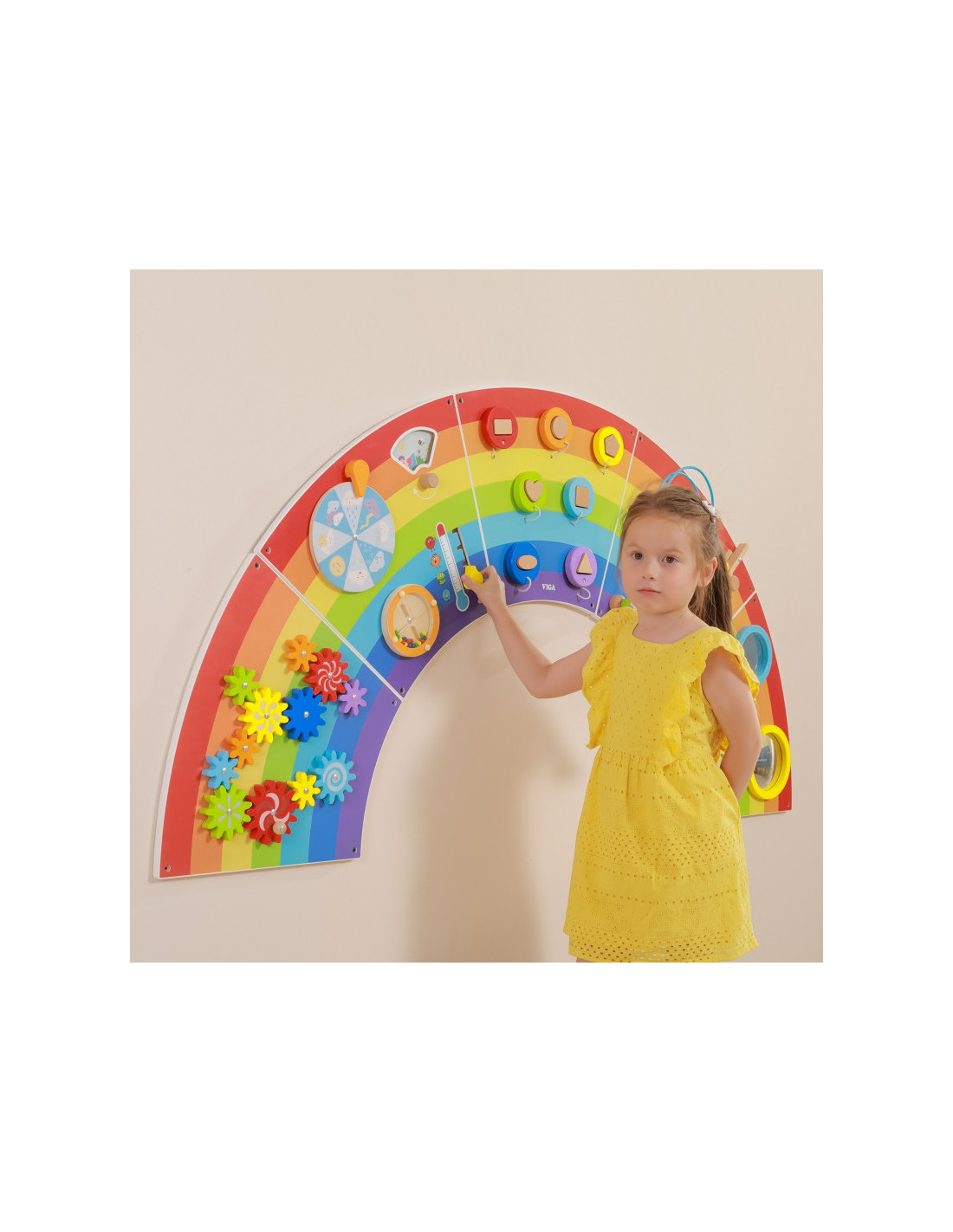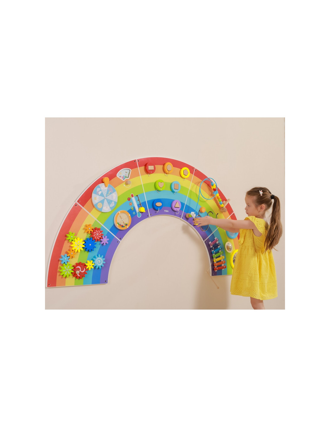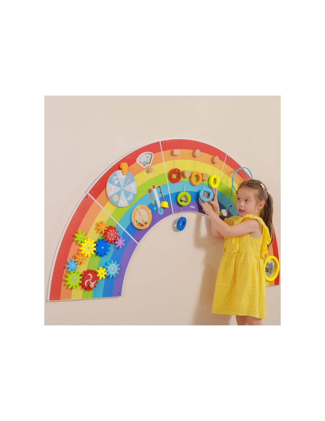 „Viga Toys“ vaivorykštės sensorinė ir manipuliacinė lenta yra medinis, daugiafunkcis sieninis žaislas , kuris suteiks vaikams valandų valandas pramogų. Tarp įvairių veiklų rasite 12: besisukančias pavaras, oro sąlygų lentą, riedantį diską, kaladėlių derinimo įrankį, ksilofoną, įgaubtą ir išgaubtą veidrodį, gongą ir karoliukų pynimą. Orų sąlygų lenta specialiai sukurta atsižvelgiant į vaivorykštės temą. Besikeičiančių metų laikų skydelį galima tyrinėti kartu su oro pokyčiais ir temperatūros svyravimais. Padalinta į 5 dalis , kad būtų lengva transportuoti ir surinkti. Visos 5 dalys yra vienodo dydžio, todėl jas galima surinkti bet kokia tvarka. Išlenktas dizainas skatina įvairaus dydžio vaikus žaisti ir tuo pačiu metu mokytis pagrindinių sąvokų apie spalvas, formas, garsus ir orus. Šis žaislas skirtas stimuliuoti pojūčius ir lavinti vaikų motorinius įgūdžius . Tai puikus pratimas lavinti mažųjų pirštelių miklumą . Jis taip pat lavina loginį mąstymą ir kantrybę. Tai idealus papildymas ankstyvojo mokymosi aplinkoje ir vaikų priežiūros įstaigose.
