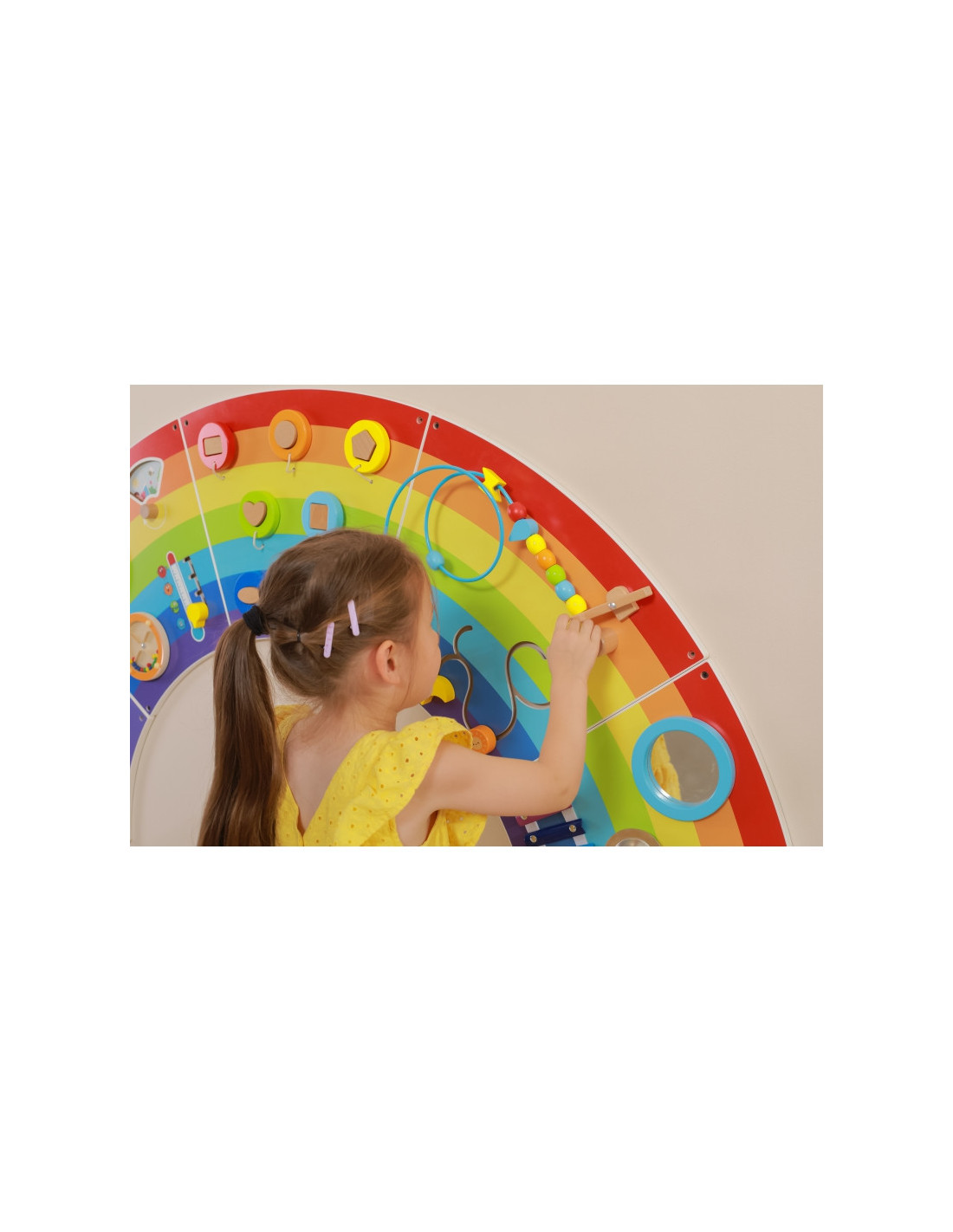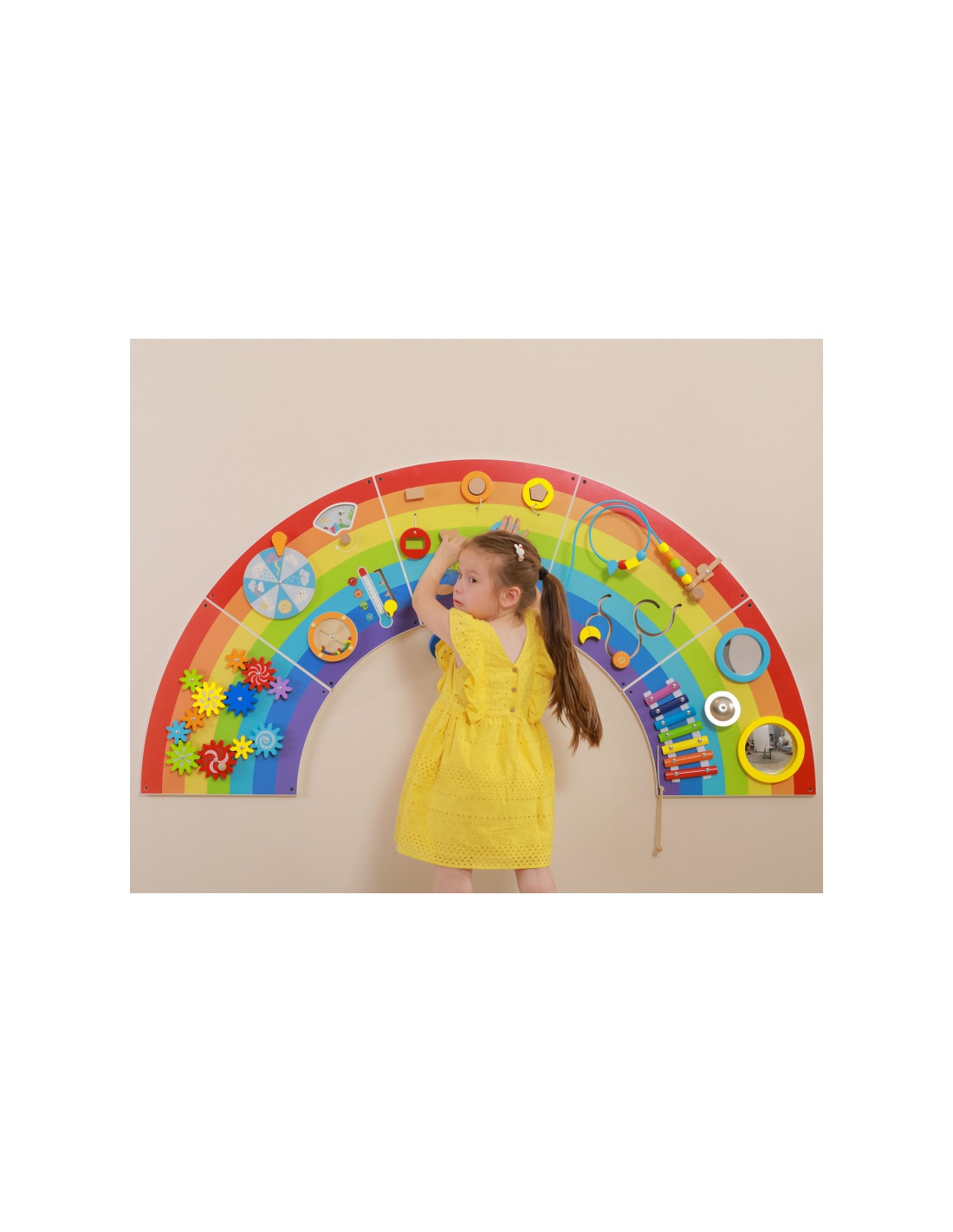 - - vaivorykštės formos medinė sensorinė ir manipuliacinė lenta traukia dėmesį ir skatina žaisti,