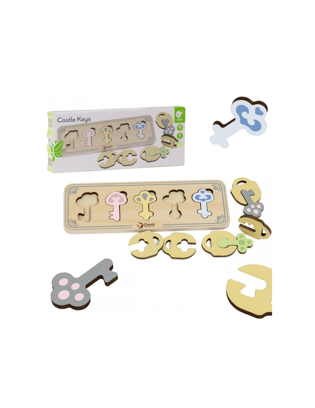 CLASSIC WORLD medinė spyna su raktu yra sensorinė dėlionė mažyliams. Žaidime reikia priderinti penkis unikalius raktus prie atitinkamų spynų. Raktus taip pat galima laikyti lentoje su kiekvienam raktui skirta vieta . Puikiai tinka lavinti mažų vaikų akių ir rankų koordinaciją bei regimąjį pažinimą.
