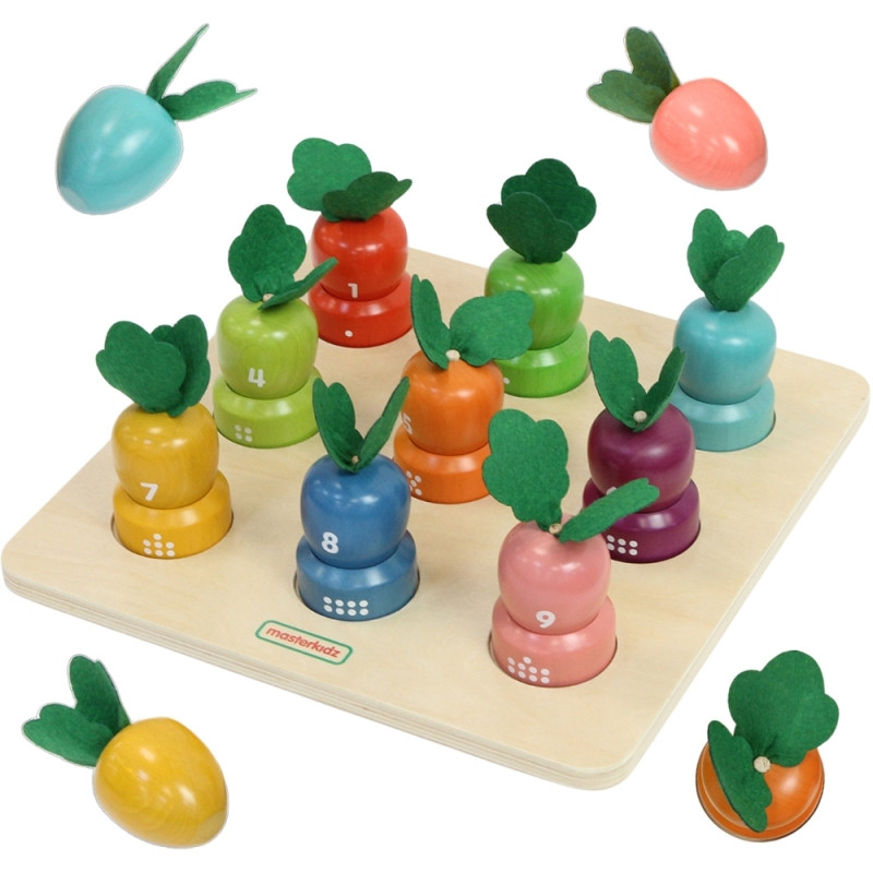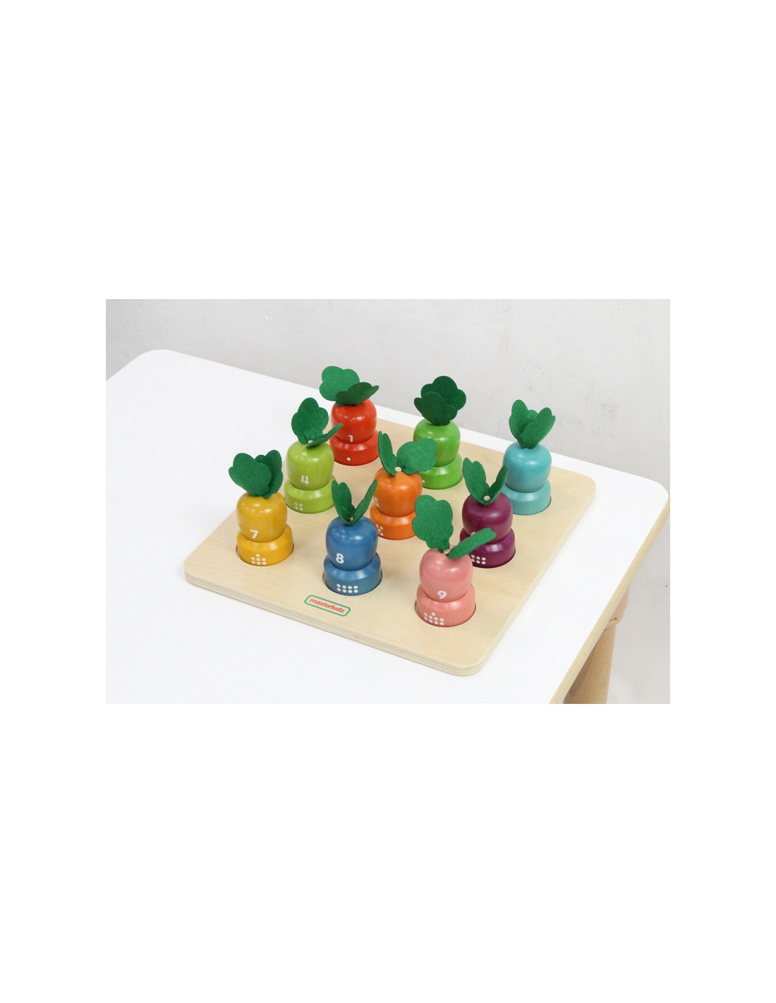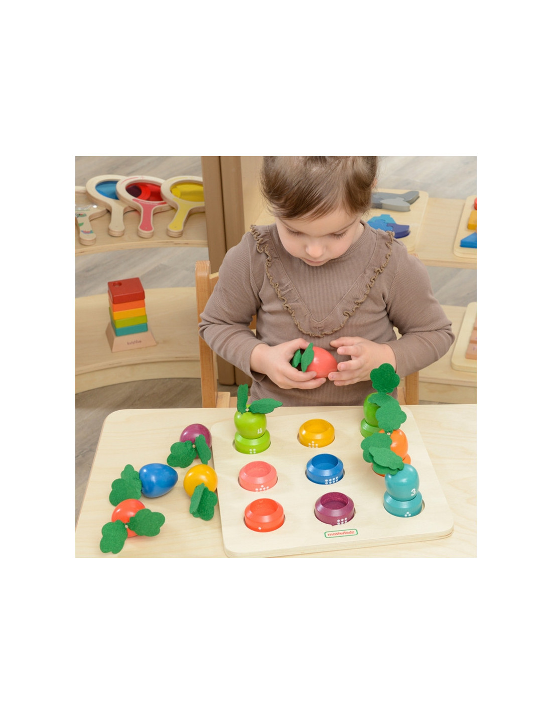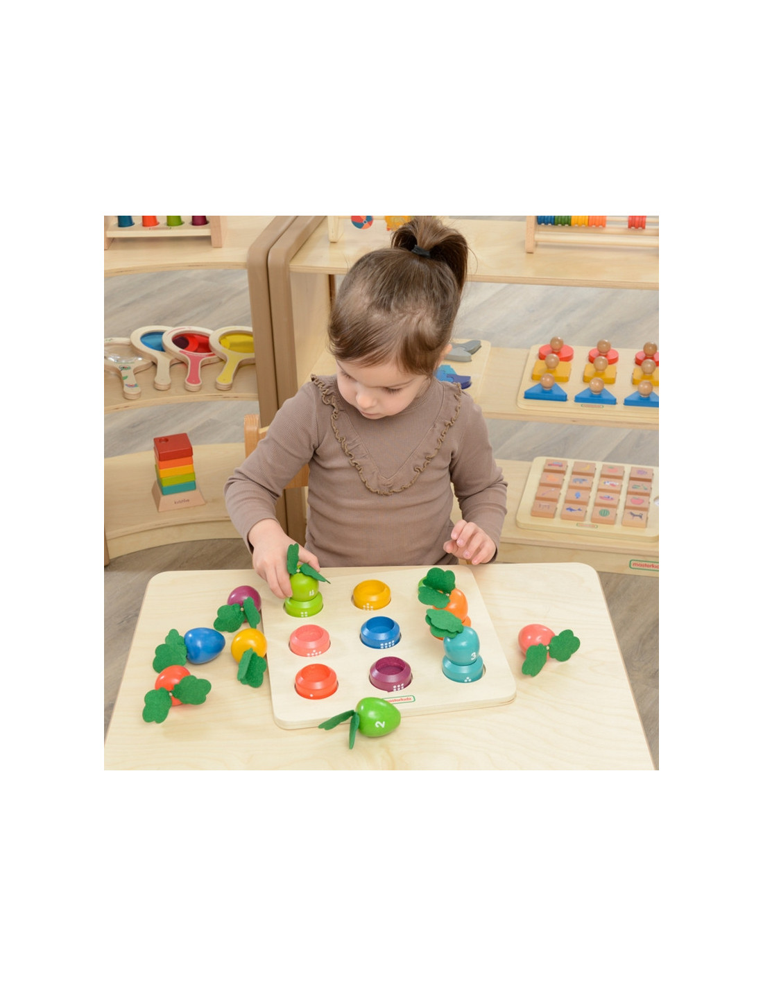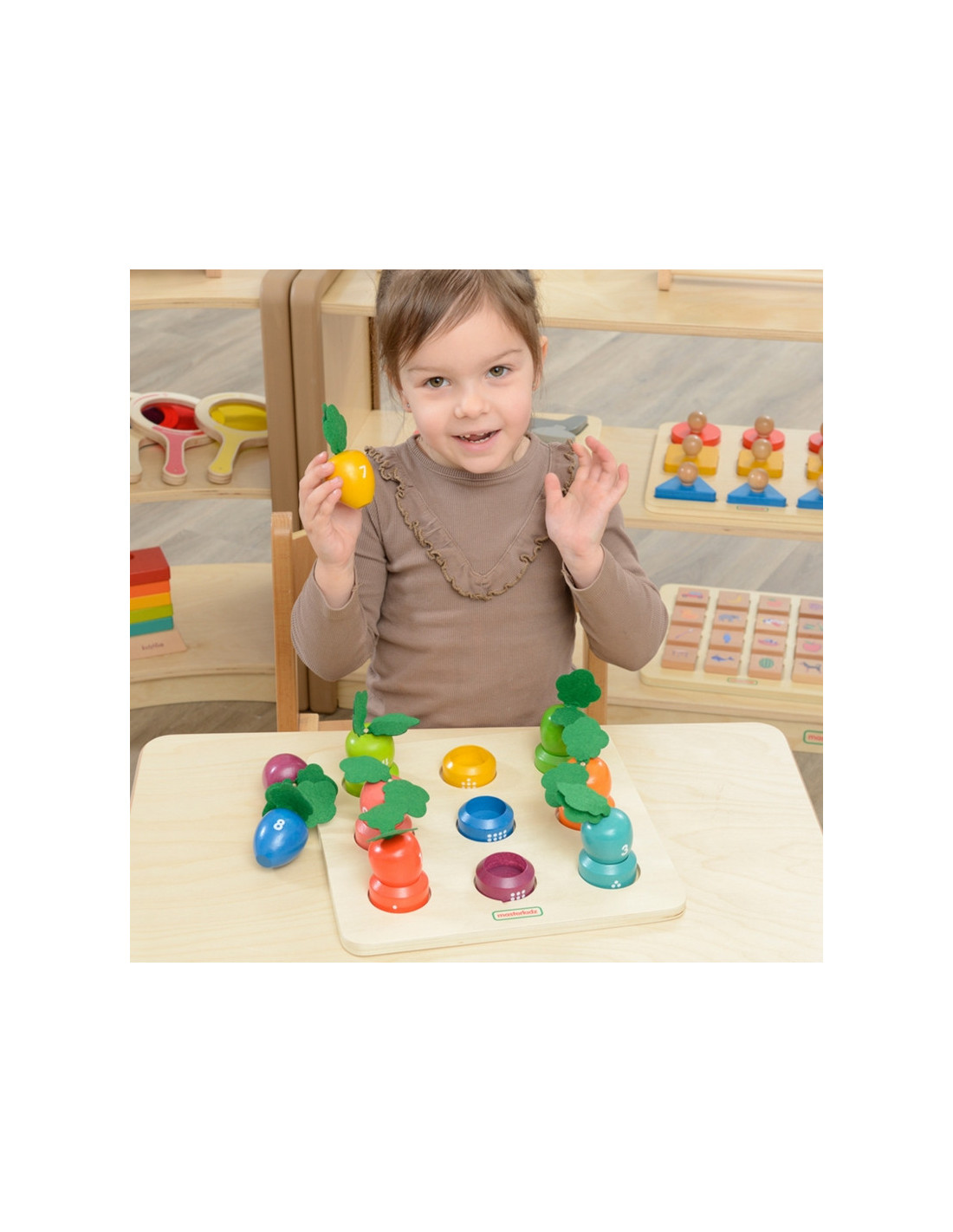 Medinė lenta skaičiams ir spalvoms mokytis iš MASTERKIDZ prekės ženklo. Sukurta padėti vaikams lavinti pojūčius , vaikai turi parinkti tinkamą daržovę pagal taškelių skaičių ir spalvą . Lenta taip pat lavina smulkiąją motoriką .