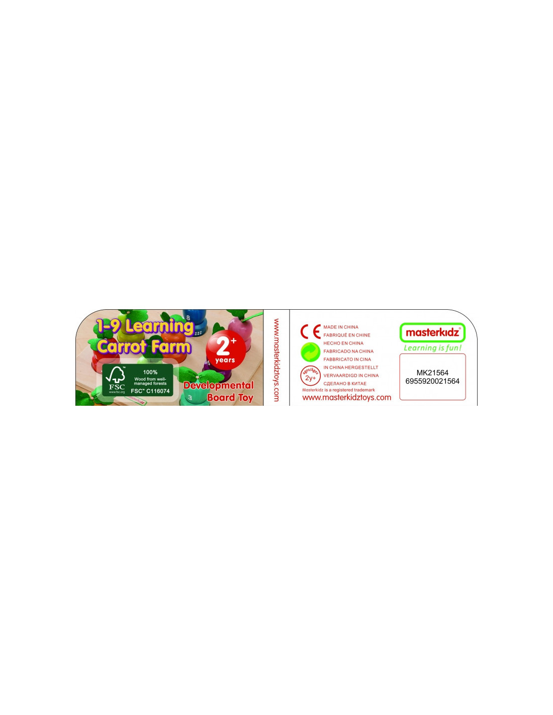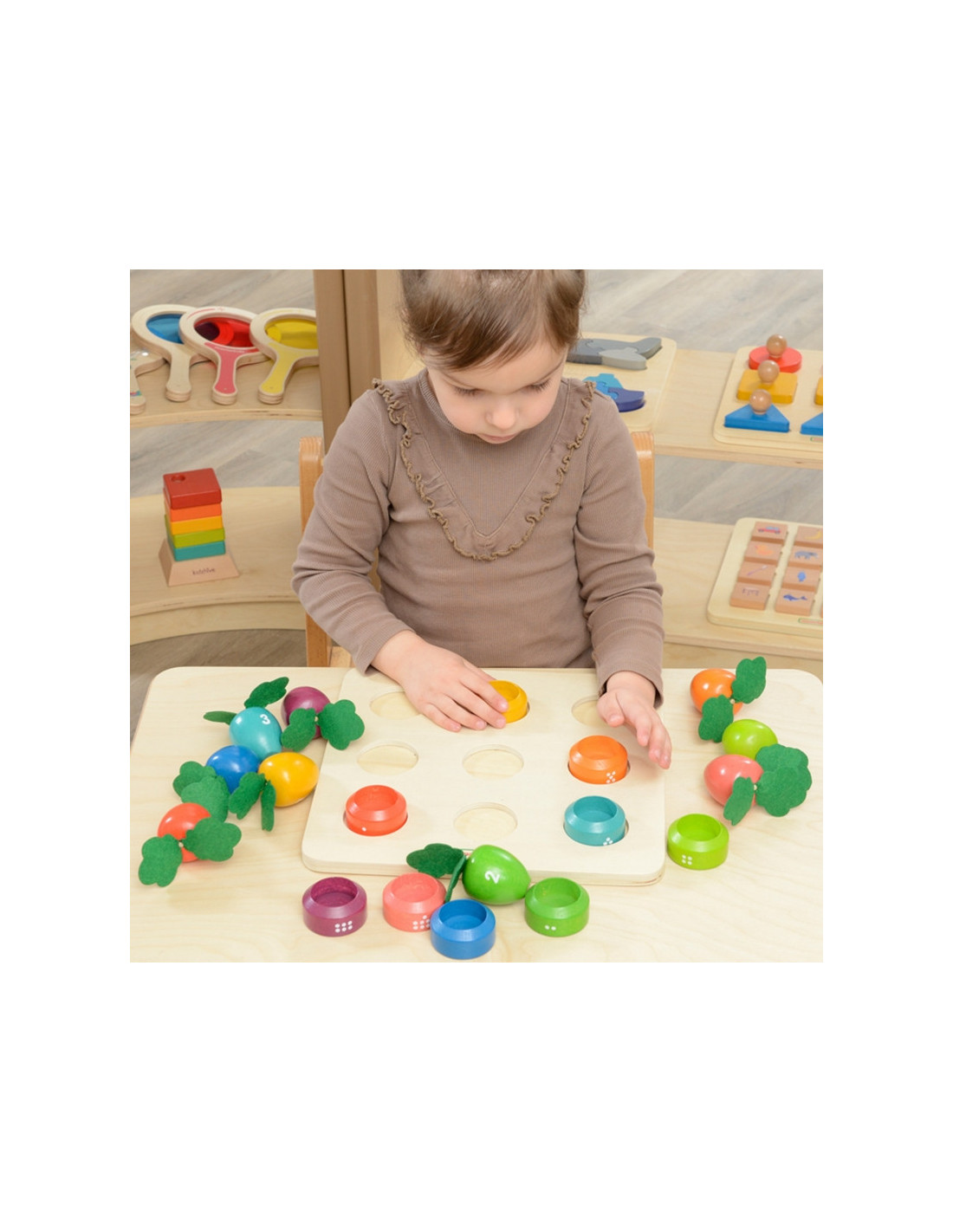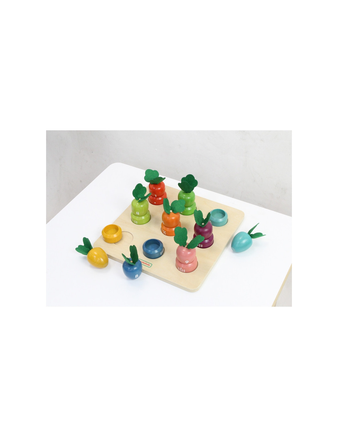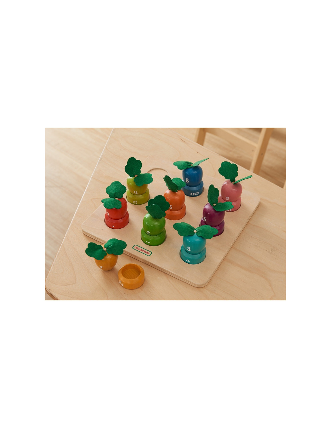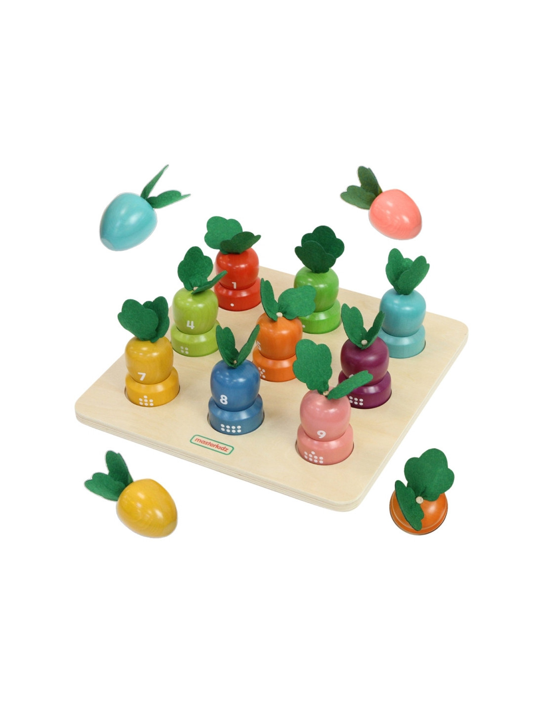 Medinė lenta skaičiams ir spalvoms mokytis iš MASTERKIDZ prekės ženklo. Sukurta padėti vaikams lavinti pojūčius , vaikai turi parinkti tinkamą daržovę pagal taškelių skaičių ir spalvą . Lenta taip pat lavina smulkiąją motoriką .