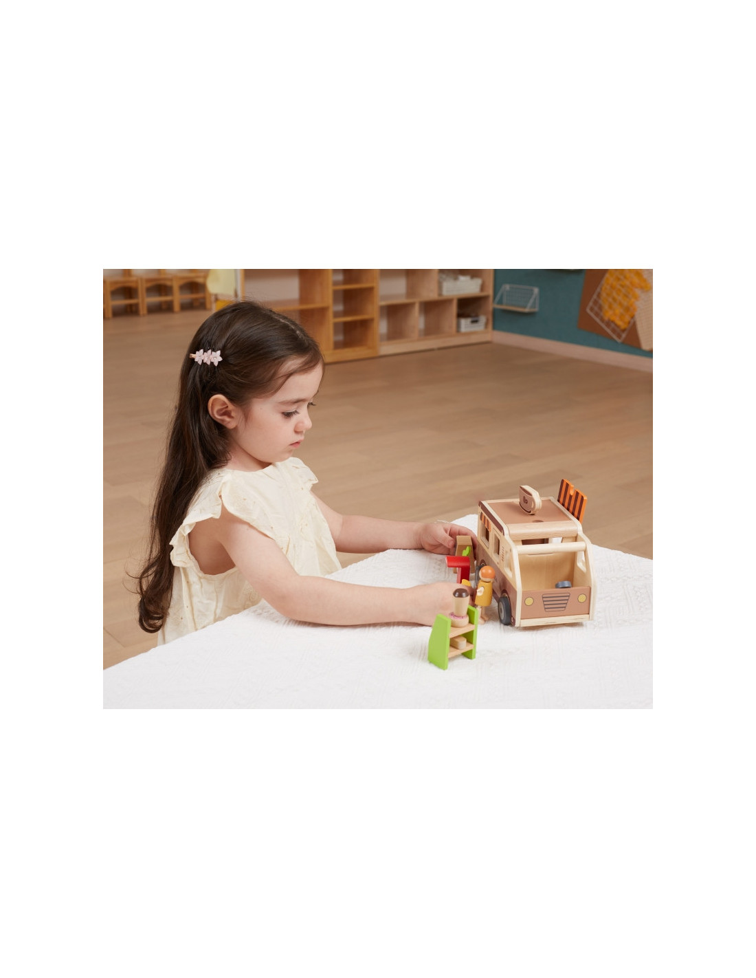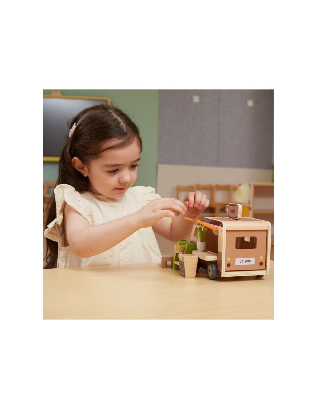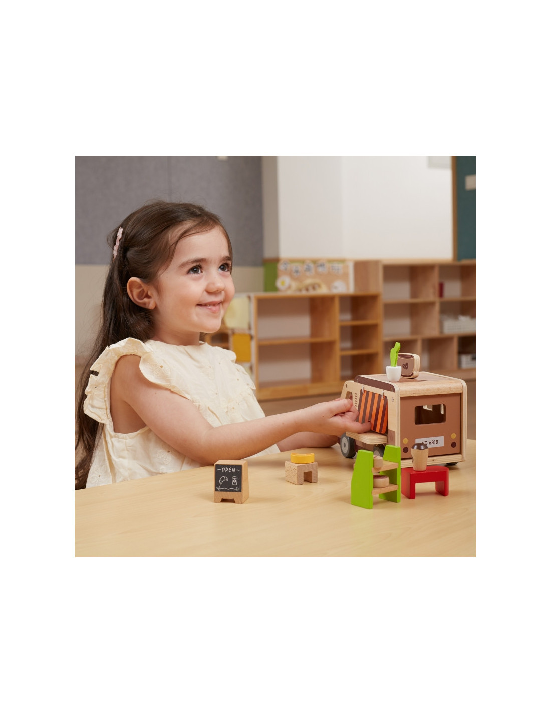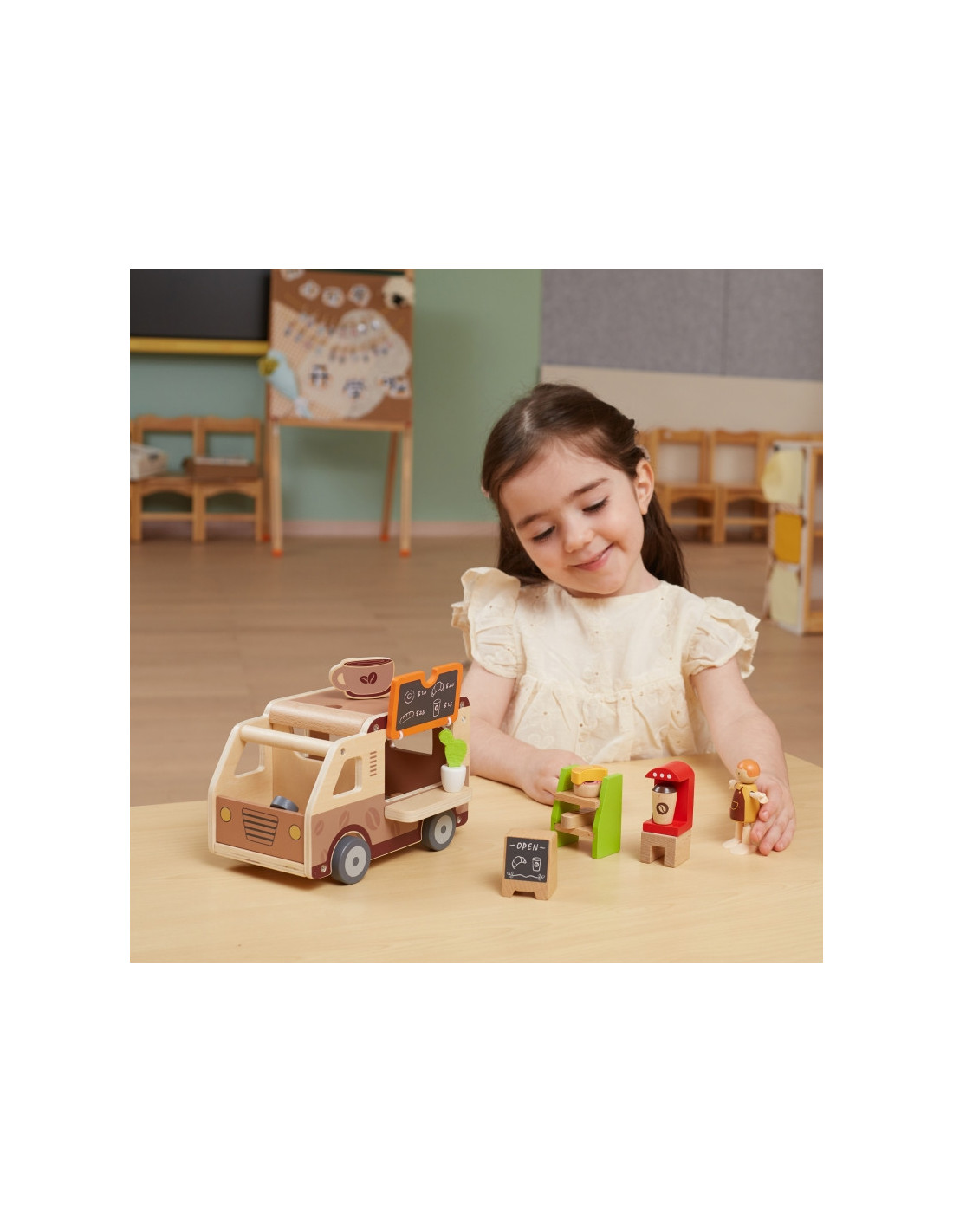 Norite kavos ir užkandžių „Viga“ kavinėje? Šiame rinkinyje yra barista, užkandžių kioskas, spurga, kruasanas, duona, kava, gėlė dekoracijai, kavinės iškaba, kavos aparatas su staliuku ir kreidinė lenta. Iššokantis stogas, klientų aptarnavimo langelis ir lengvai atidaromas bagažinė suteikia tikrovišką žaidimo patirtį .