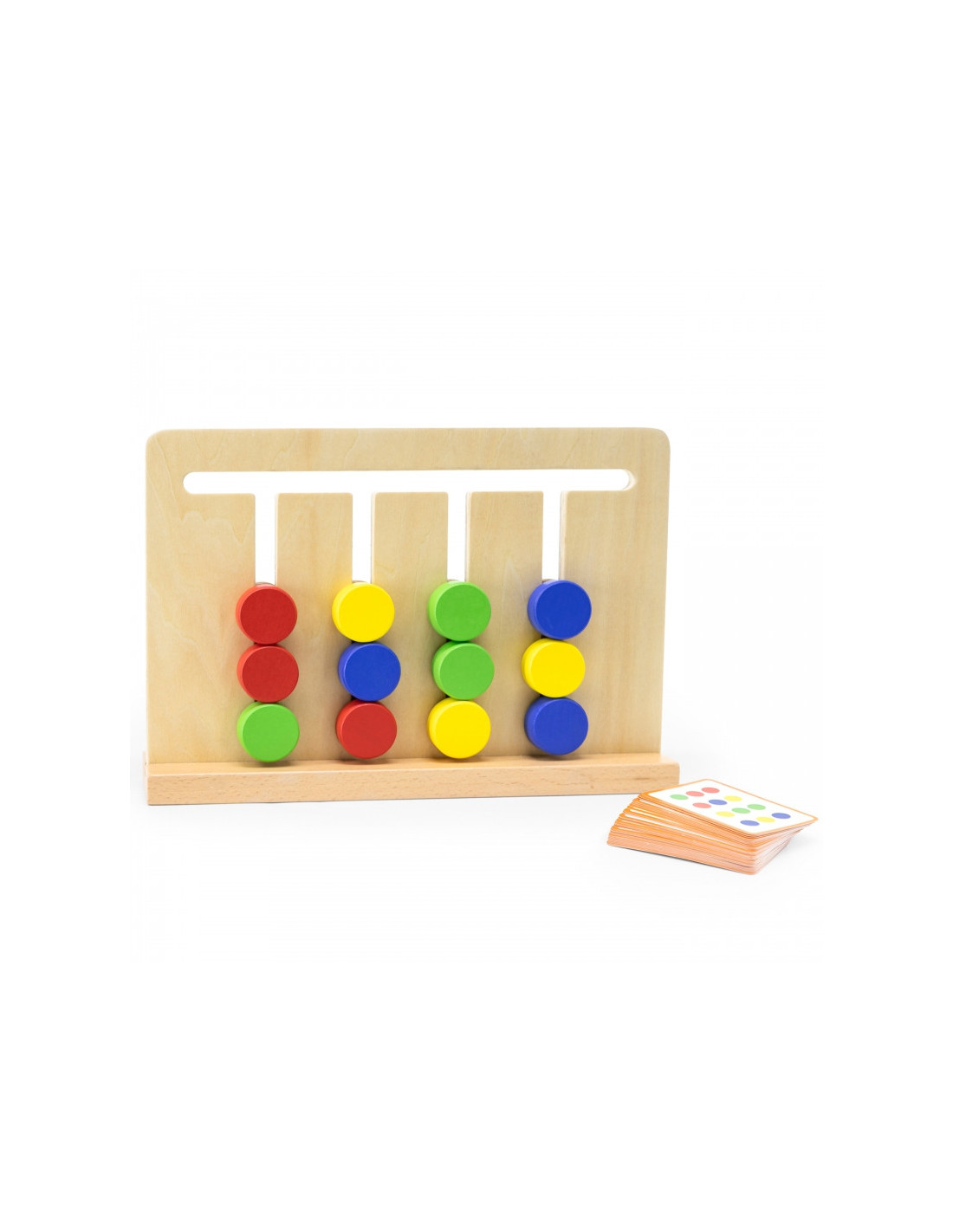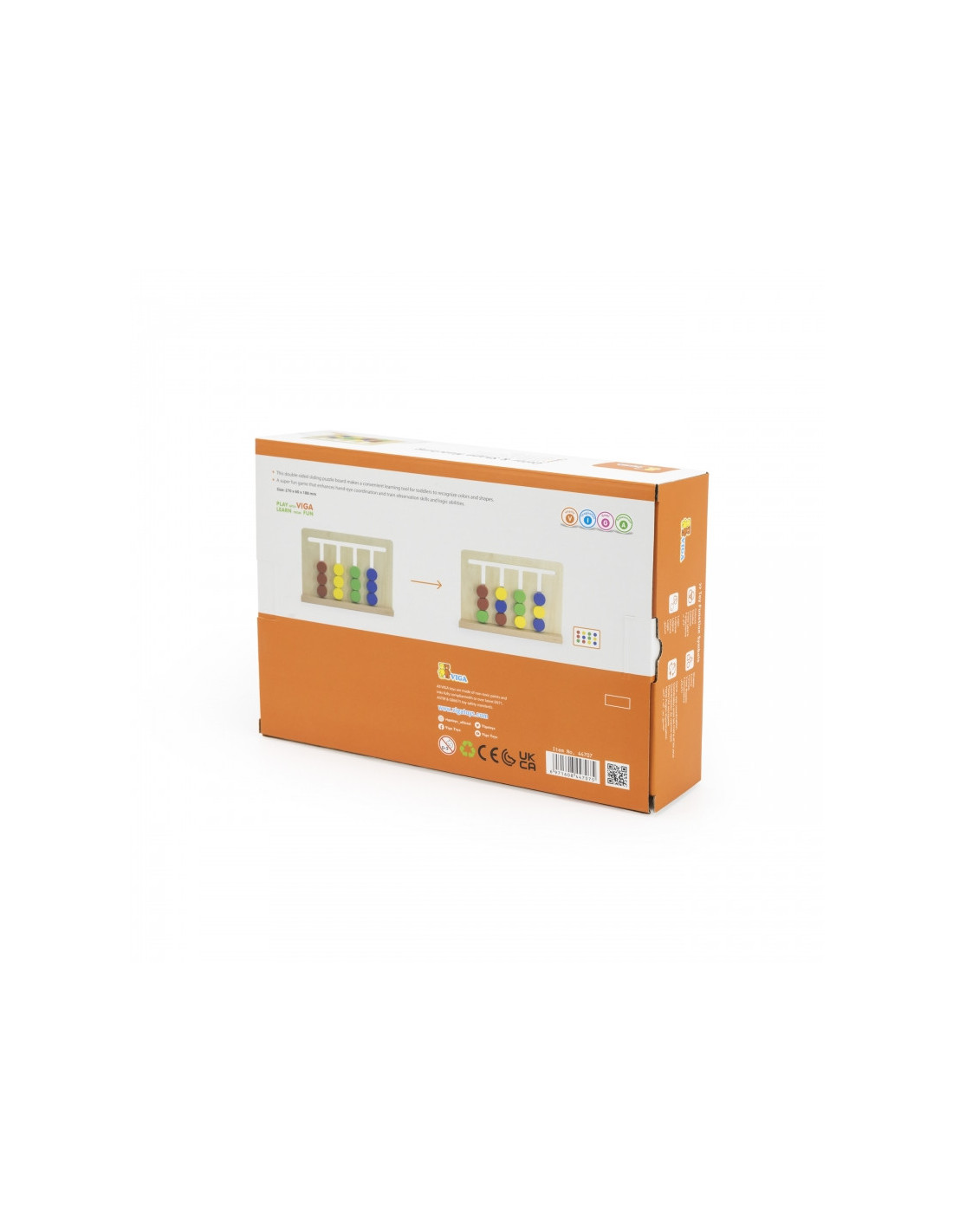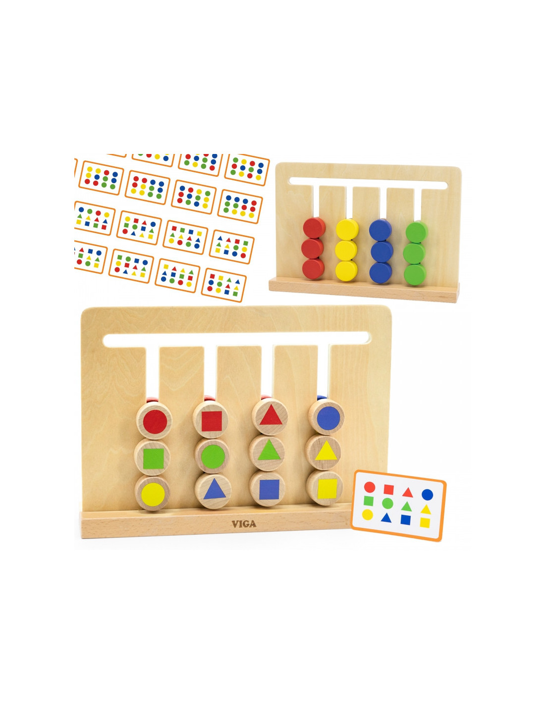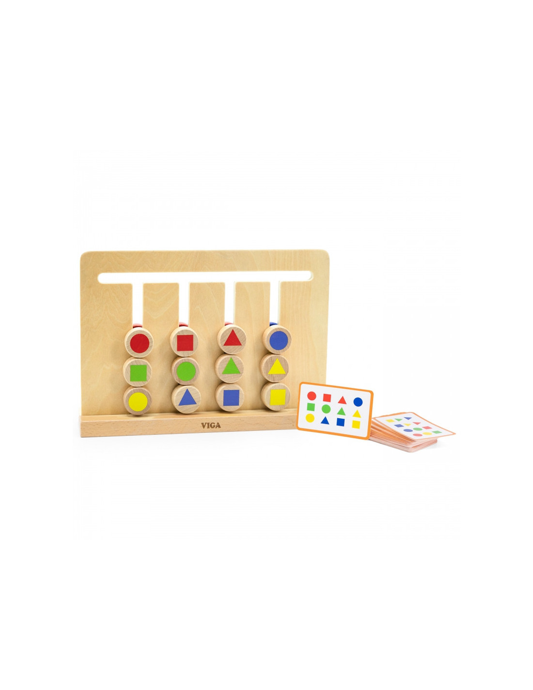 „Viga“ spalvų ir formų dėlionė suteiks valandų valandas pramogų! Šis laisvai pastatomas žaidimo rėmas turi 12 dvipusių kaladėlių. Kai jūsų vaikas įvaldys lengvesnę pusę su spalvotais kaladėlėmis, jis galės padidinti sudėtingumo lygį žaisdamas kitoje pusėje su spalvingomis geometrinėmis figūromis . Jūsų vaiko užduotis – surūšiuoti kaladėles arba nukopijuoti raštą ant kortelės, tačiau tam jis turi suplanuoti savo ėjimų tvarką .