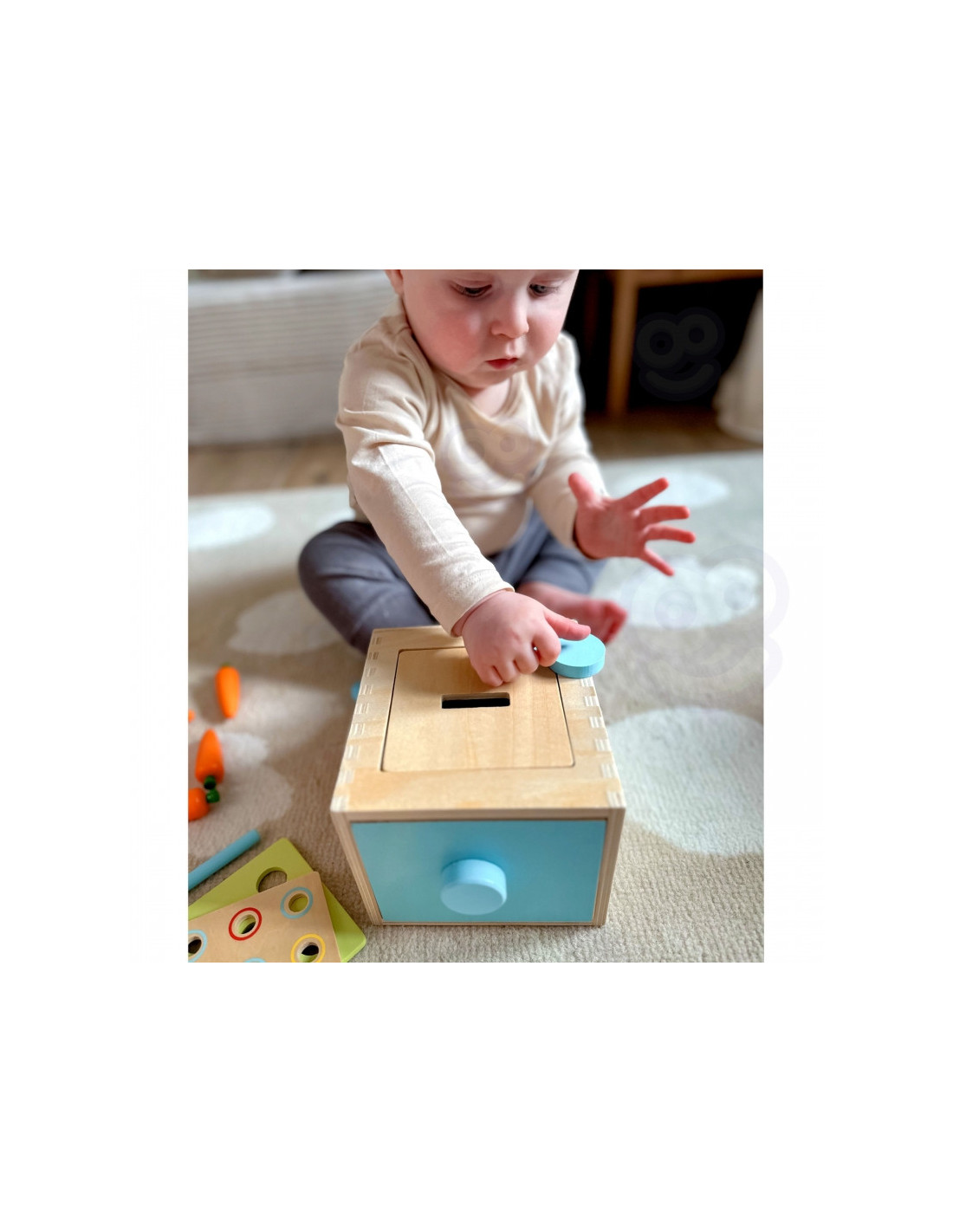 Žaidimo principas paprastas – įmeskite daiktą į atitinkamą angą ir stebėkite, kaip jis įslysta į ištraukiamą stalčių. Ši , atrodytų, paprasta veikla slepia daugybę edukacinių vertybių, kurios moko, linksmina ir lavina!