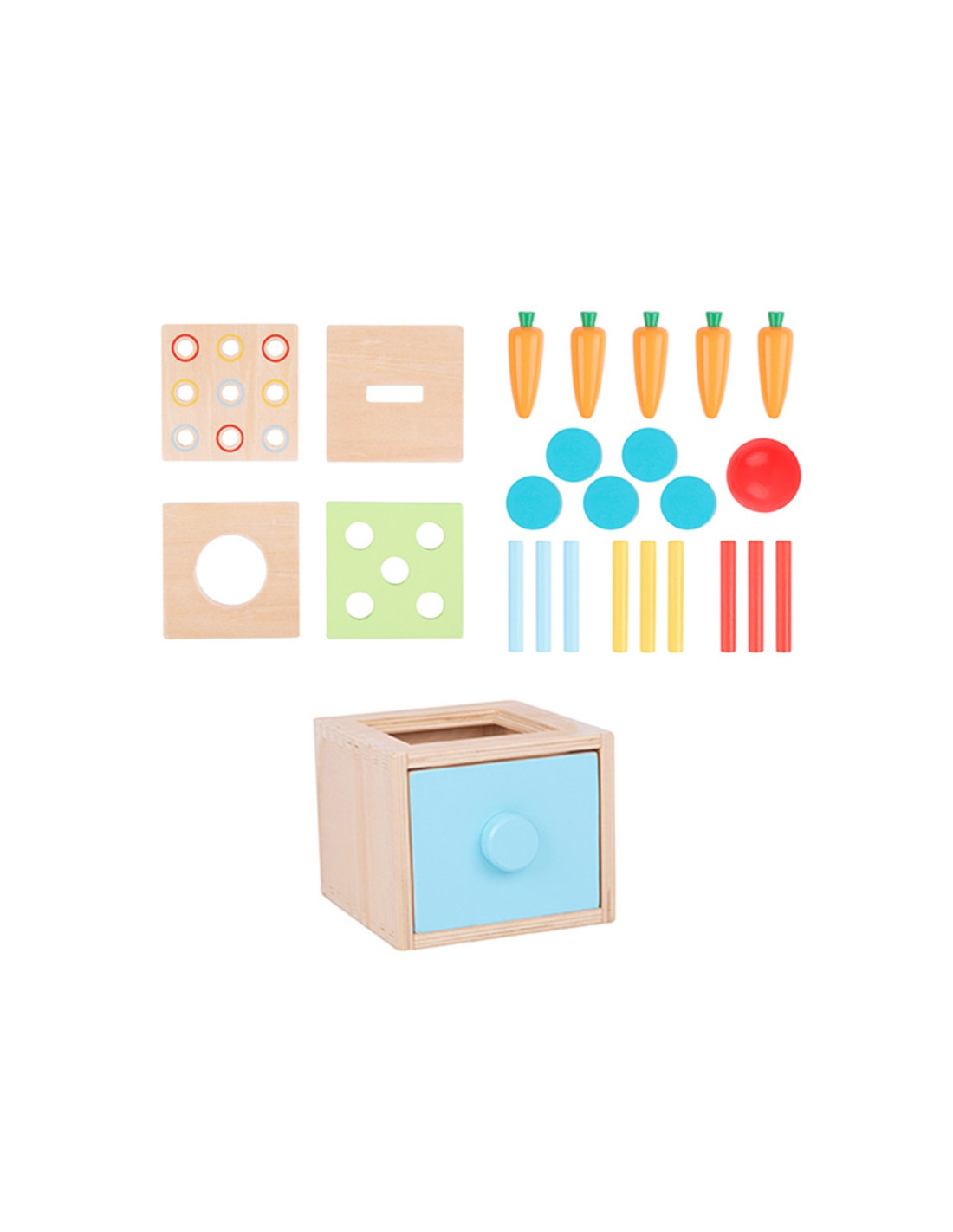 - - Rinkinį sudaro 26 elementai: stalčius, 4 įdėklai, 1 kamuoliukas, 5 monetos, 5 morkos, 9 spalvoti pagaliukai