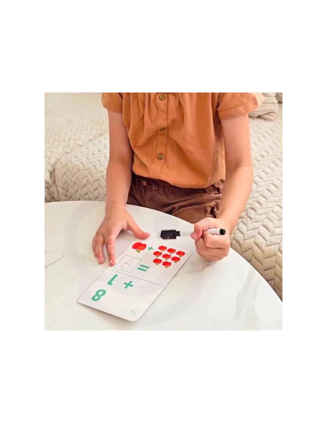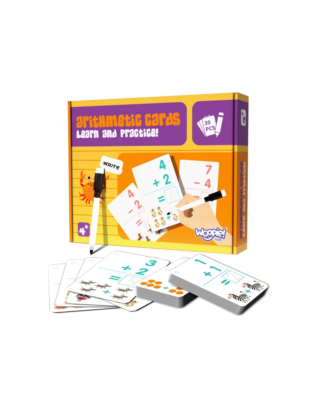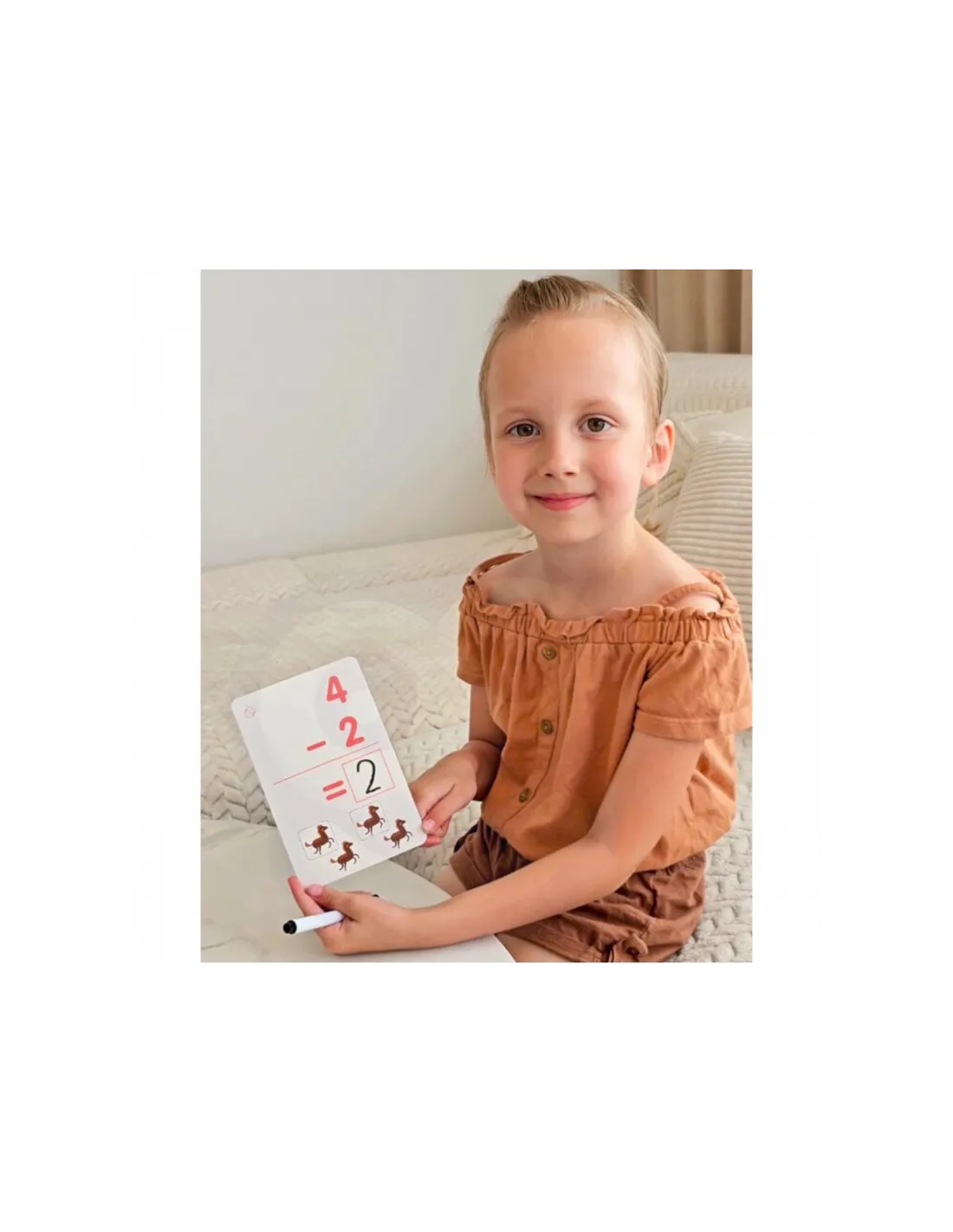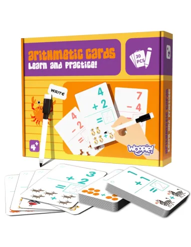 WOOPIE skaičiavimo kortelės – puiki dovanos idėja mūsų mažyliams. Šį fantastišką rinkinį sudaro 30 dvipusių kortelių , kurios skatina vaikus mokytis skaičių ir skaičiuoti . Rinkinys sukurtas taip, kad vaikai galėtų praktikuotis skaičiuoti pakartotinai, dėka pridedamo ištrinamo žymeklio . Kortelės yra suskirstytos į atimties ir sudėties dalis. Siekiant palengvinti mokymąsi, kortelės turi du lygius – pradžioje vaikai gali naudoti pusę, kurioje matematiniai veiksmai papildyti paveikslėliais , kuriuos jie gali naudoti rezultatui apskaičiuoti. Kitoje kortelių pusėje pateikiami skaičiavimai be paveikslėlių pagalbos . Šio mokymosi modulio dėka jūsų vaikas nejaus spaudimo dėl naujų žinių sudėtingumo , o matematikos uždavinių sprendimas bus grynas malonumas ! Norėdami motyvuoti savo mažylį mokytis, po kiekvieno teisingai išspręsto pavyzdžio kortelės kampe galite nupiešti širdelę!