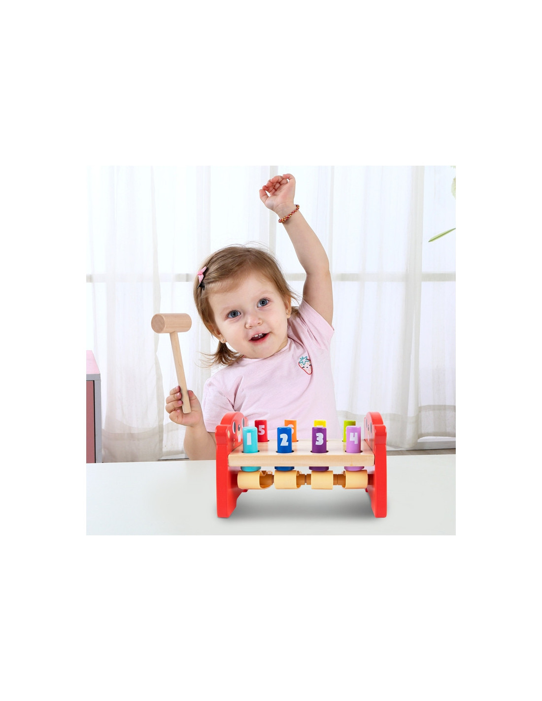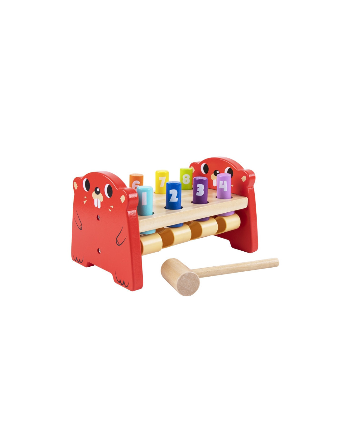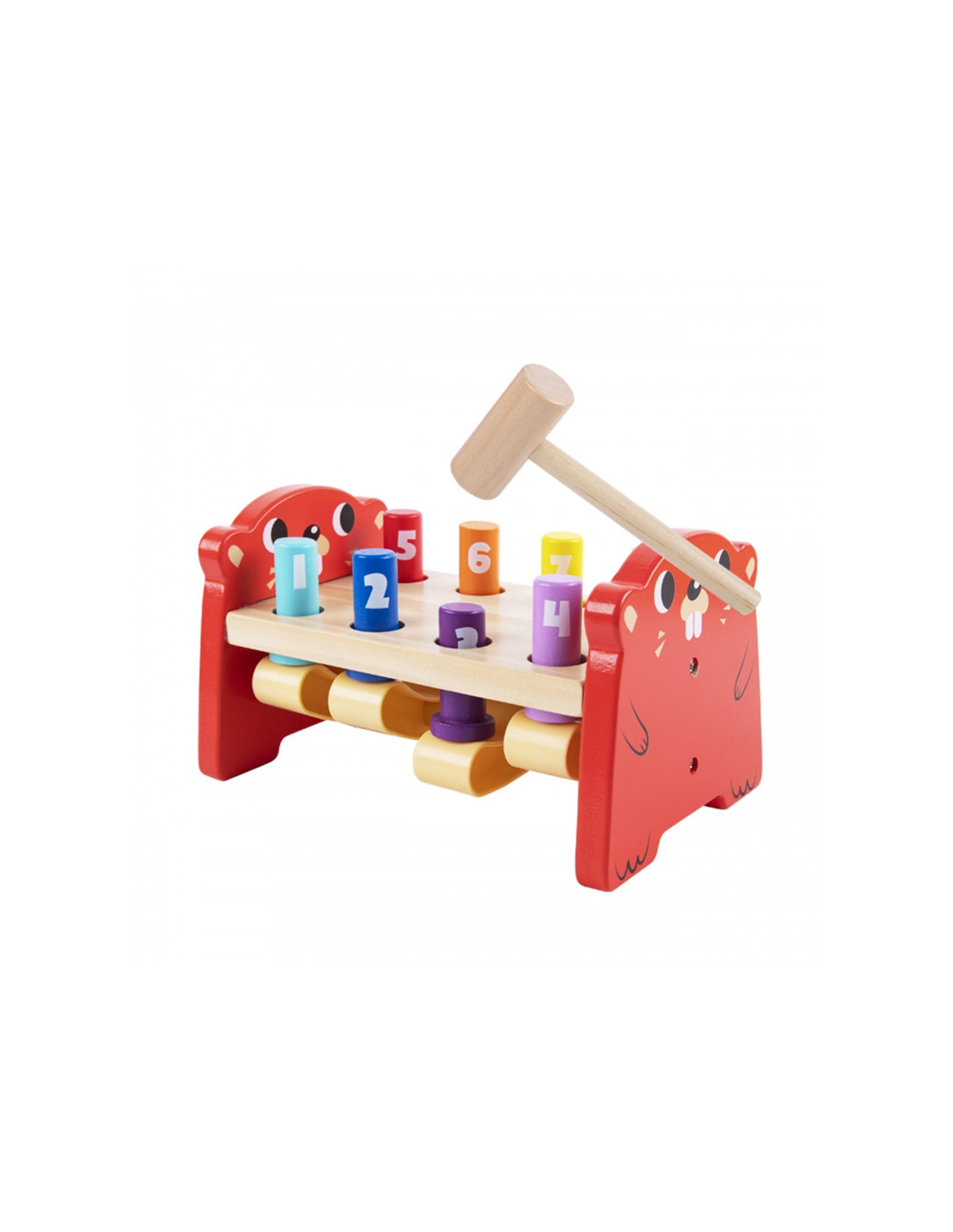 Zabawka składa się z drewnianej ławeczki, 8 kolorowych kołków oraz drewnianego młotka, co nie tylko gwarantuje bezpieczeństwo podczas zabawy, ale także zapewnia trwałość i solidność.