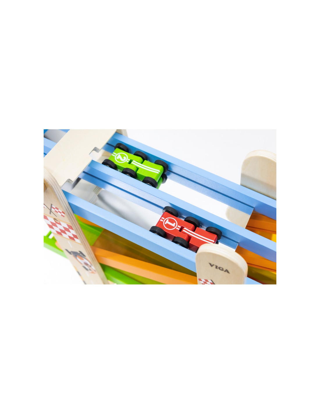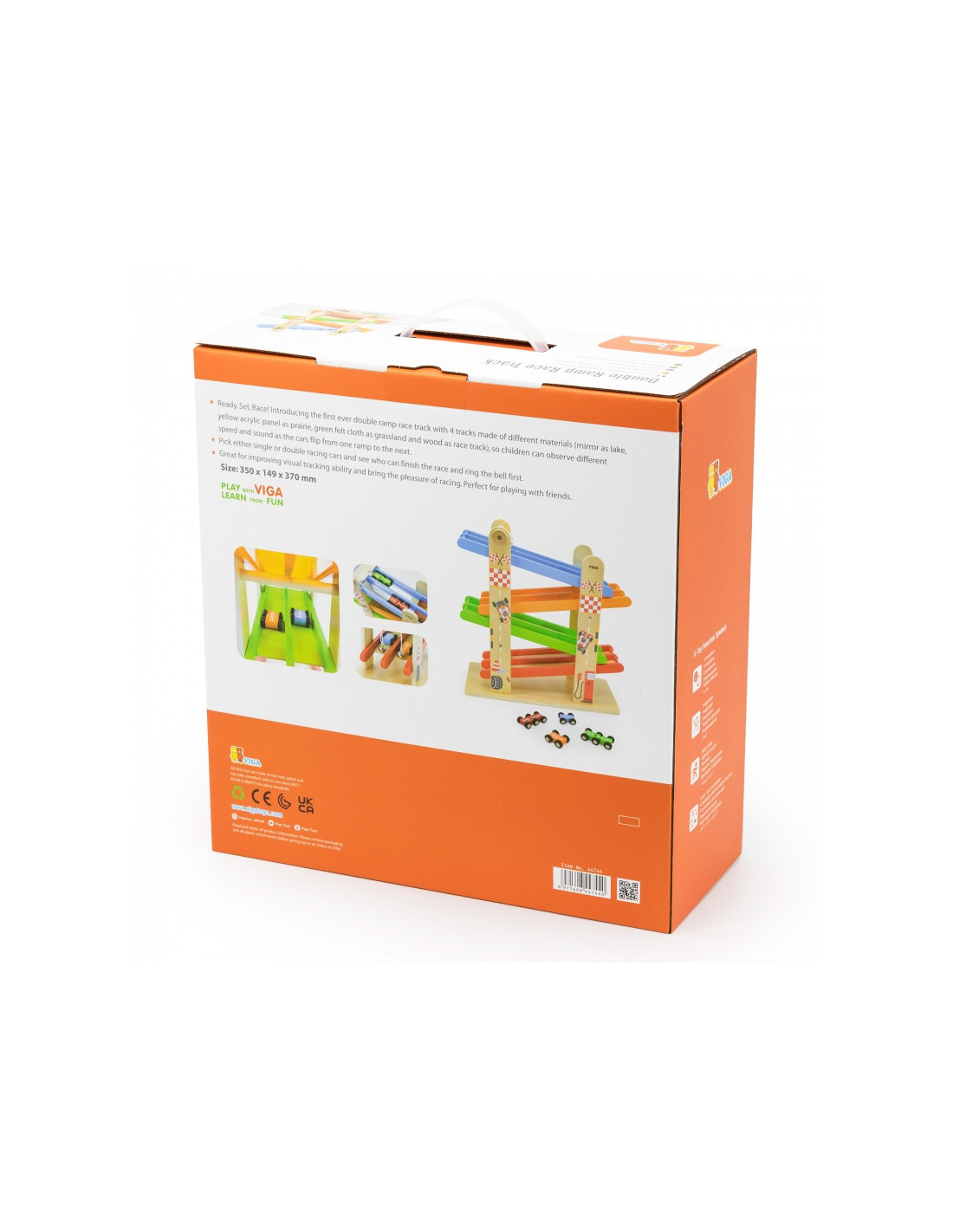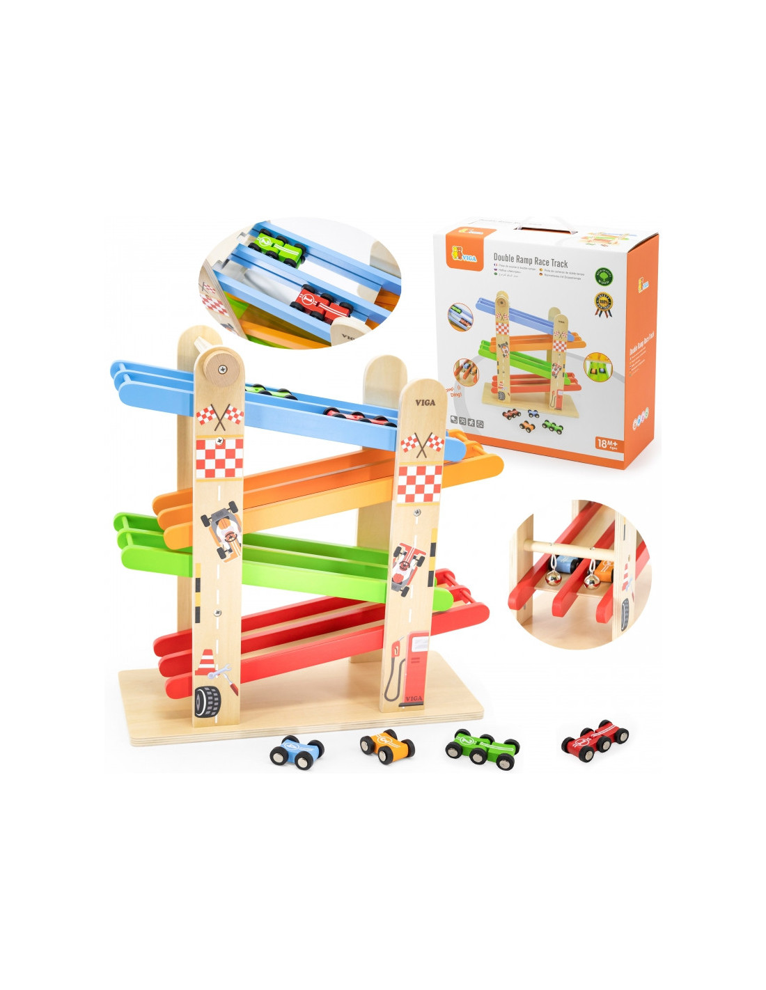 Tor wyścigowy to świetna zabawka dla każdego małego amatora wyścigów. Niepowtarzalny design oraz trwałość wykonania. To idealne uzupełnienie każdego dziecięcego pokoju. Dwa tory to jeszcze więcej zabawy w tej popularnej zabawce - dzieci mogą się bawić się ze sobą robiąc wyścigi dwóch samochodzików naraz! Na mecie czekają dzwoneczki, które zadzwonią wraz z dotarciem pojazdów na końcu toru. W zestawie znajdziemy dwa rodzaje czterech samochodzików: dwa czterokołowe oraz dwa sześciokołowe urozmaicą zabawę i przedstawią w formie zabawy zasady działania praw fizyki. Produkt został wykonany z myślą o małych rączkach dziecka. Brak ostrych krawędzi sprawia, ze jest bezpieczny dla malucha. Kolory przyciągną wzrok każdego dziecka i sprawią, że zabawy nie będzie końca. Gotowi? Start! Ciekawe kto wygra ten wyścig.