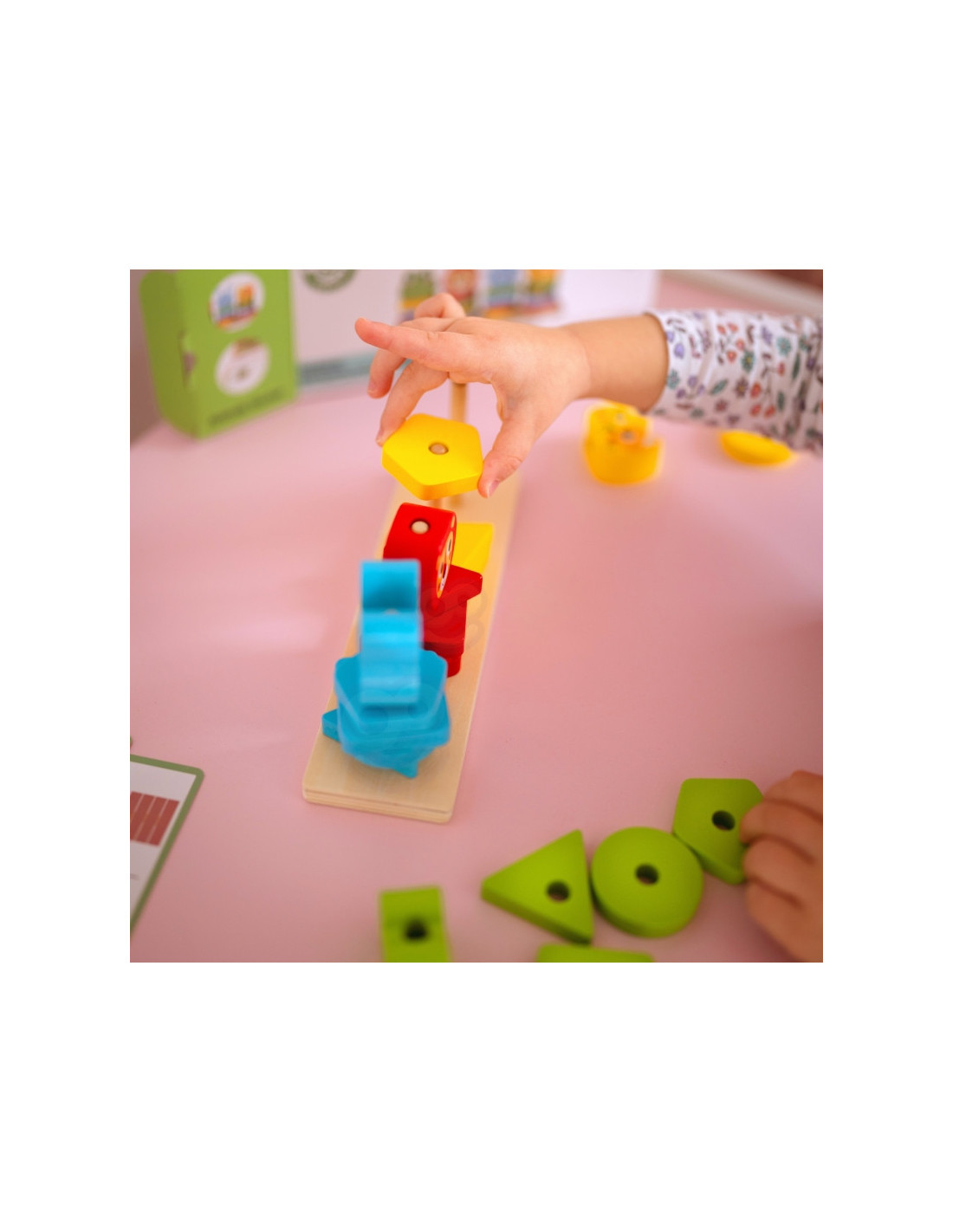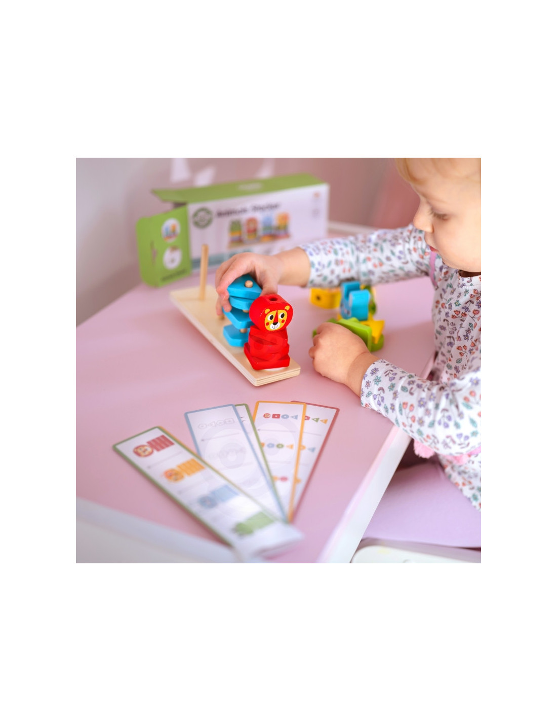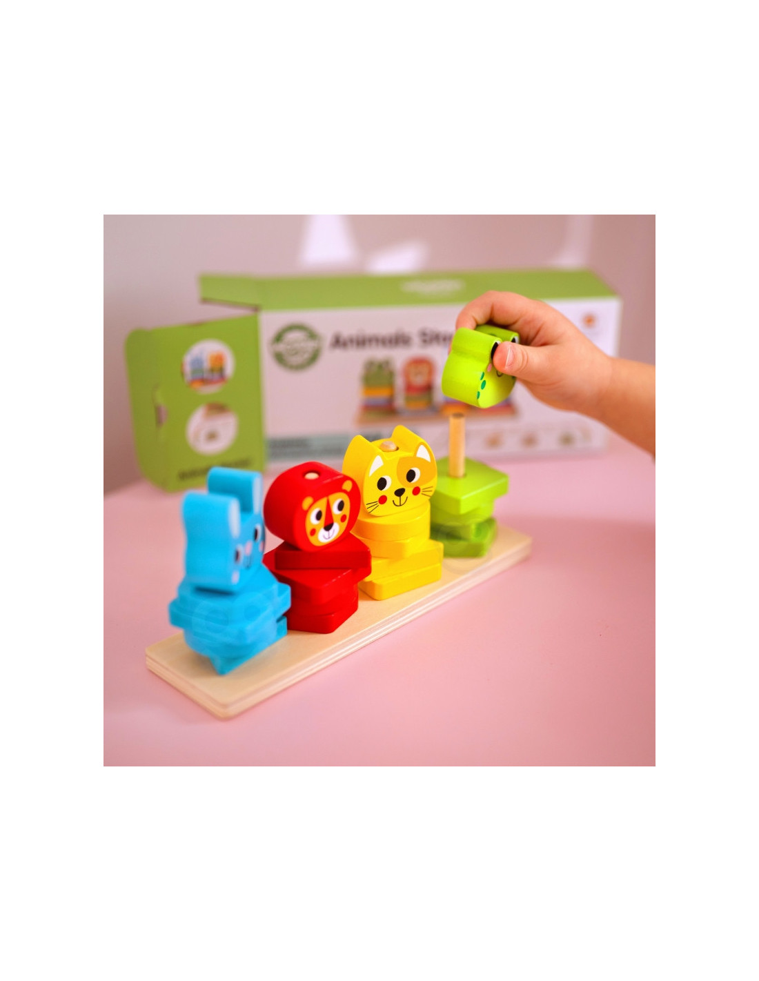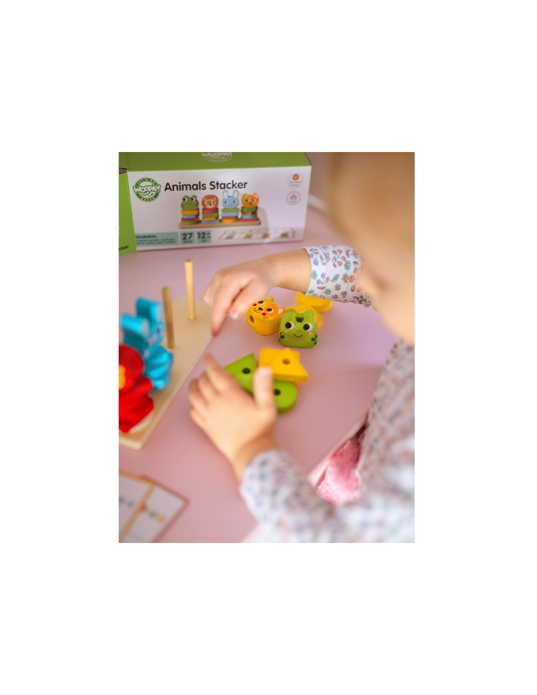 - - "mała motorykę" - manipulowanie klockami, układanie ich na podstawce oraz łączenie zwierzątek wymaga precyzyjnych ruchów dłoni i palców, co wzmacnia umiejętności manualne i koordynację