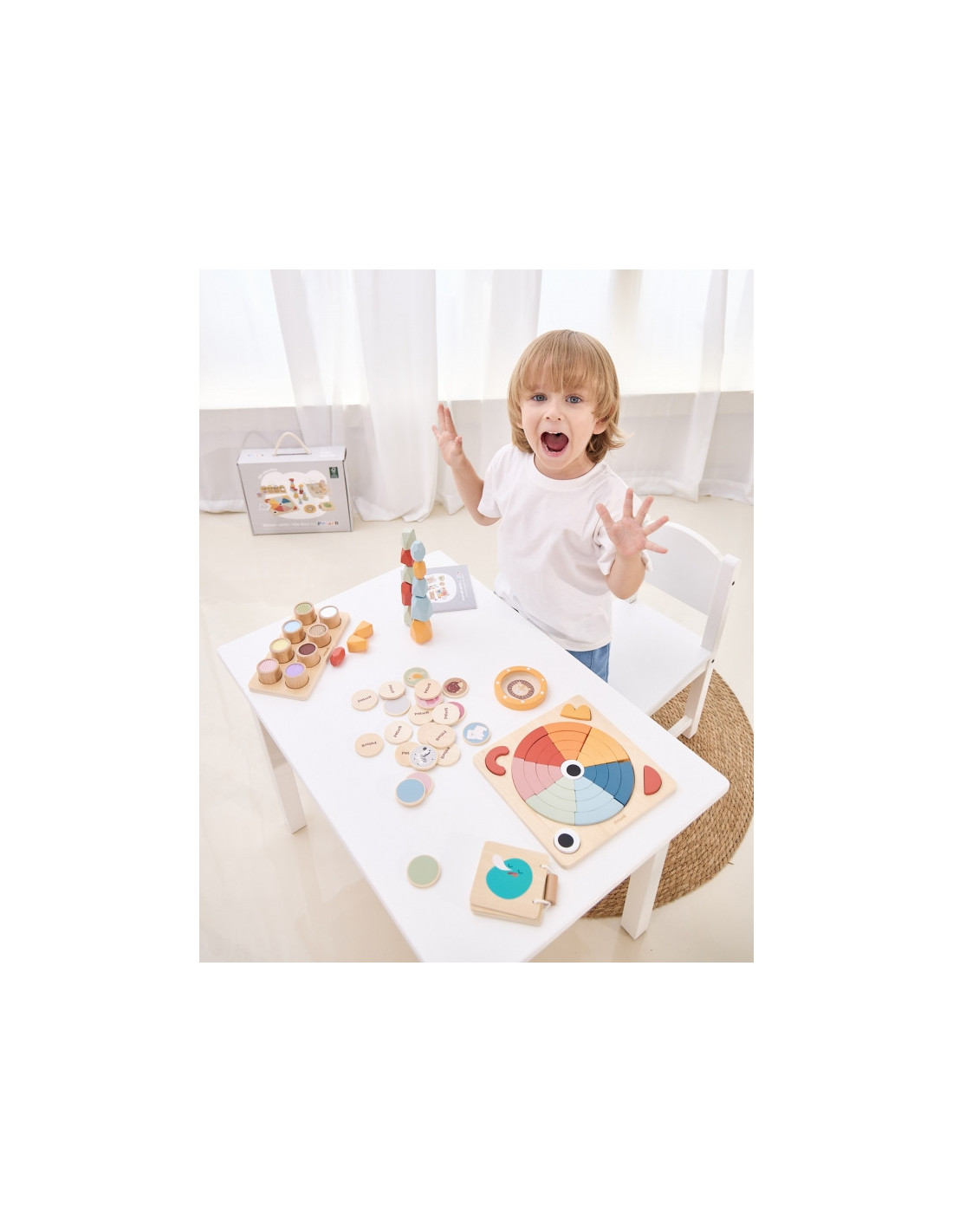 - drewniana książeczka (emocje) – wprowadzająca dzieci w świat emocji, ucząca o 8 podstawowych uczuciach: spokoju, radości, smutku, złości, miłości, strachu, zaskoczenia i zmęczenia