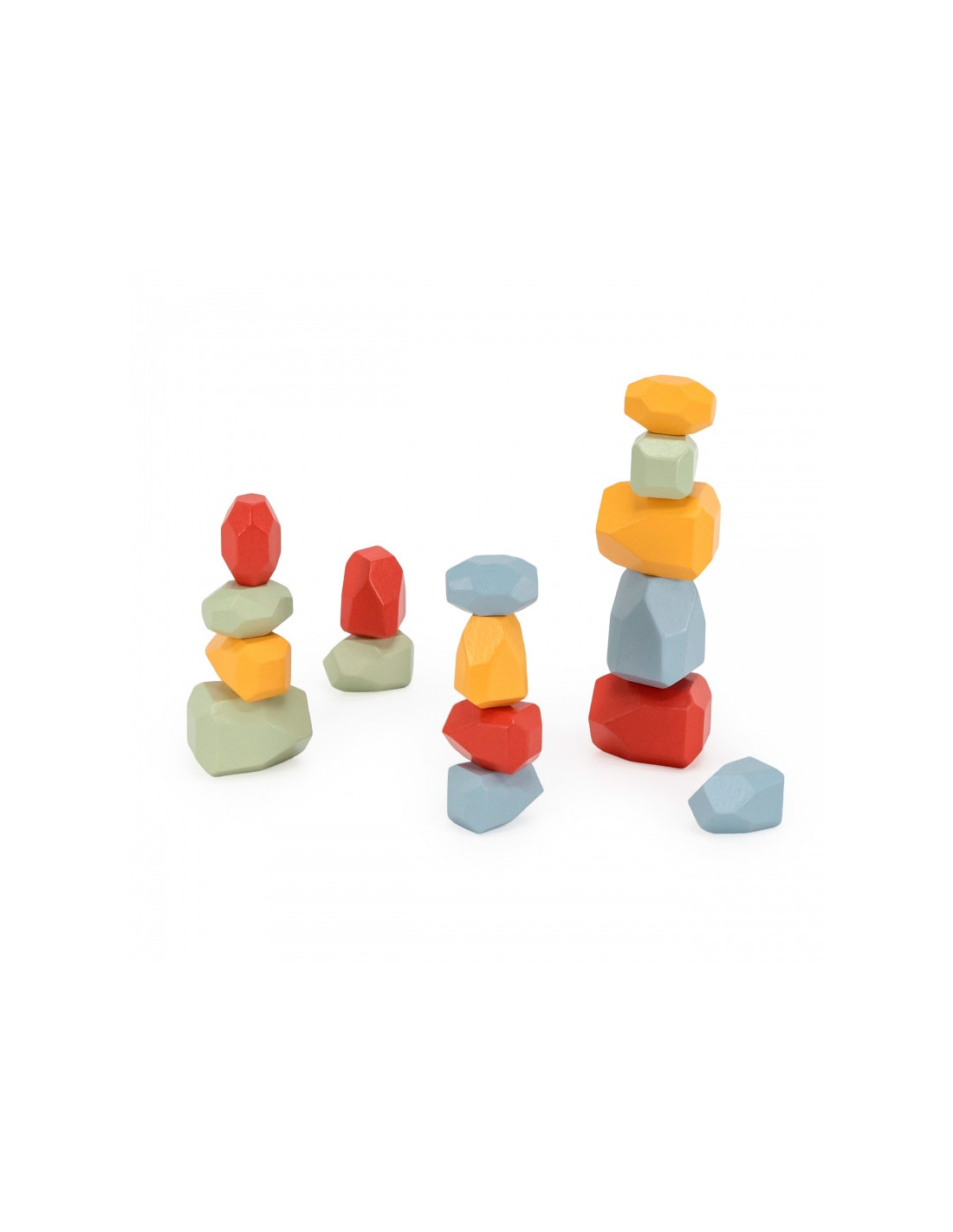 - kolorowe kamienie – pozwalające dzieciom na kreatywne zabawy poprzez balansowanie i budowanie, a także wprowadzające w świat ułamków i kolorów