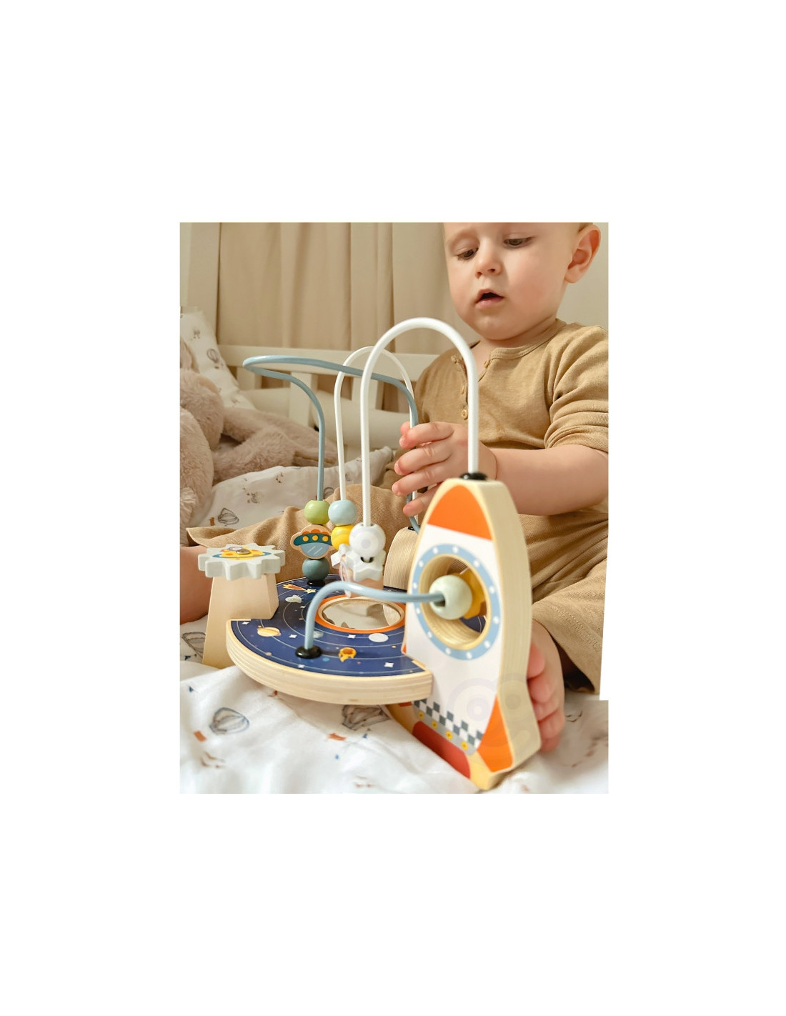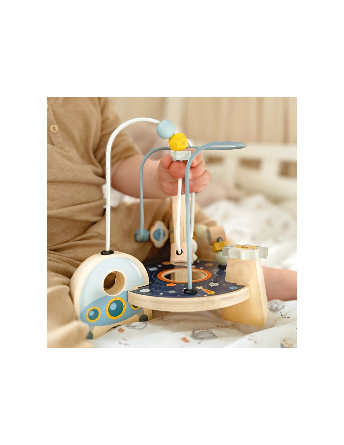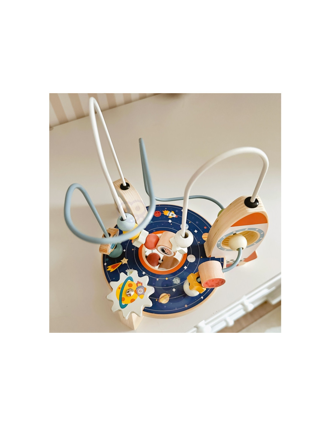 - - Ruchome elementy: Koraliki, gwiazdki i planety na pętlach, które dziecko może przesuwać