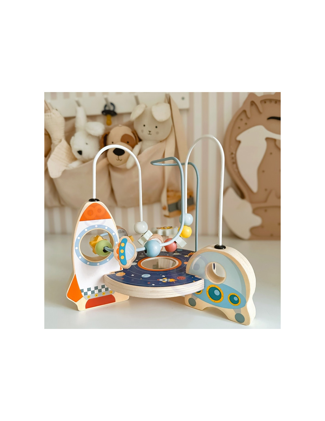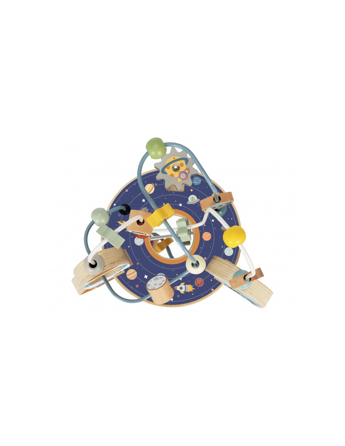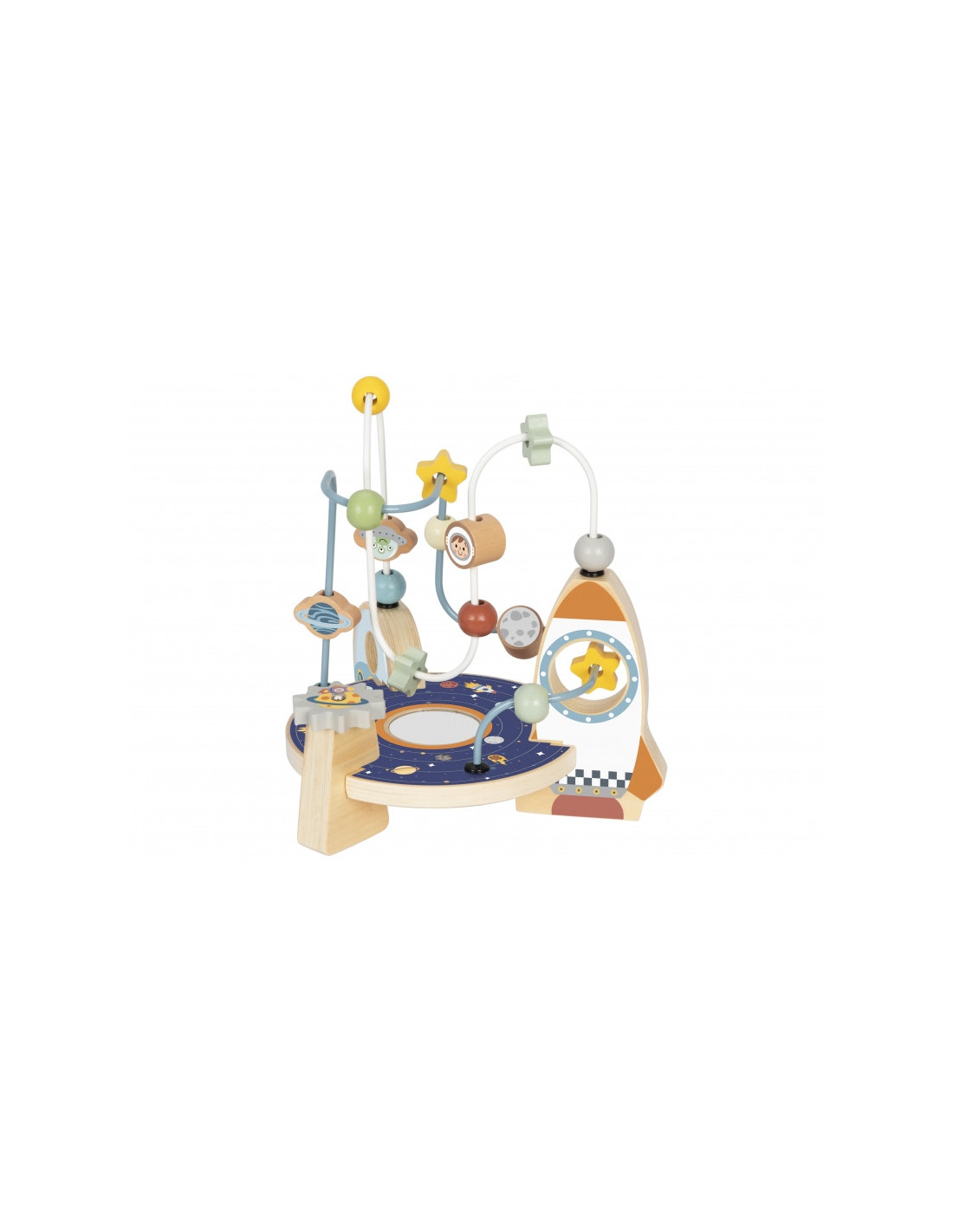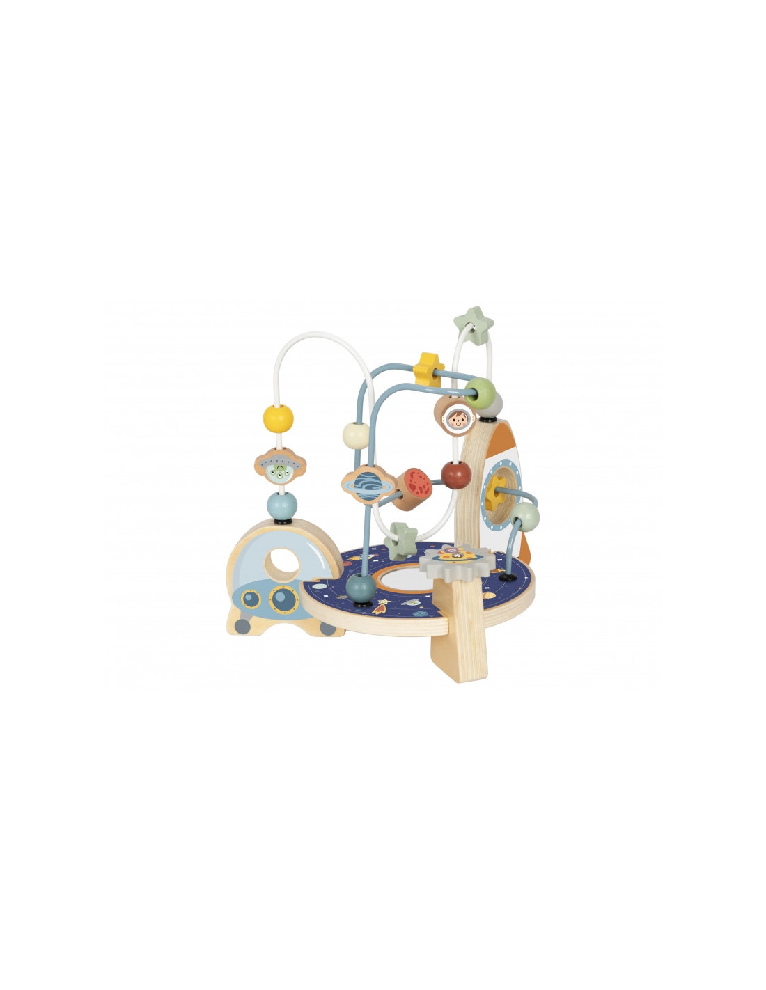 - - Ruchome elementy: Koraliki, gwiazdki i planety na pętlach, które dziecko może przesuwać
