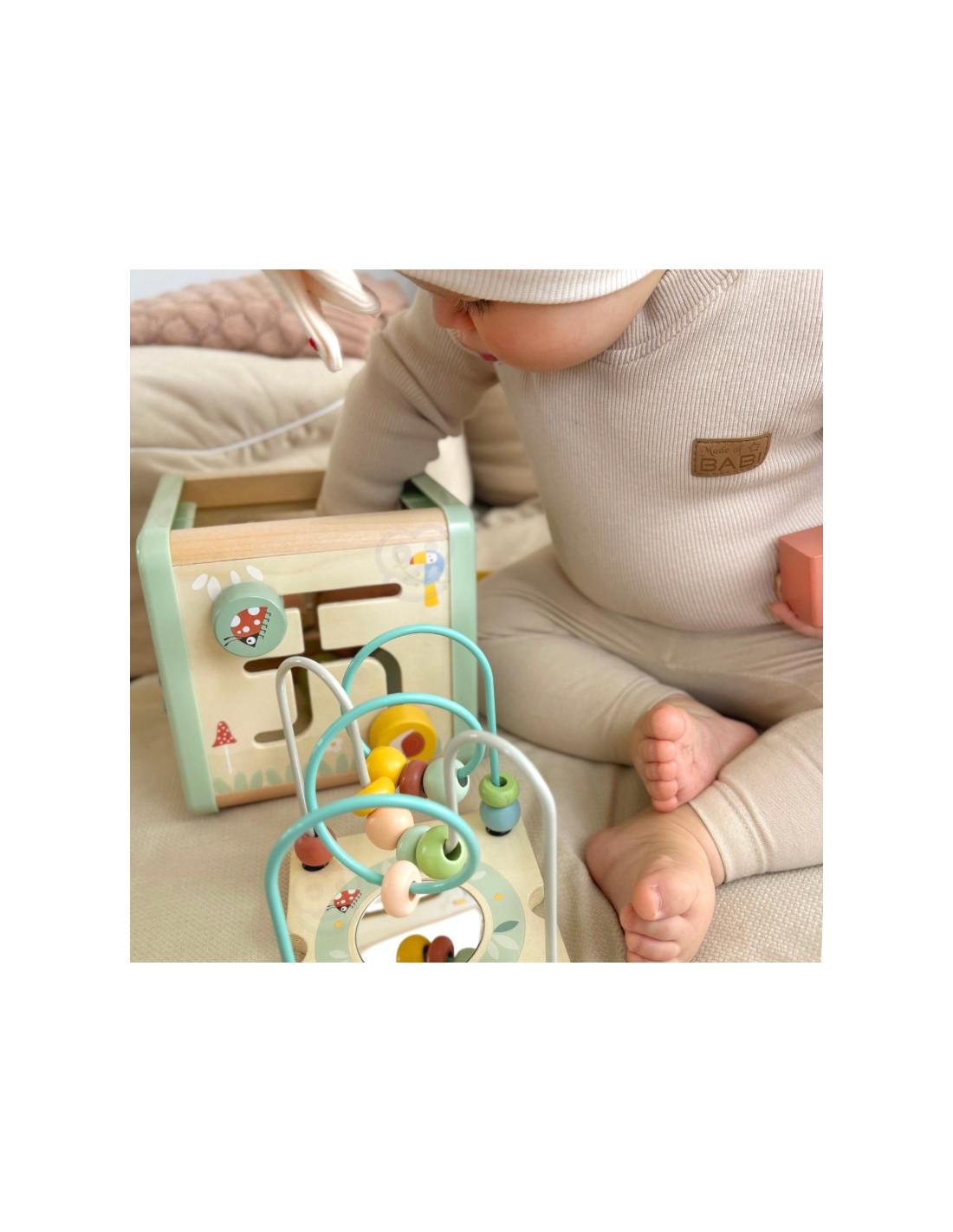 - - Labirynt to pętla motoryczna z kolorowymi koralikami do przesuwania oraz lusterkiem, która pomaga dziecku trenować sprawność rączek. Przeplatając koraliki przez zakrzywione rurki, maluch musi wykonać odpowiednie ruchy, aby działania odniosły sukces.