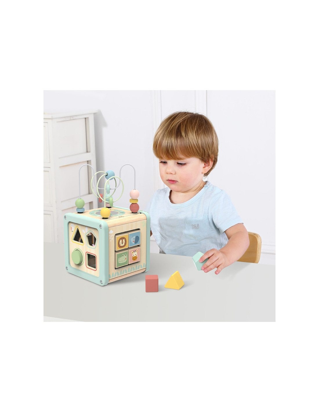Drewniana Kostka Aktywności od marki WOOPIE GREEN to fantastyczny zestaw edukacyjny, który rozweseli malucha i pomoże w nauce podstawowych umiejętności. Dzięki wielostronnym panelom, które oferują różnorodne zabawy, dziecko będzie mogło odkrywać zębatki, klocki, sortery, suwaki, a także labirynt z koralikami. Wszystko to w delikatnych pastelowych kolorach, które przyciągają wzrok i zachęcają do zabawy.