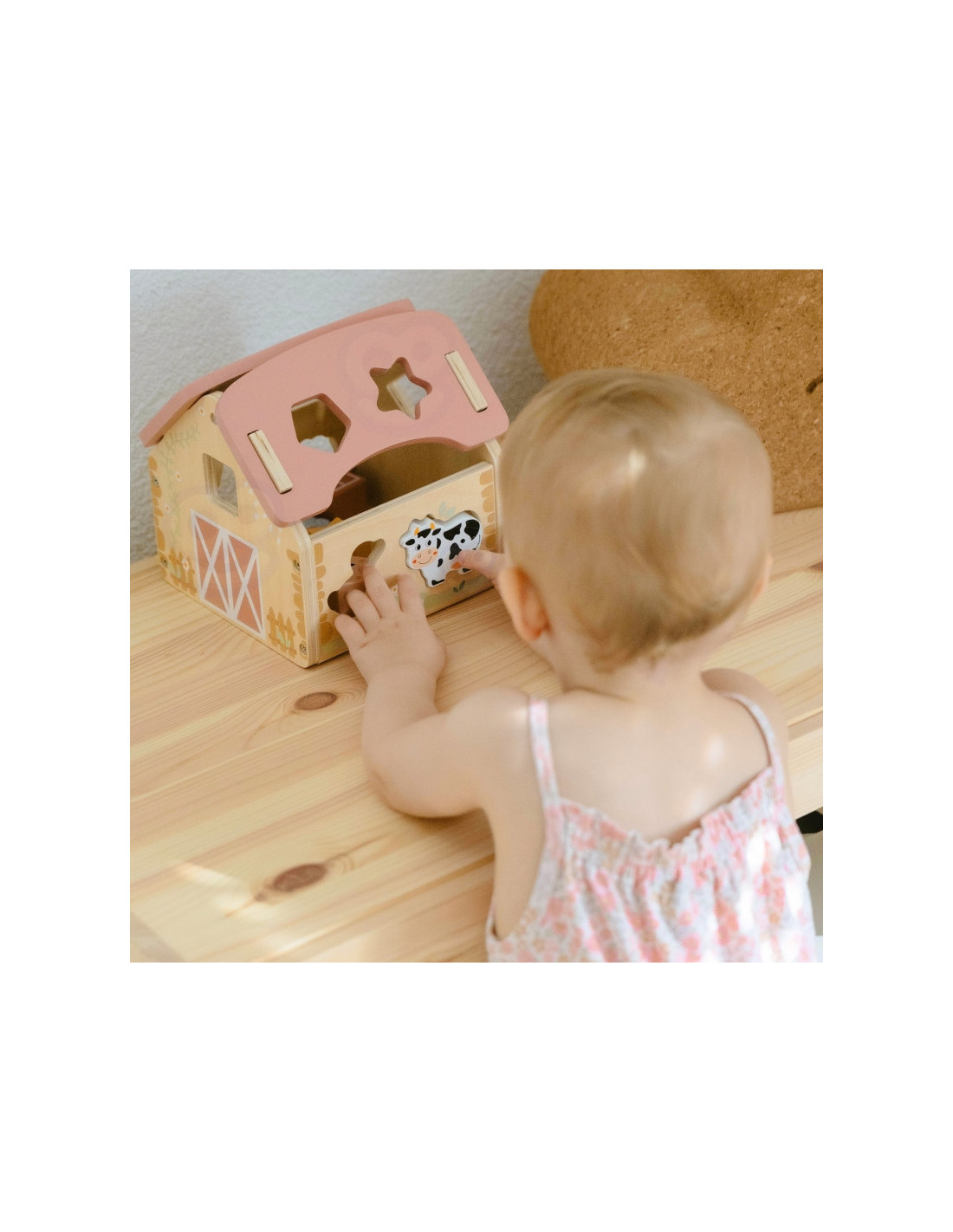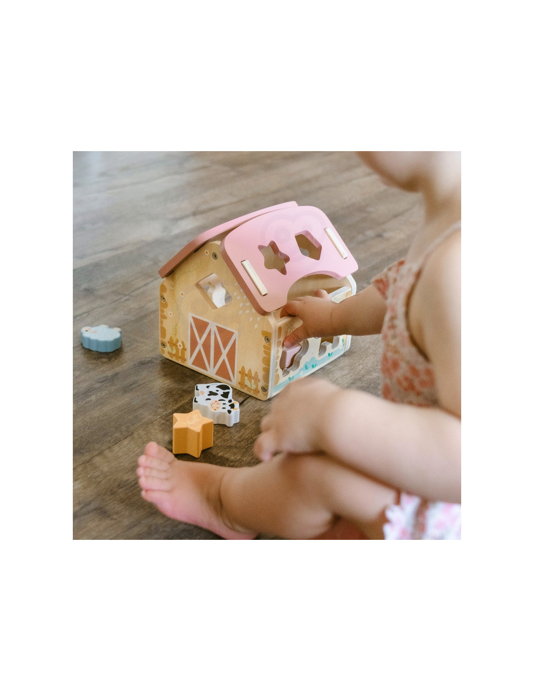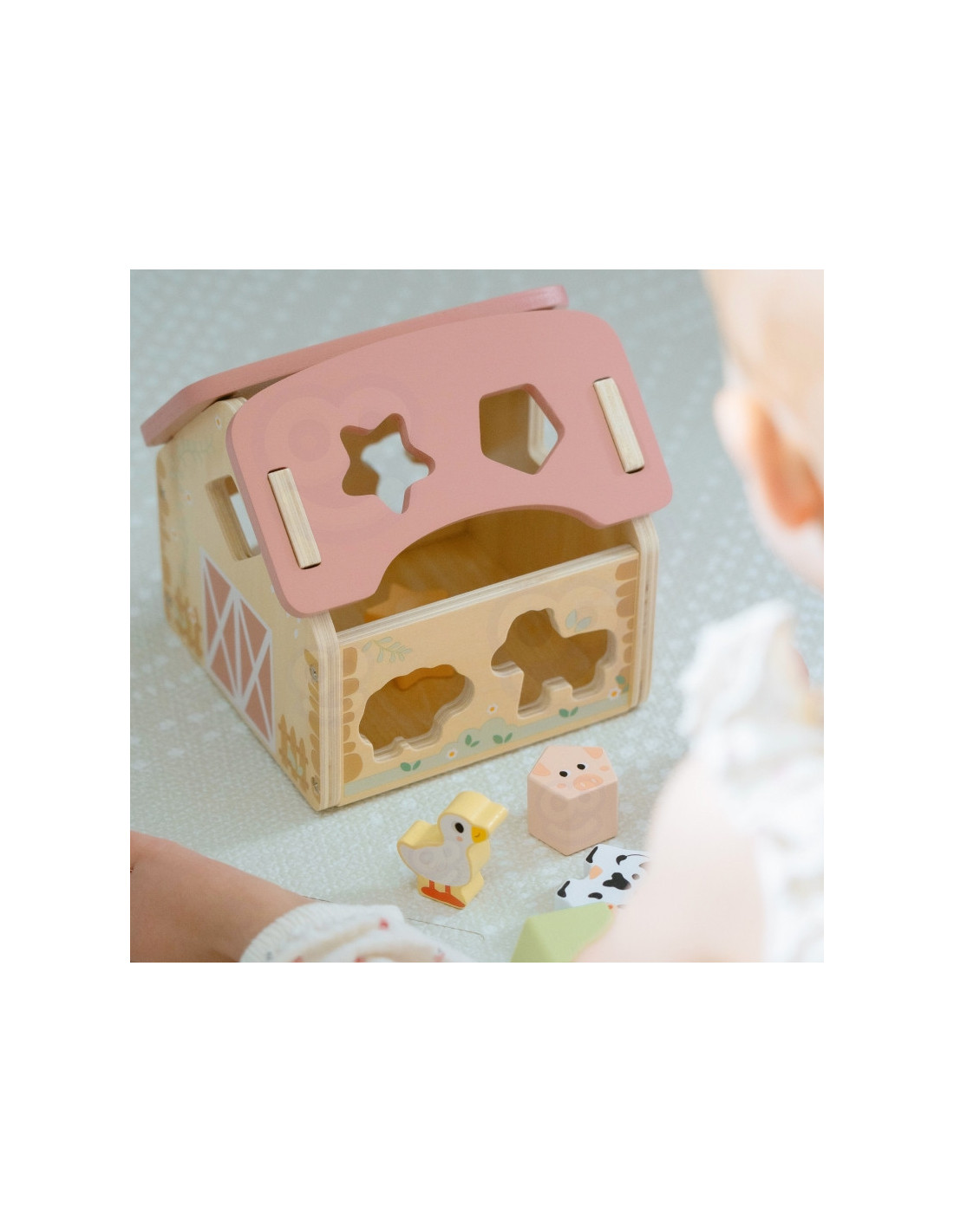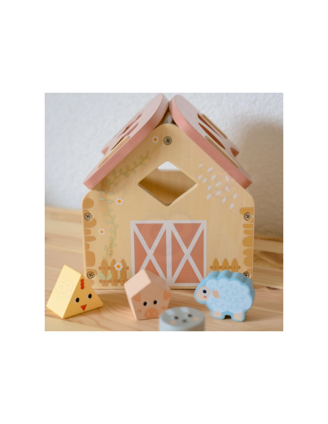 Zabawa polega na dopasowywaniu drewnianych zwierzątek i klocków do odpowiednich otworów w ścianach stodoły. Maluch ćwiczy przy tym koordynację wzrokowo-ruchową, cierpliwość i koncentrację. Uczy się przez działanie – a to najlepszy sposób na trwałą naukę.