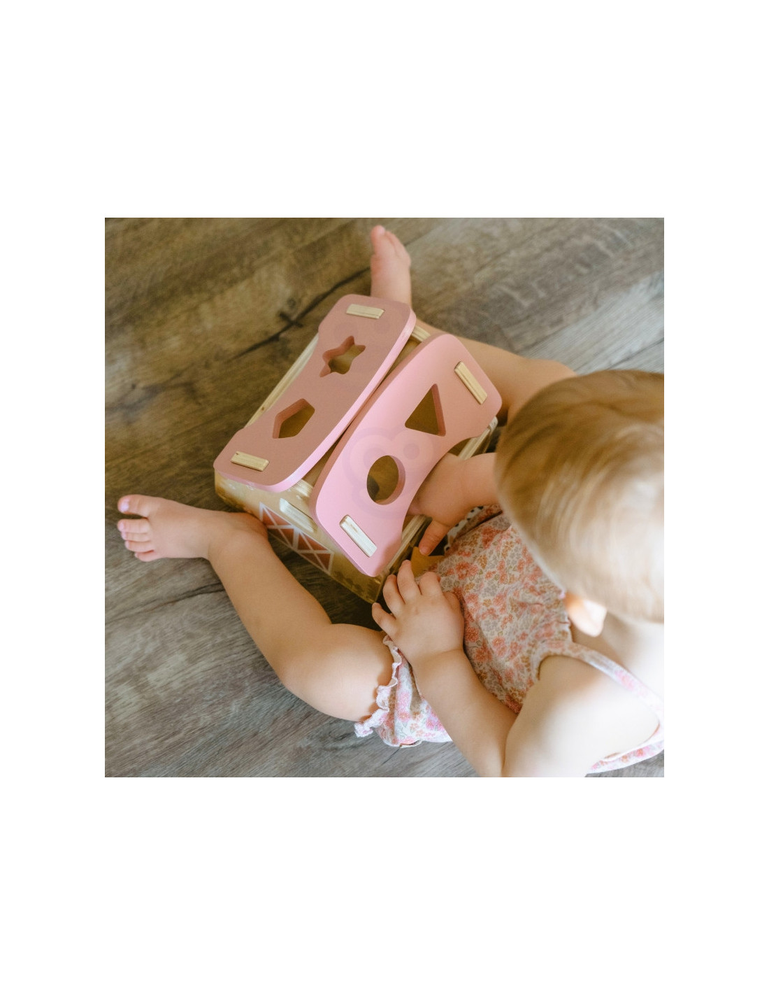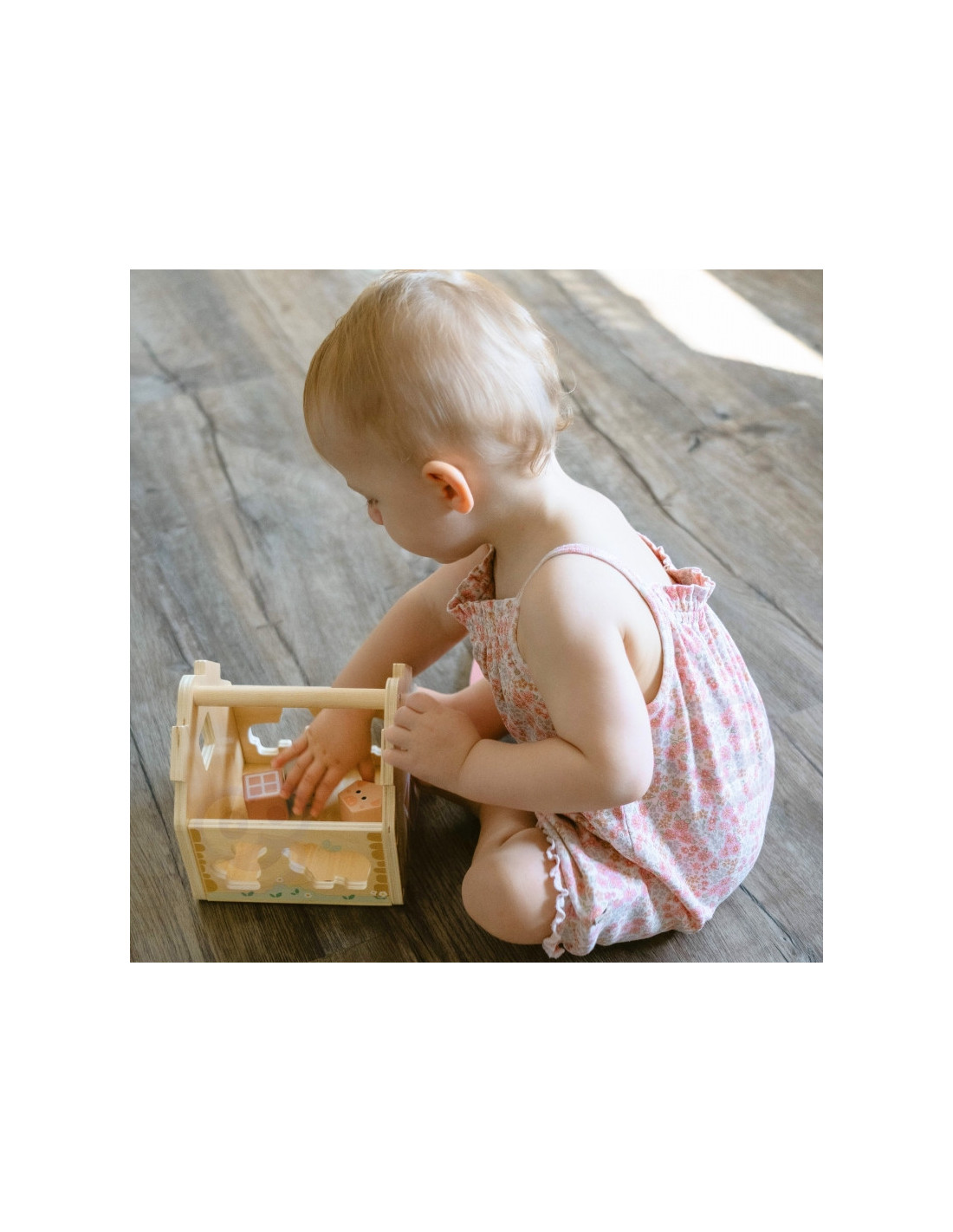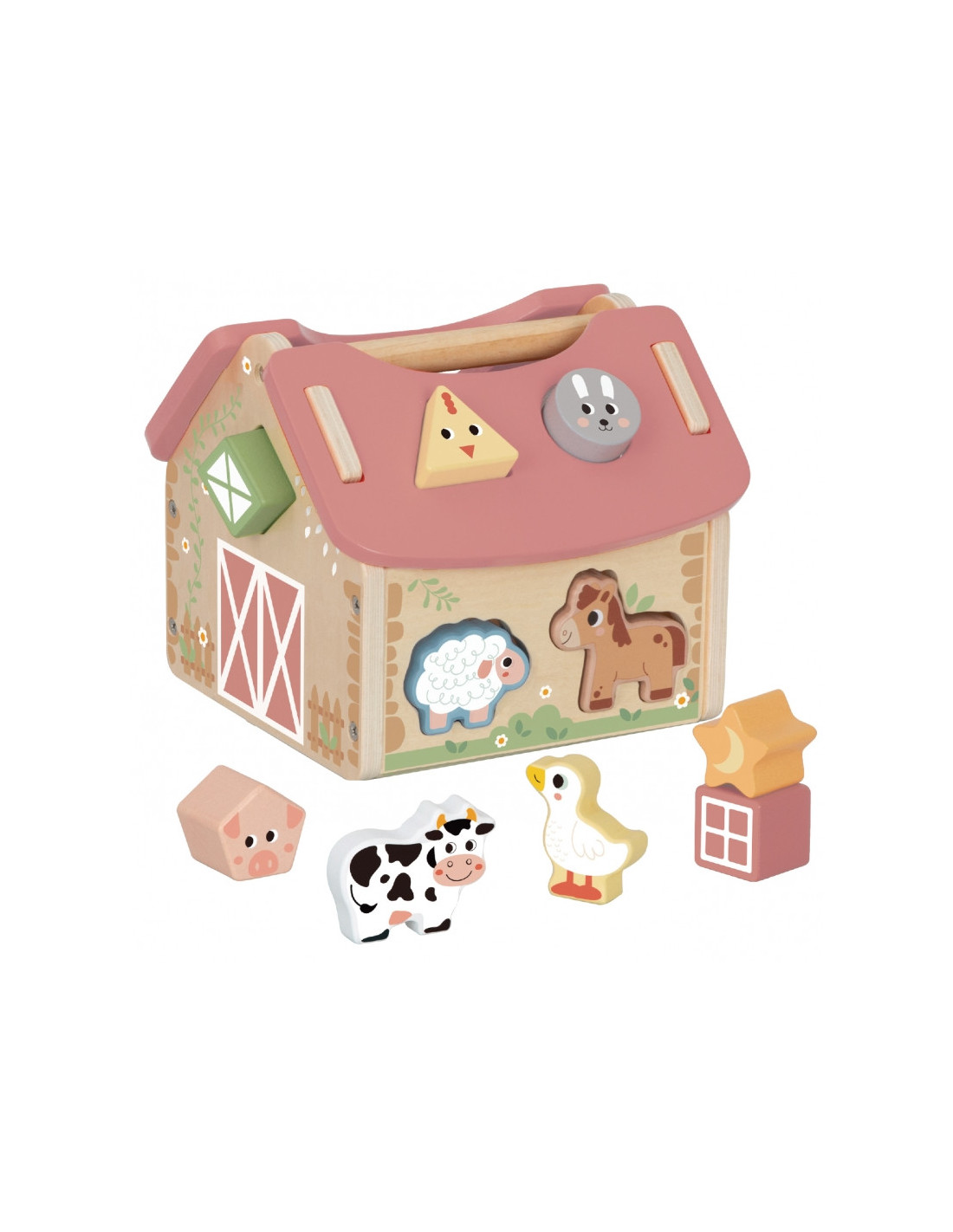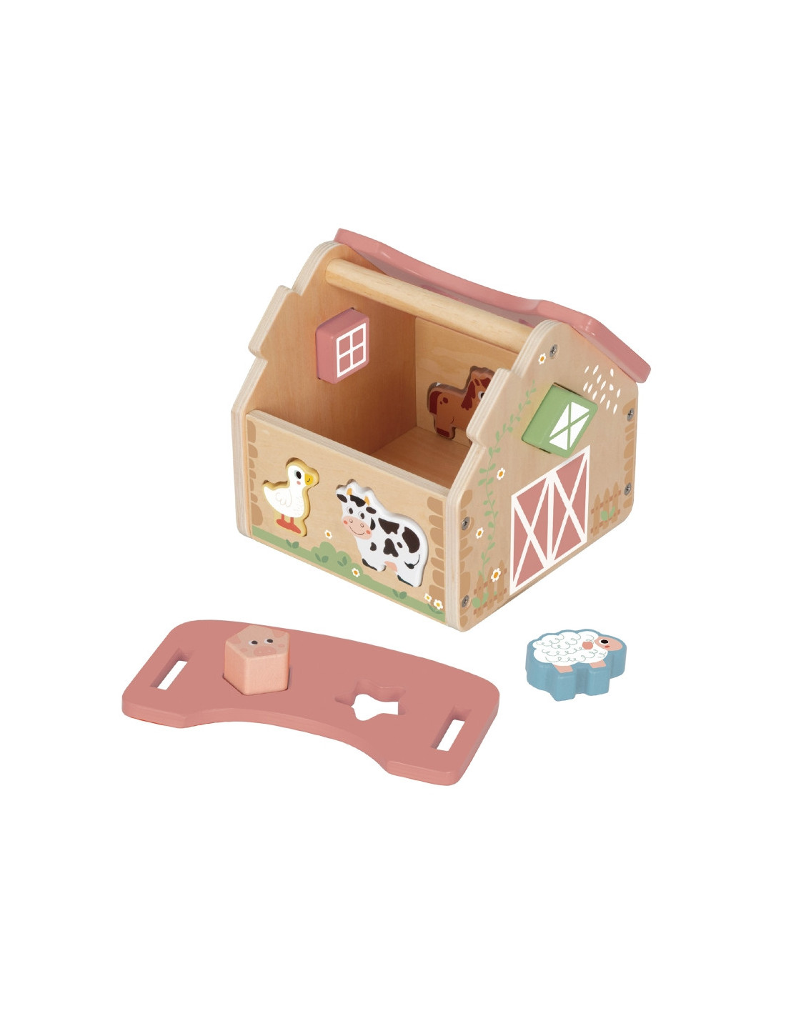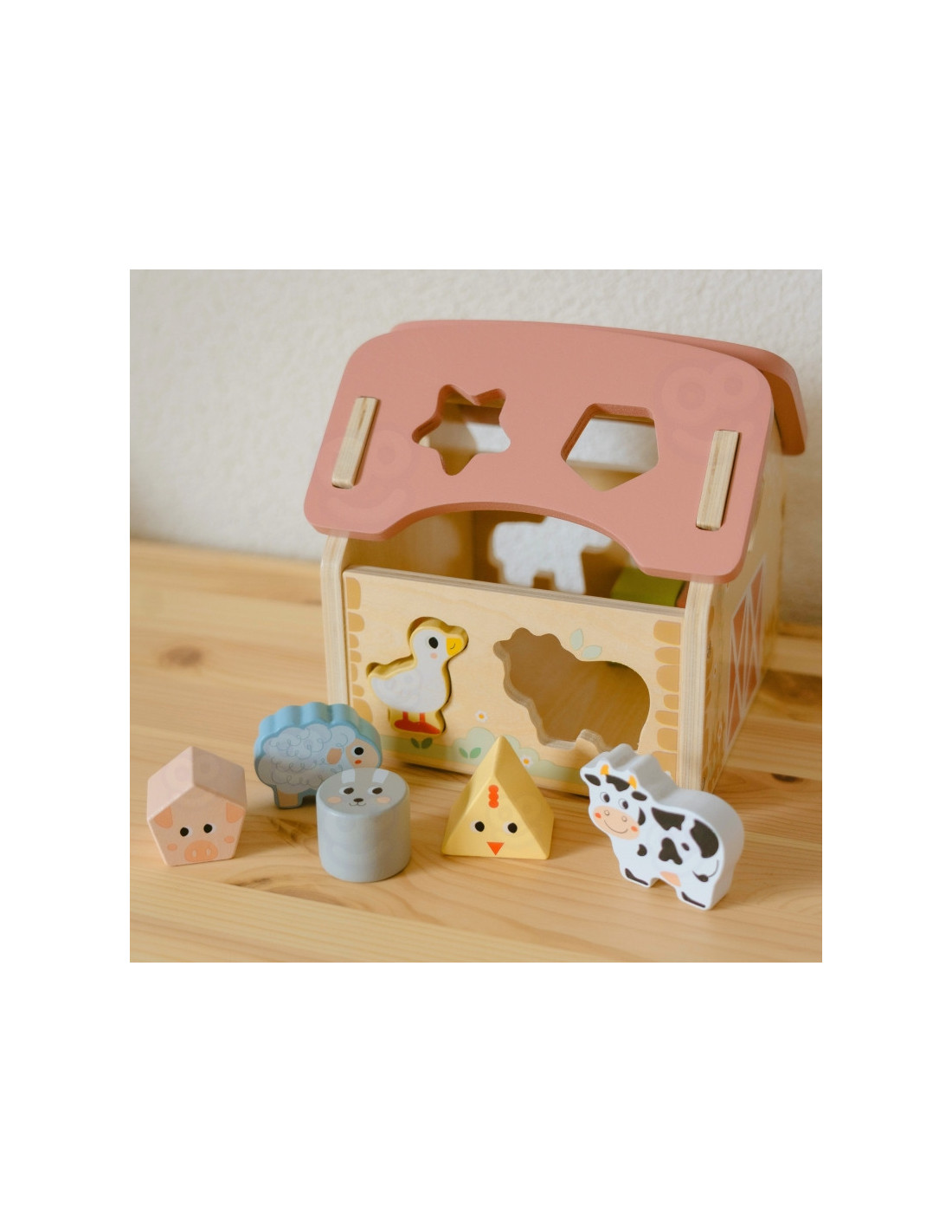 Zabawa polega na dopasowywaniu drewnianych zwierzątek i klocków do odpowiednich otworów w ścianach stodoły. Maluch ćwiczy przy tym koordynację wzrokowo-ruchową, cierpliwość i koncentrację. Uczy się przez działanie – a to najlepszy sposób na trwałą naukę.
