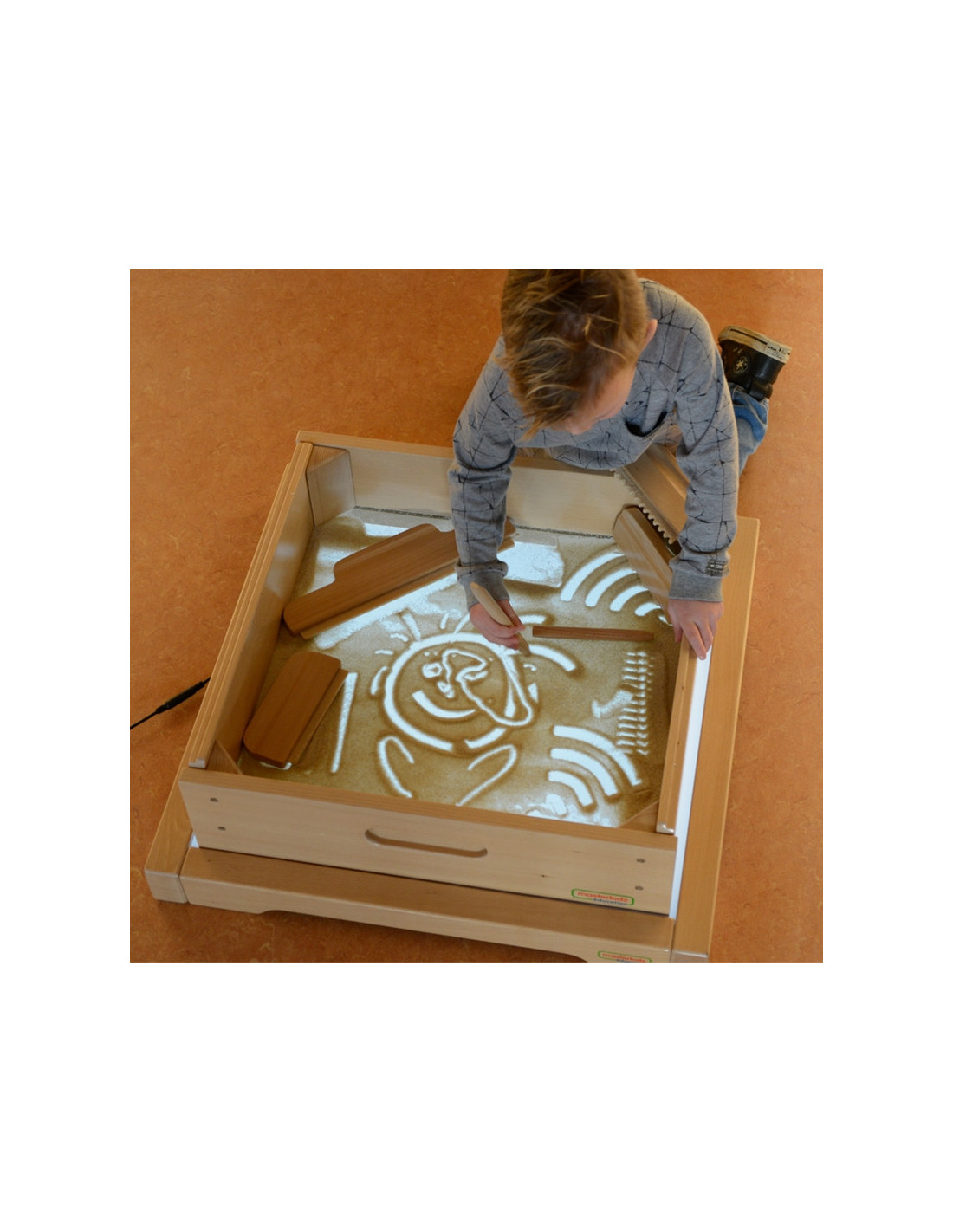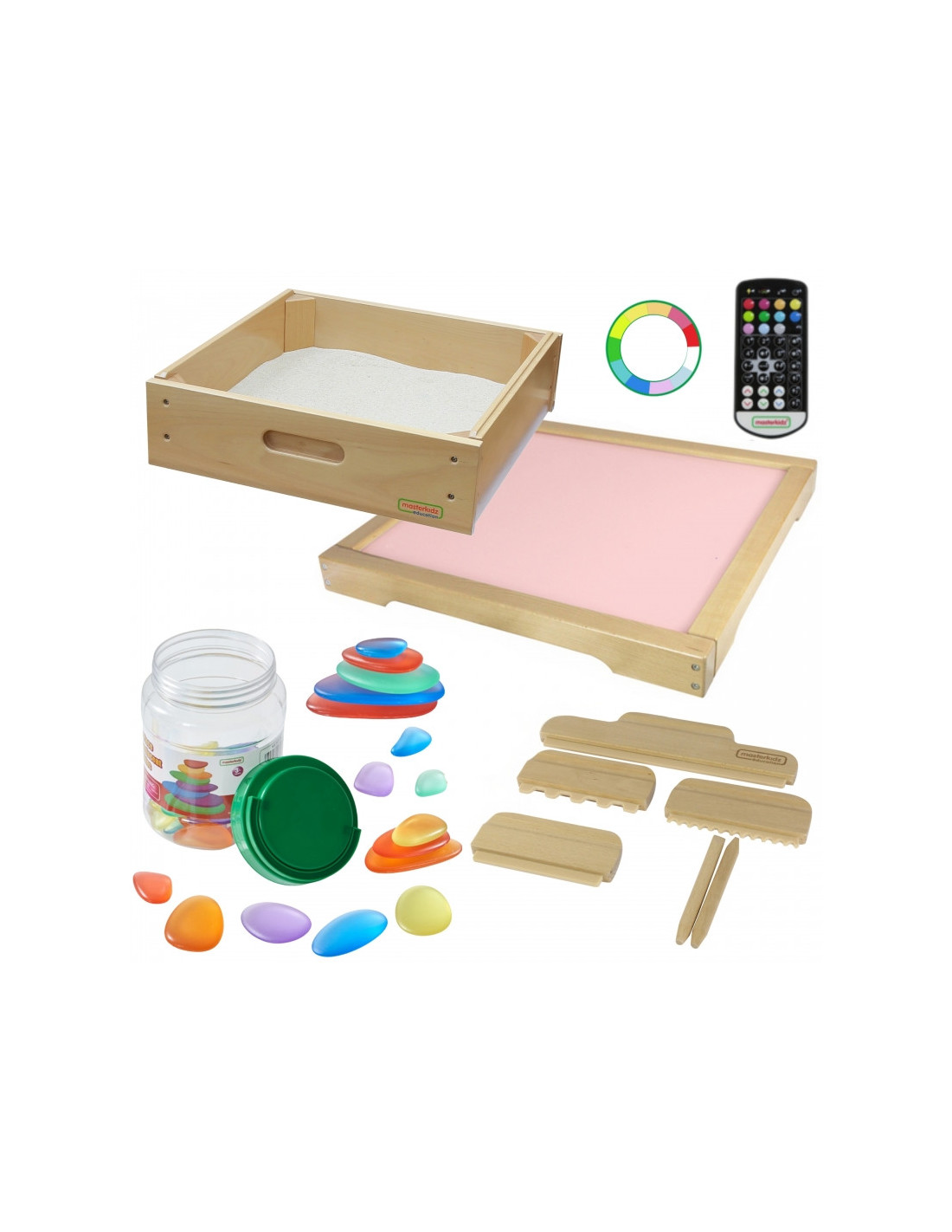 Panel Skrzynia LED Sensoryczna Masterkidz to solidna, drewniana skrzynka z podświetleniem LED emitującym kolorowe światło z możliwością dowolnej konfiguracji dzięki dołączonemu pilotowi, użytkownik może ustawić panel na jeden z 11 zaprogramowanych kolorów, lub ręcznie zmienić emitowany kolor bazując na podstawowych barwach światła: czerwonej, zielonej i niebieskiej. Urządzenie pozwala także na płynne przechodzenie pomiędzy kolorami oraz zapamiętywanie wybranych barw do ponownego użycia. Panel świetlny LED umożliwia różnorodne aktywności wspierające rozwój kreatywności, takie jak mieszanie kolorów czy nauka poprzez system STEM. Efektowne rezultaty uzyskuje się, gdy światło przenika przez różne materiały – liście, papier, tackę z piaskiem czy przezroczystą wodą. Panel idealnie współgra z dołączoną kwadratową tacką do zabawy piaskiem oraz kolorowymi kamyczkami, które dodatkowo wzbogacają doznania sensoryczne.