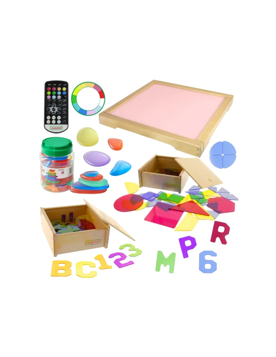Masterkidz LED sensorinė dėžutė – tai tvirta medinė dėžutė su LED apšvietimu, skleidžianti spalvingą šviesą. Pridedamas nuotolinio valdymo pultas leidžia vartotojams nustatyti vieną iš 11 iš anksto užprogramuotų spalvų arba rankiniu būdu keisti skleidžiamą spalvą pagal pagrindines šviesos spalvas: raudoną, žalią ir mėlyną. Įrenginys taip pat leidžia sklandžiai pereiti spalvas ir išsaugoti pasirinktas spalvas pakartotiniam naudojimui. LED šviesos plokštė leidžia užsiimti įvairia kūrybine veikla, pavyzdžiui, maišyti spalvas ir mokytis STEM dalykų. Akį traukiantys rezultatai pasiekiami, kai šviesa prasiskverbia pro įvairias medžiagas – lapus, popierių, smėlio padėklą ar skaidrų vandenį. Skydelis puikiai dera su pridedamais spalvingais priedais, kurie praplečia žaidimo ir mokymosi galimybes, leisdami kurti įvairius raštus ir kompozicijas šviesoje.