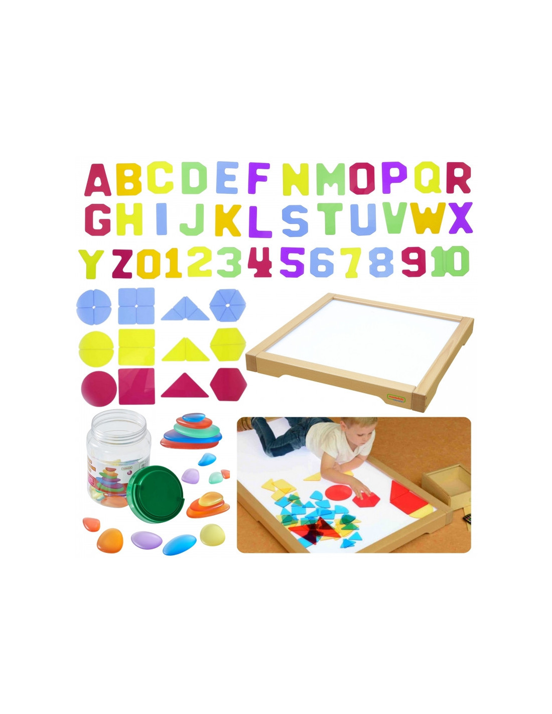 - 4 pakuotės - LED dėžutė: 74 x 74 x 19 (cm) / Spalvoti akmenys: 15 x 13 x 13 (cm) / Skaičiai ir raidės: 24 x 21 x 10 (cm) / Geometrinės figūros: 25 x 22 x 10 (cm)