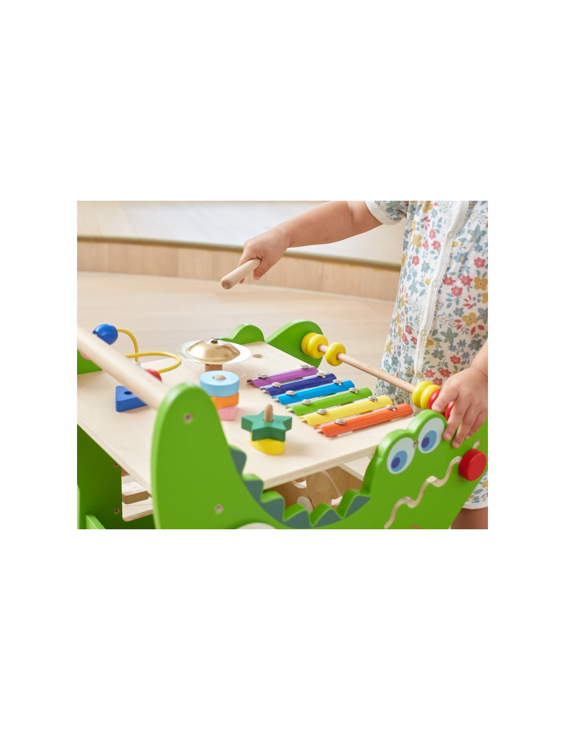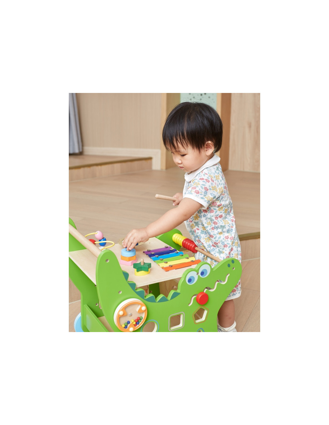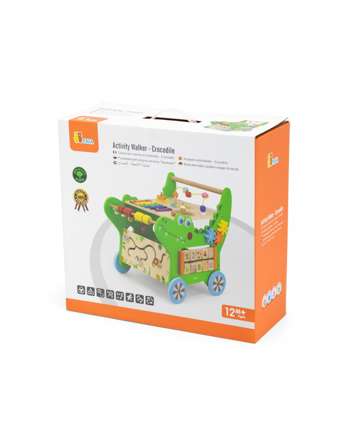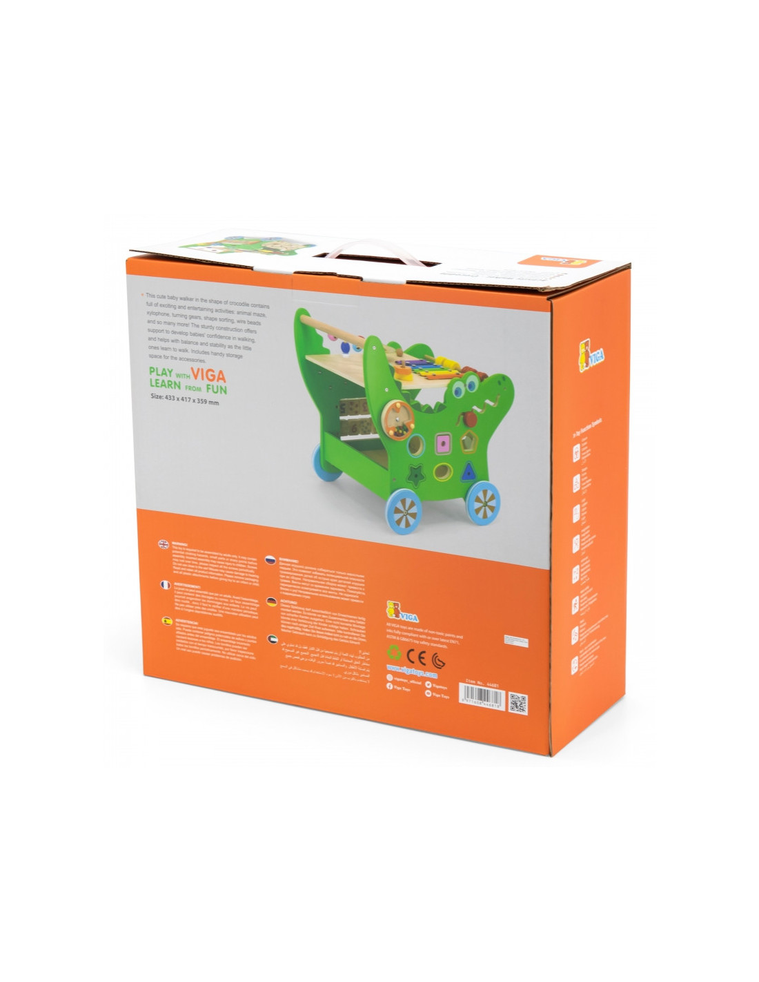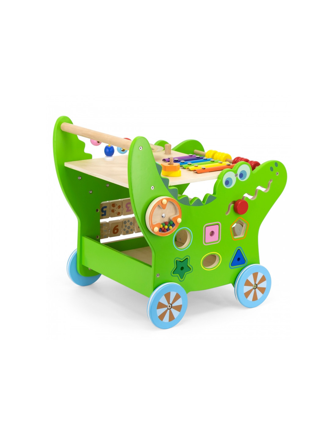 Drewniany Chodzik Krokodylek od marki VIGA zawiera w sobie pełnię ekscytujących aktywności dla malucha: labirynt zwierzątek, ksylofon, koła zębate, sorter kształtów, liczydło i wiele innych. Wytrzymała konstrukcja oferuje stabilne wsparcie, by maluszek pewnie mógł rozpocząć naukę chodzenia i pomaga mu utrzymać równowagę. Korzystając z aktywności zawartych w tym chodziku dziecko będzie mogło rozwijać swoje zdolności manualne, koordynację wzrokowo-ruchową, logikę, a także rozpocznie naukę kształtów, kolorów i liczb. Posiada przestrzeń na trzymanie ulubionych zabawek.