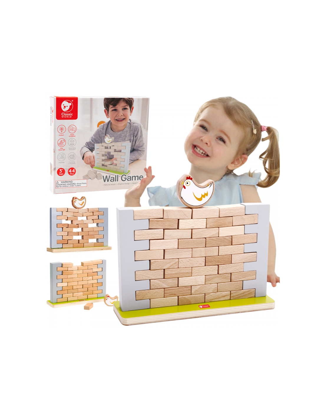 Świetna drewniana gra dla całej rodziny renomowanej marki Classic World, proste zasady, logiczne myślenie i zabawa dla osób w każdym wieku to podstawowe cechy tej gry. Zbuduj ścianę w specjalnie przygotowanych blokach. Na górze ustaw kurę, a następnie wyciągajcie po kolei cegły ze ściany. Kiedy ściana runie gra się kończy. Podczas zabawy maluch nauczy się koncentracji, strategii i rozwiązywania problemów, a także poprawi koordynację ręka-oko.