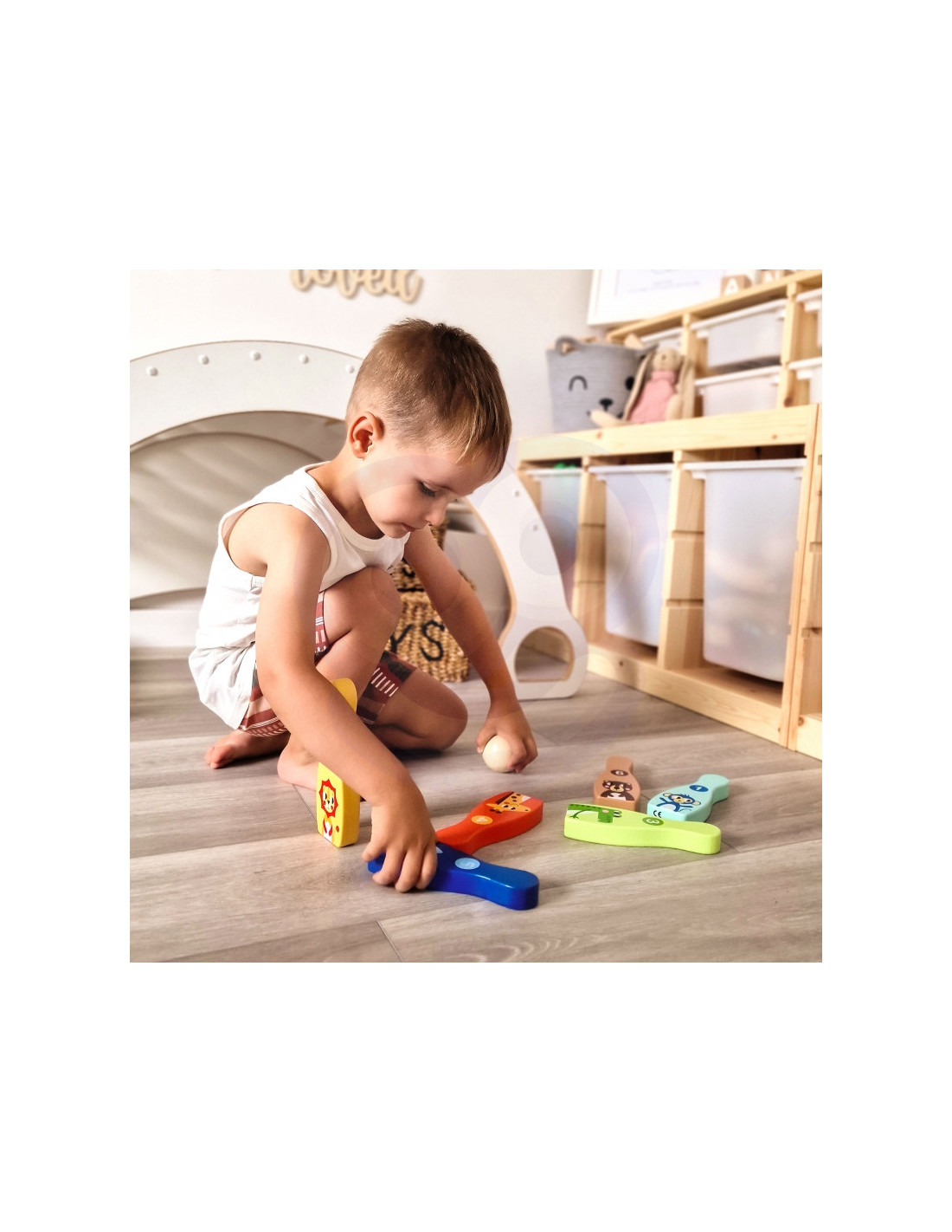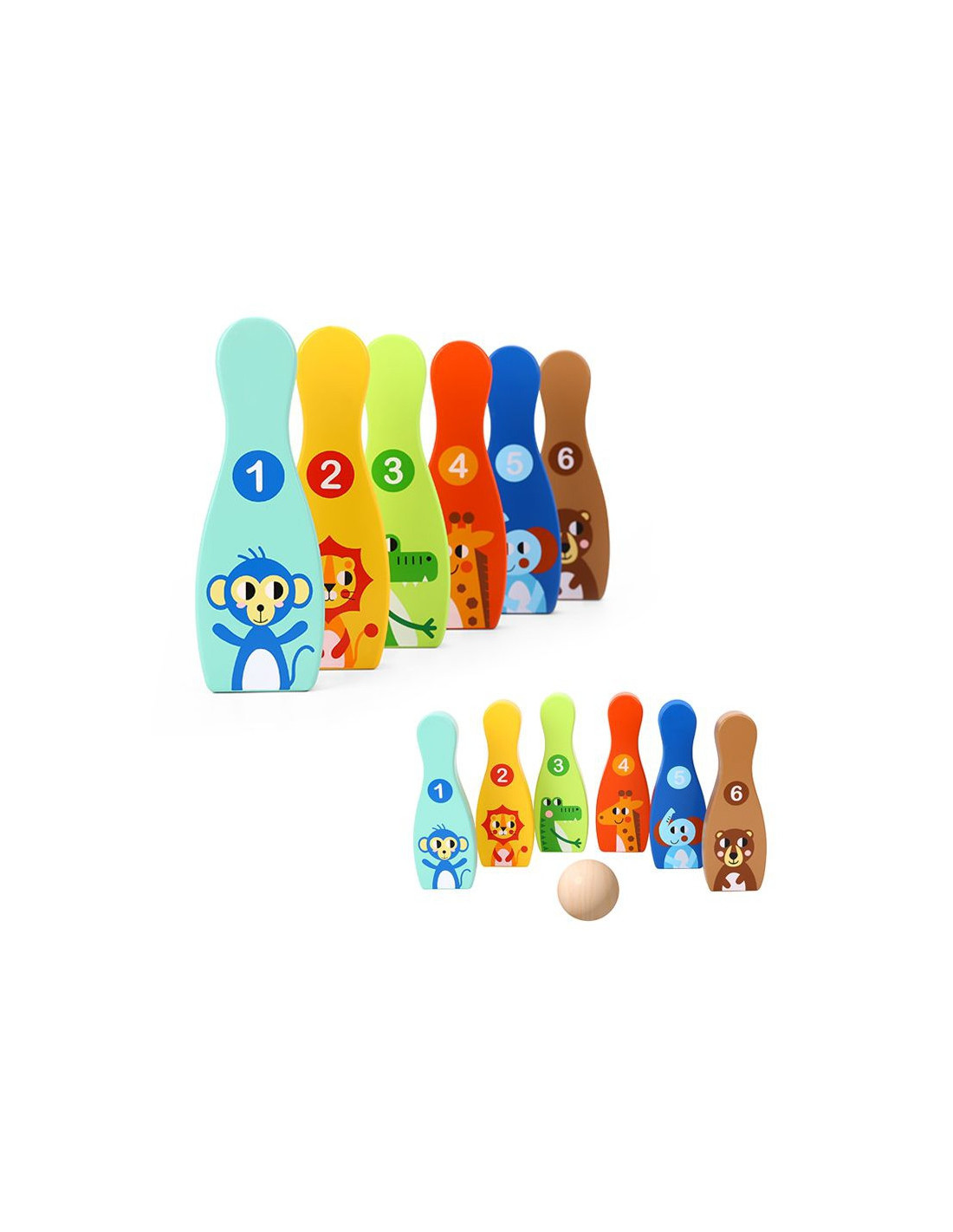 Kręgle Zwierzątka od marki TOOKY TOY to wszystko czego dzieci potrzebują, aby rozwijać zdolności ruchowe i jednocześnie świetnie się przy tym bawić. Zestaw zawiera 6 kręgli oraz 1 piłkę, które wykonane są z drewna. Gra w kręgle będzie wspaniałą zabawą dla Twojego maluszka, ale również dostarczy wiele korzyści edukacyjnych. Zabawka rozwija zdolności motoryczne Twojego dziecka poprzez m.in.: bieganie i rzucanie.
