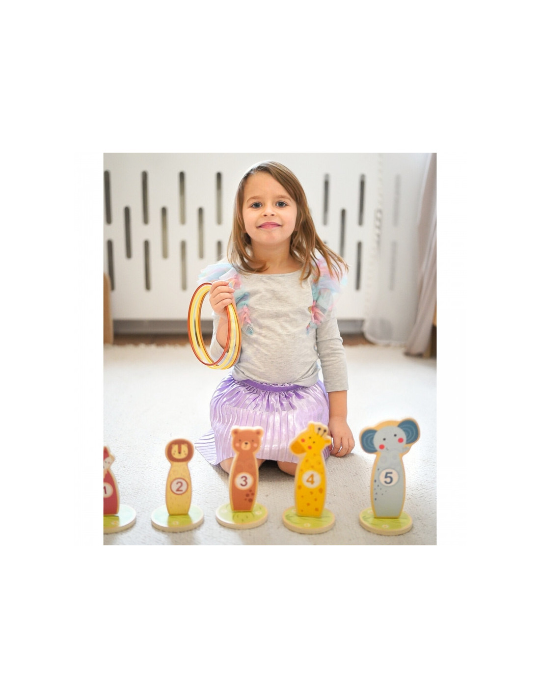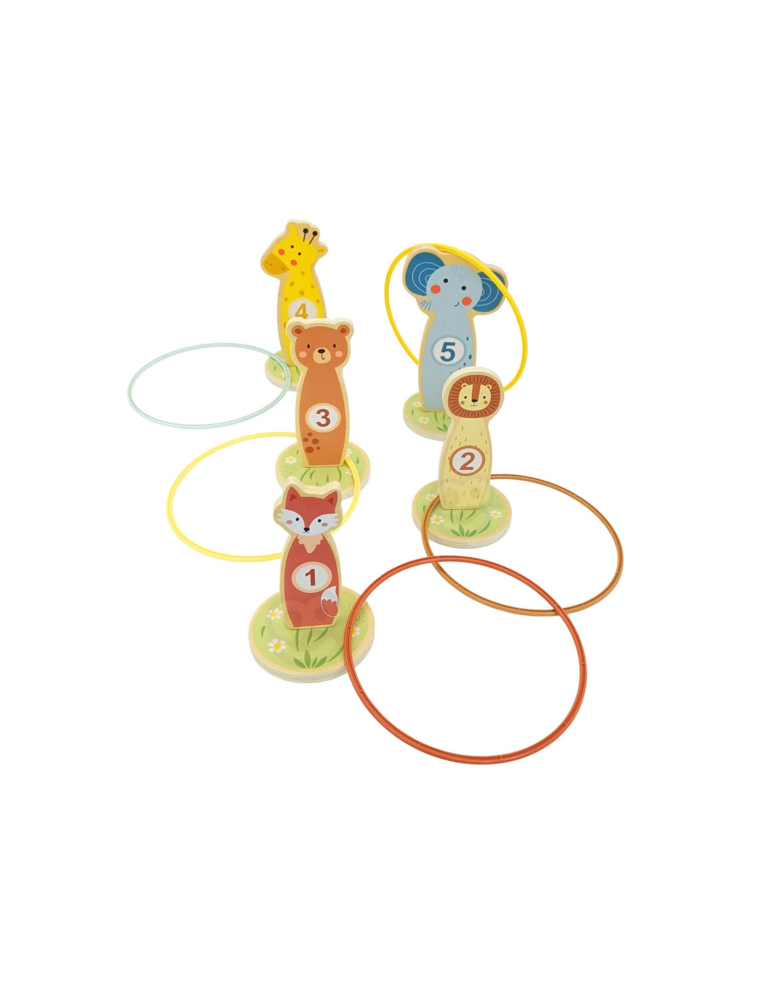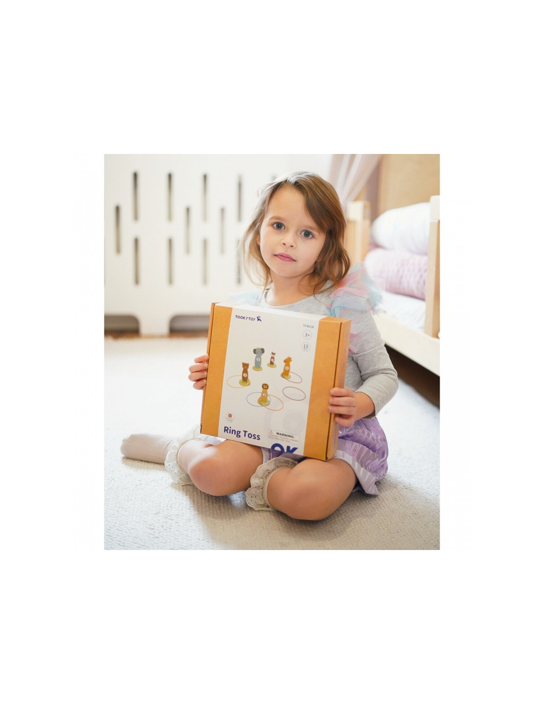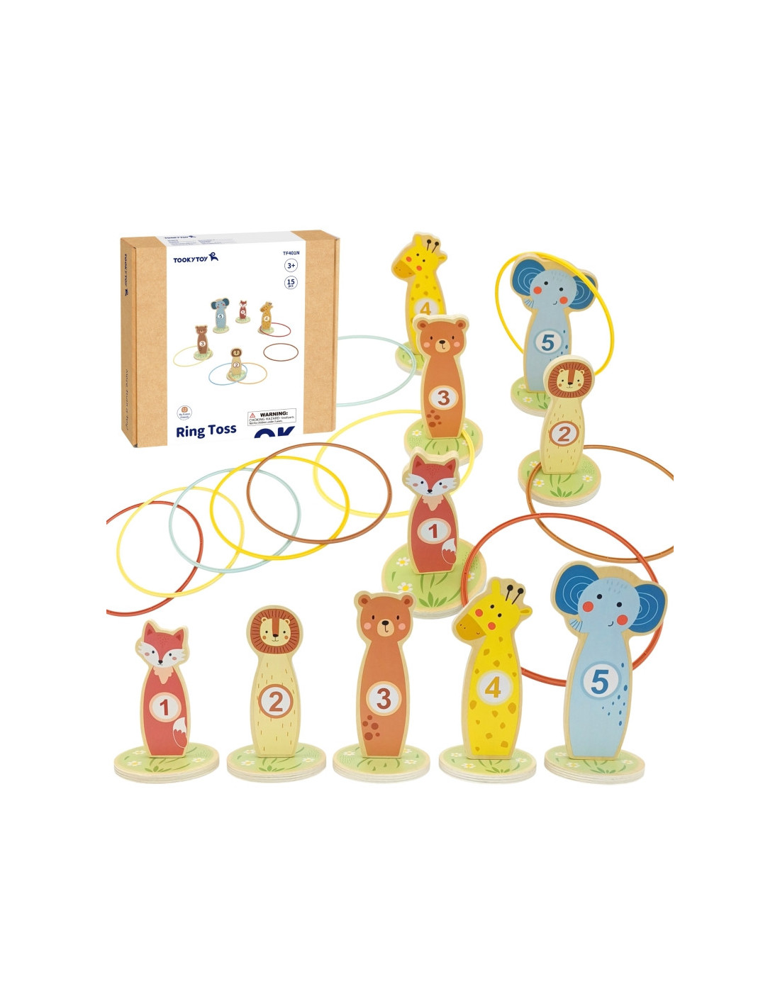 Rzut do celu obręczami marki Tooky Toy to gra zręcznościowa, która dostarcza wielu godzin świetnej zabawy, jednocześnie rozwijając koordynację wzrokowo-ruchową. W zestawie znajduje się 5 postaci zwierząt umieszczonych na podstawkach - tygrys, niedźwiedź, lew, słoń i żyrafa oraz 5 pierścieni. Drewniane elementy można układać w dowolnej konfiguracji, w miarę postępów zwiększać poziom trudności , umieszczając kółka dalej, co pozwala na kreatywne projektowanie własnej wersji gry. Gra doskonała do wspólnej zabawy z przyjaciółmi i rodziną, zachęca dzieci do interakcji społecznych.