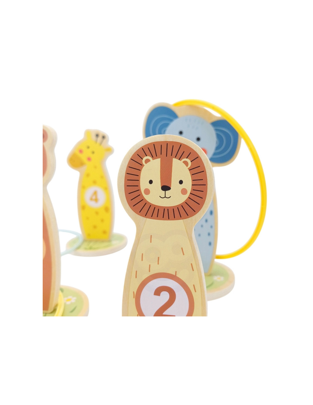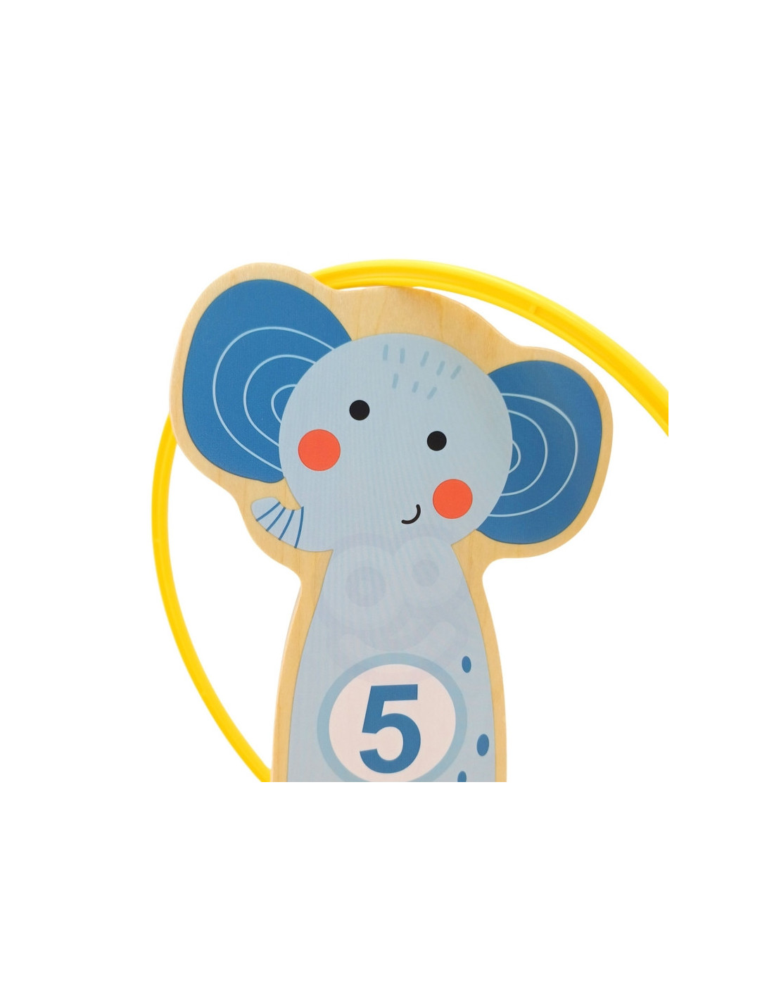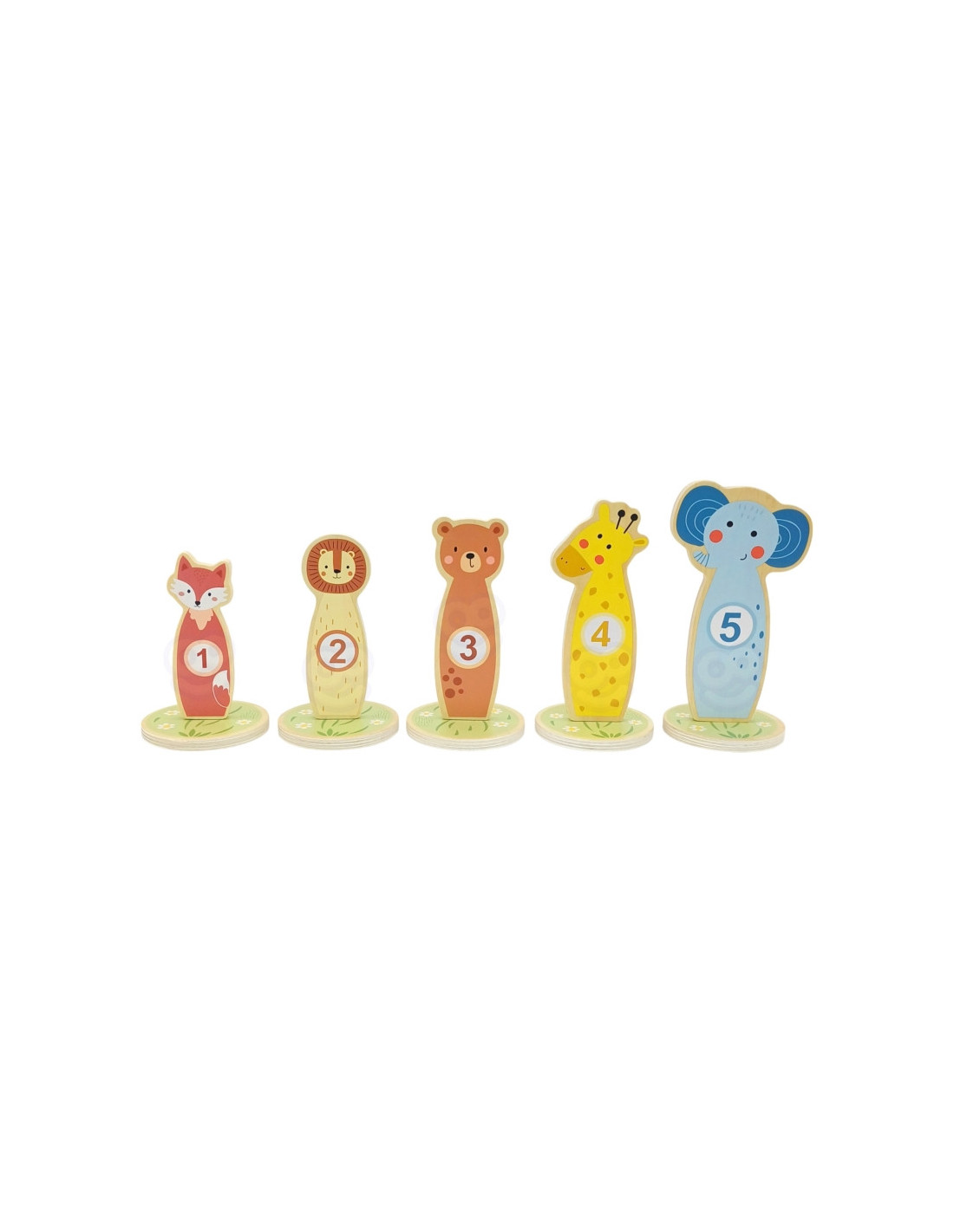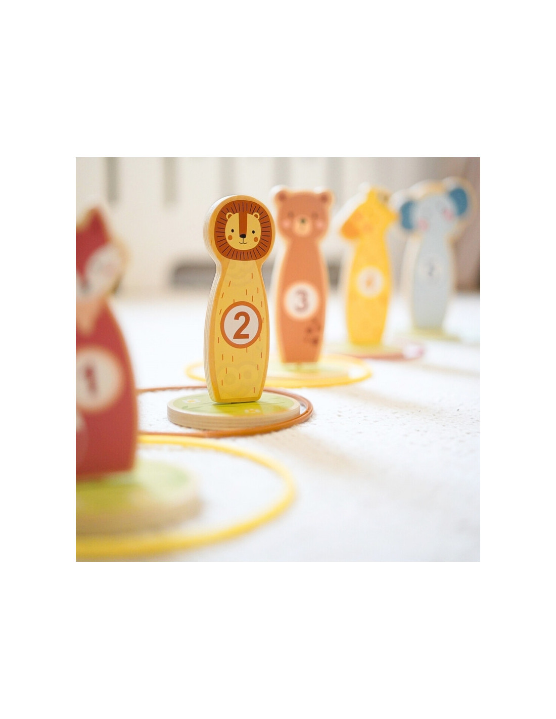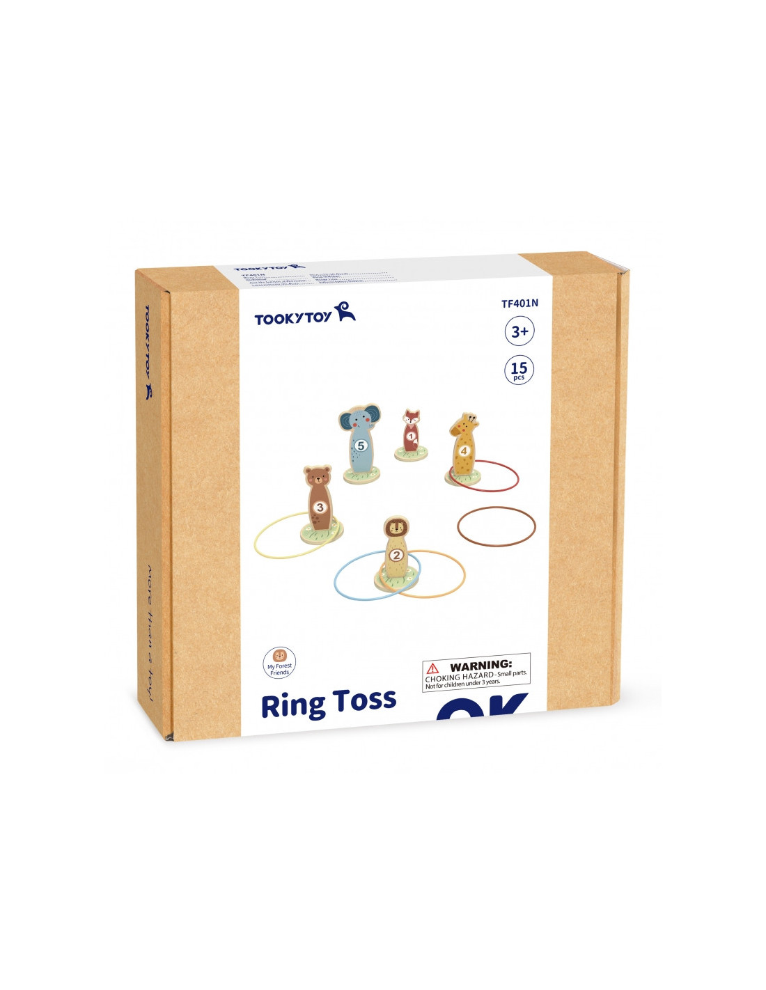 Rzut do celu obręczami marki Tooky Toy to gra zręcznościowa, która dostarcza wielu godzin świetnej zabawy, jednocześnie rozwijając koordynację wzrokowo-ruchową. W zestawie znajduje się 5 postaci zwierząt umieszczonych na podstawkach - tygrys, niedźwiedź, lew, słoń i żyrafa oraz 5 pierścieni. Drewniane elementy można układać w dowolnej konfiguracji, w miarę postępów zwiększać poziom trudności , umieszczając kółka dalej, co pozwala na kreatywne projektowanie własnej wersji gry. Gra doskonała do wspólnej zabawy z przyjaciółmi i rodziną, zachęca dzieci do interakcji społecznych.