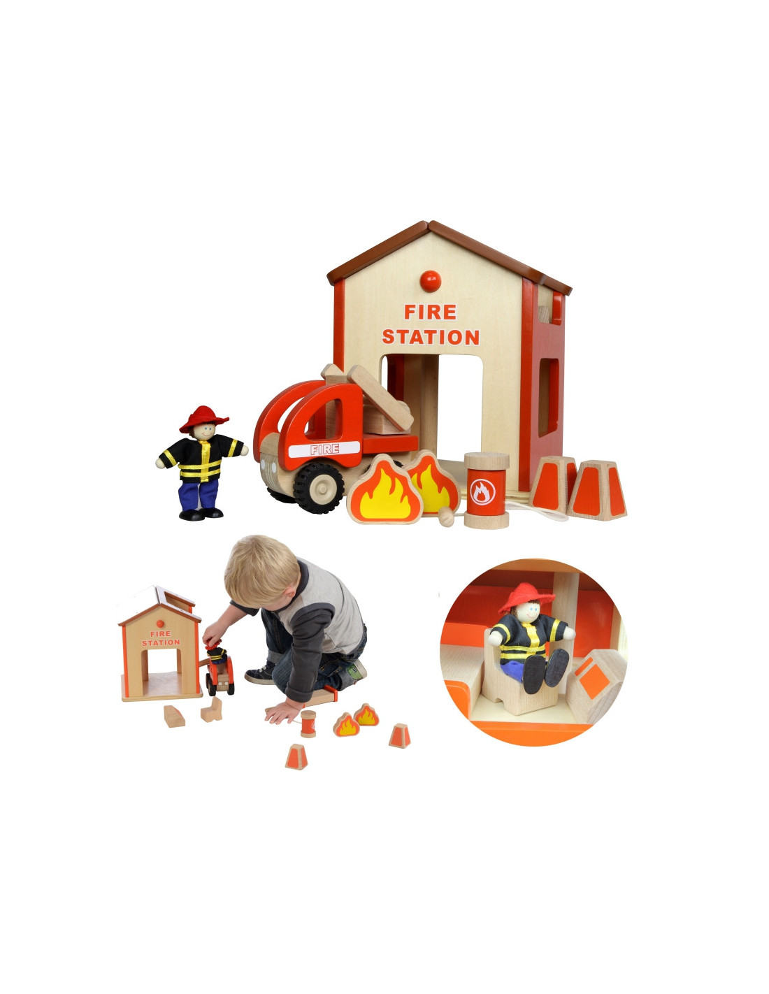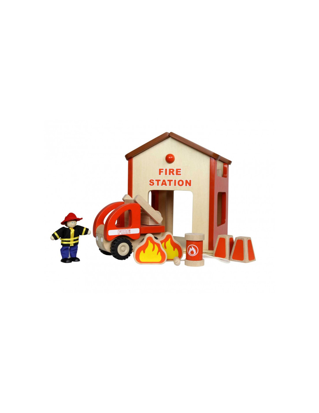 Remiza strażacka wraz z akcesoriami do zabawy w strażaków. Komplet zawiera 2 figurki strażaków, wóz strażacki, oraz elementy takie jak płomienie, pachołki i gaśnica. Zabawa może być wielowymiarowa, a możliwych do odegrania scenek istnieje całe mnóstwo. Jedynym ograniczeniem jest wyobraźnia!