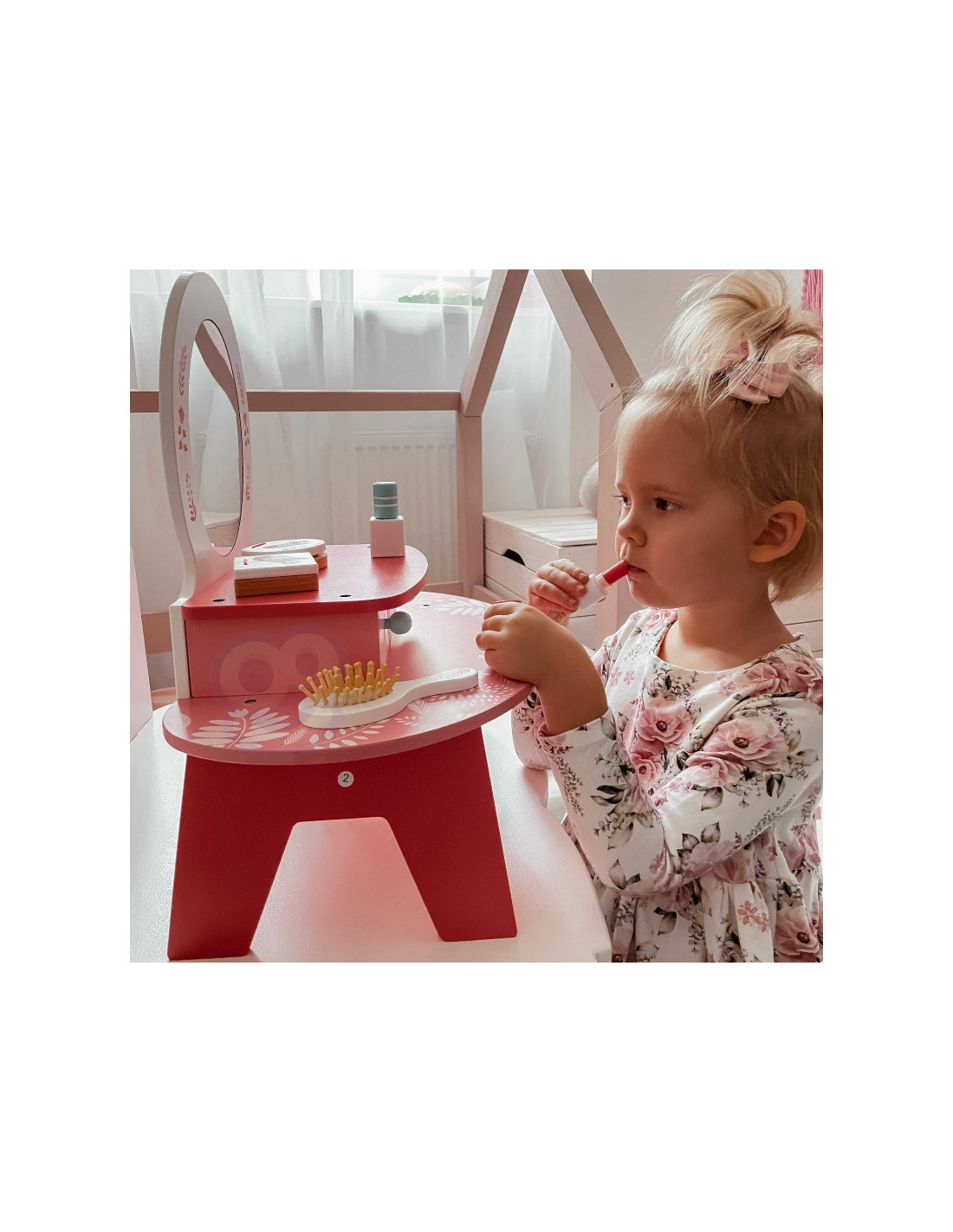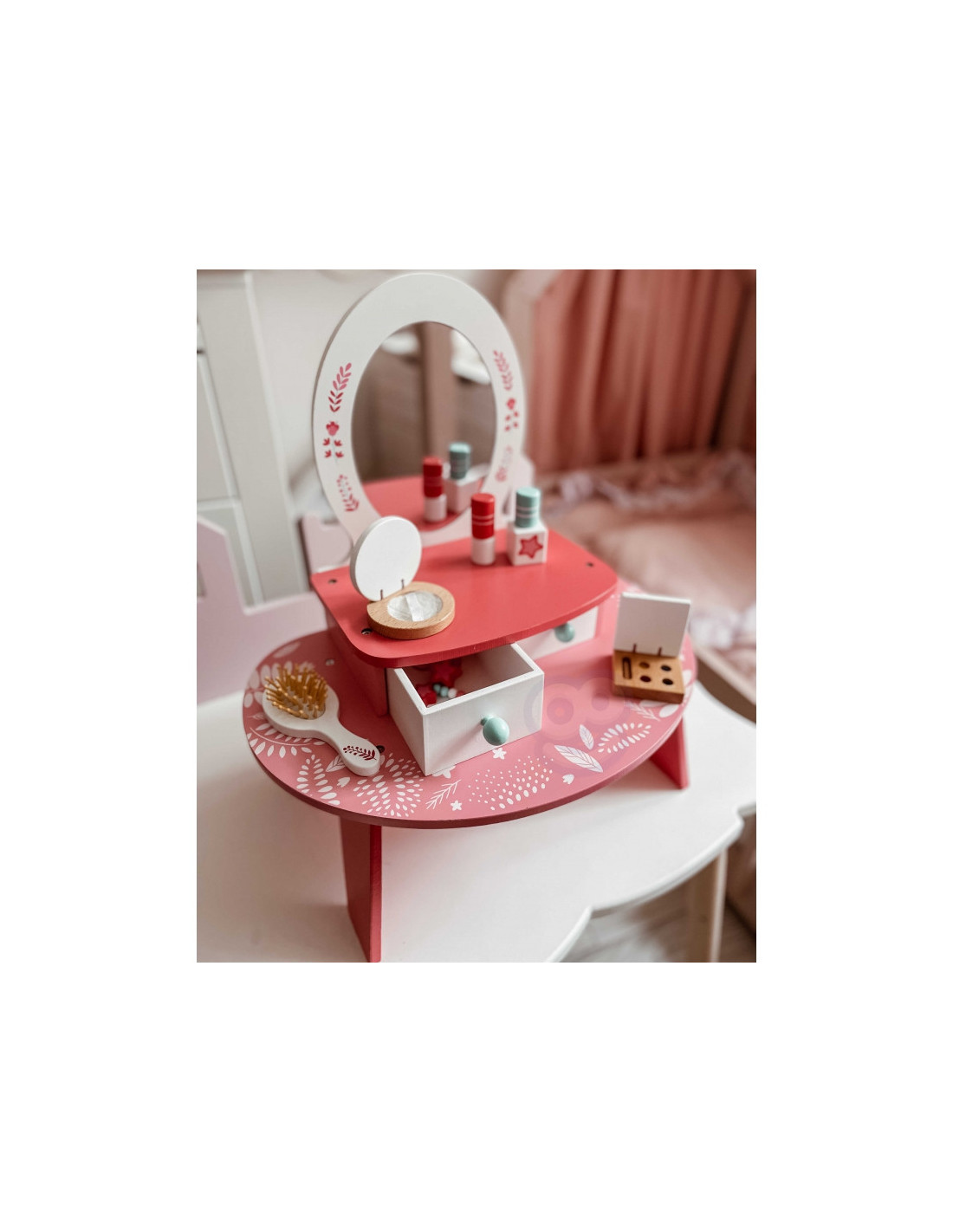 Piękna różowa toaletka od Tooky Toy to wymarzony mebel w pokoju każdej dziewczynki. Toaletka posiada dwie wysuwane szuflady, w które mała księżniczka może schować swoje skarby. Do zestawu dołączone są jeszcze liczne akcesoria. Całość wykonana z drewna i pomalowana nietoksycznymi farbami bezpiecznymi dla dzieci i środowiska.