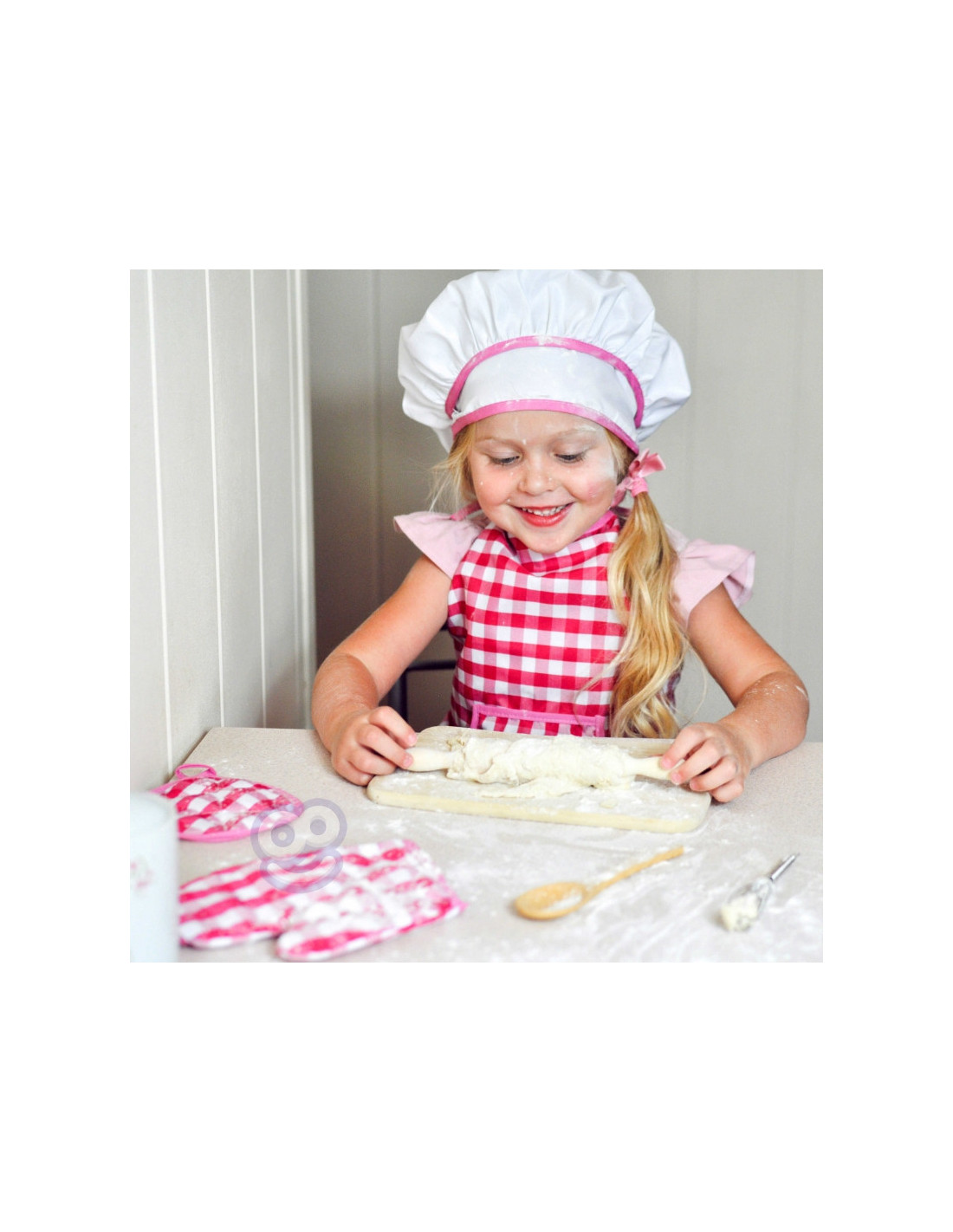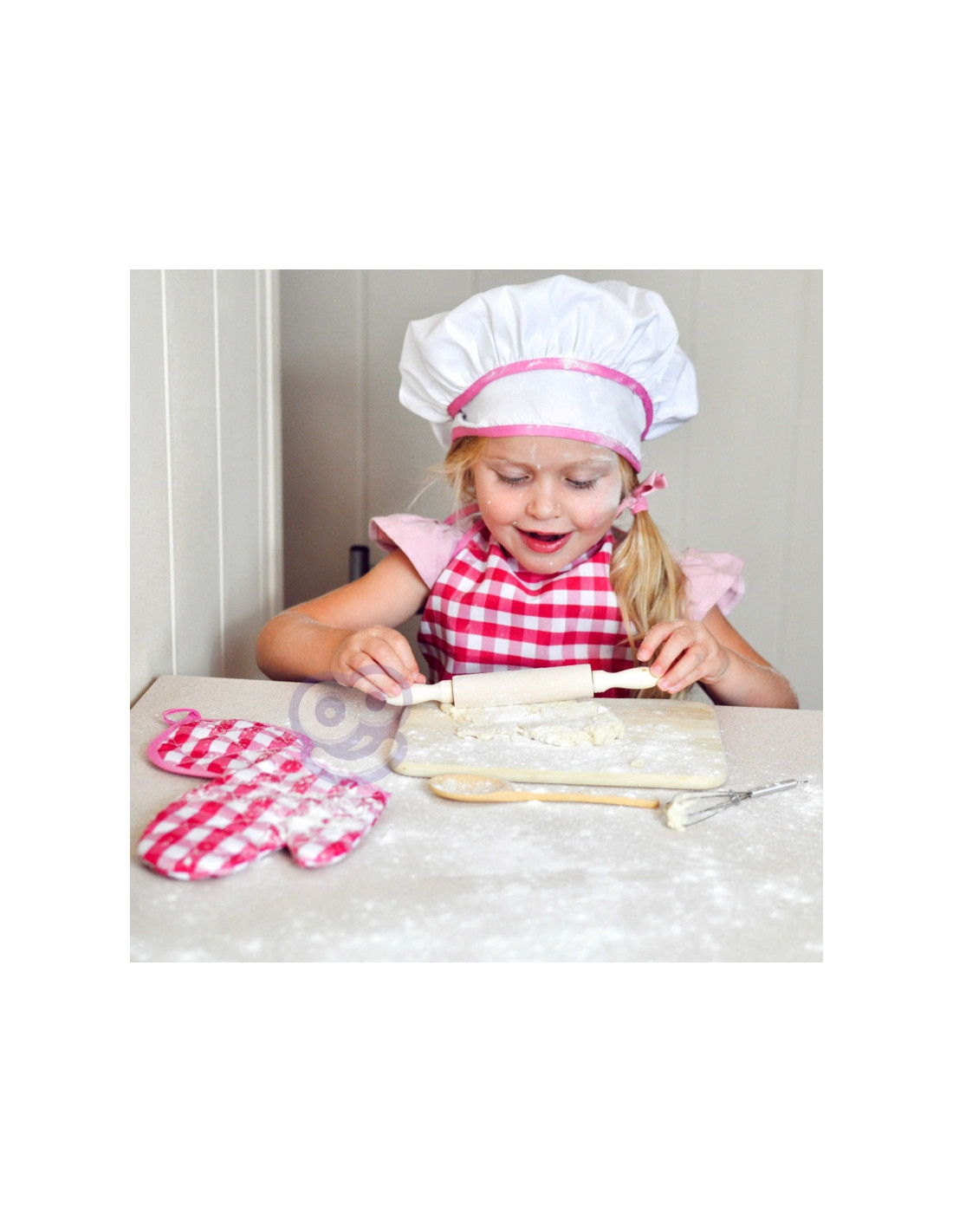 WOOPIE Zestaw Kucharza Strój Kucharski z Akcesoriami to idealny produkt dla każdego małego szefa kuchni. Ślicznie zapakowany świetnie sprawdzi się jako prezent dla małego kucharza. W skład zestawu wchodzi: fartuszek, czapka, rękawica kuchenna, podkładka materiałowa, wałek do ciasta o długości około 20 cm, drewniana łyżka oraz metalowa ubijaczka. Każdy maluch lubi pomagać w pracach kuchennych, dzięki temu zestawowi zostanie idealnie wyposażony w niezbędne akcesoria!