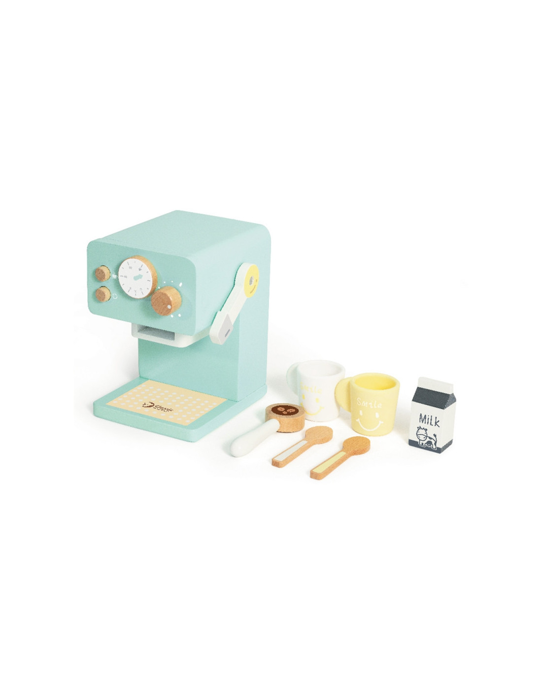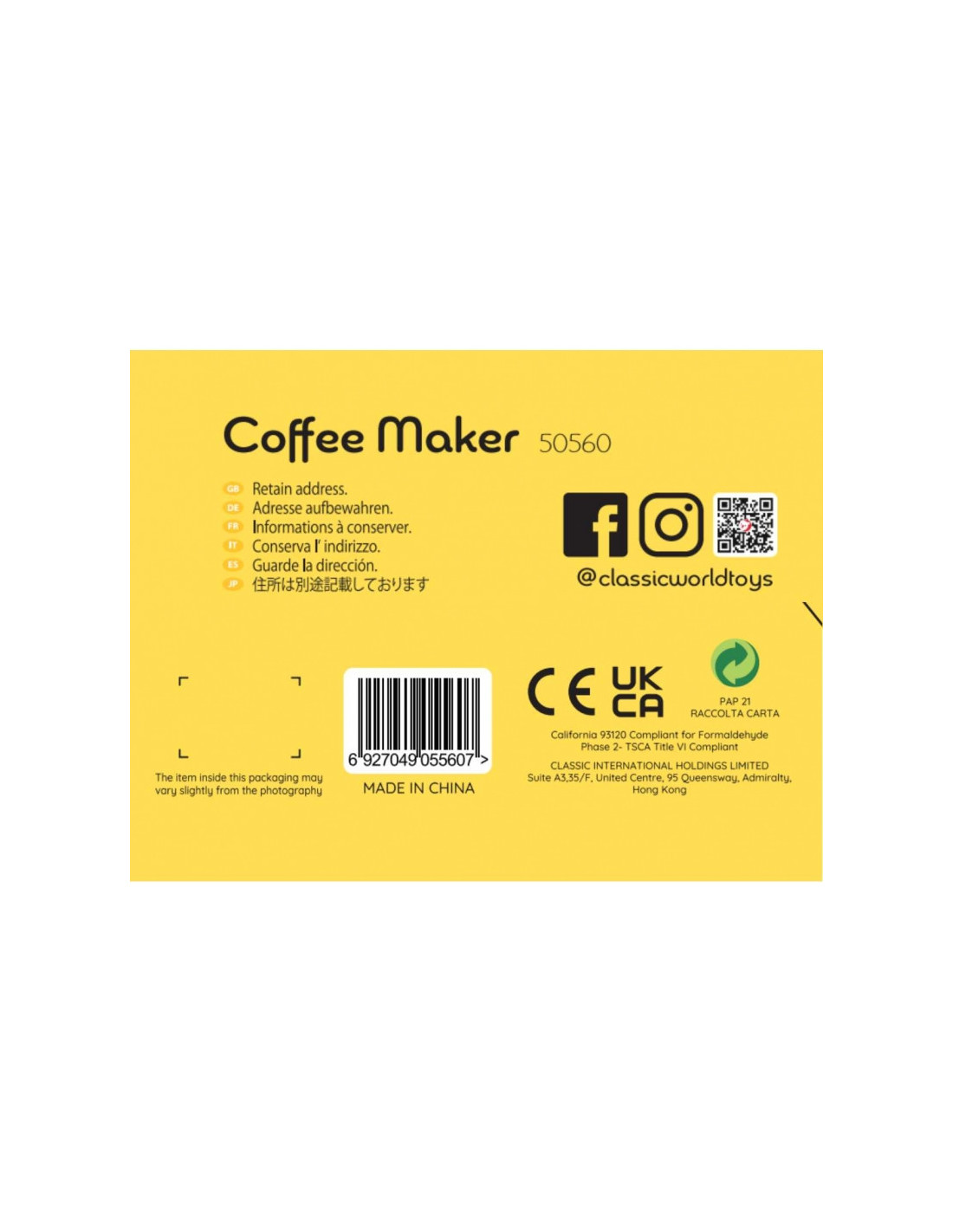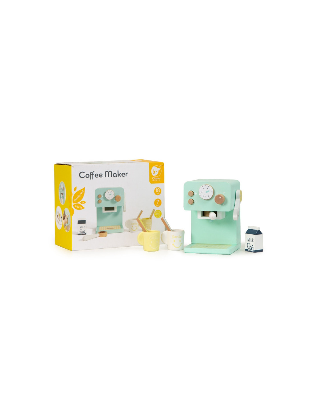 Drewniany ekspres do kawy od marki CLASSIC WORLD będzie doskonałym uzupełnieniem kuchni. Zestaw zawiera 7 elementów. Jeśli Twoje dziecko lubi pomagać w kuchni i fascynuje go świat kuchennych sprzętów z pewnością polubi tą zabawkę. Ekspres posiada ruchome elementy jak rączka po prawej stronie do nalewania kawy oraz prawe pokrętło (minutnik), który dodatkowo wydaję dźwięk - podobny do nakręcania. Dzięki funkcją ekspres jest bardzo realistyczny i dziecko może wyobrazić sobie oraz wcielić się w dorosłego robiącego kawę. Drewniany ekspres to produkt wykonany z naturalnego drewna, który charakteryzujący się wysoką estetyką wykonania, trwałością i troską o bezpieczeństwo dziecka.