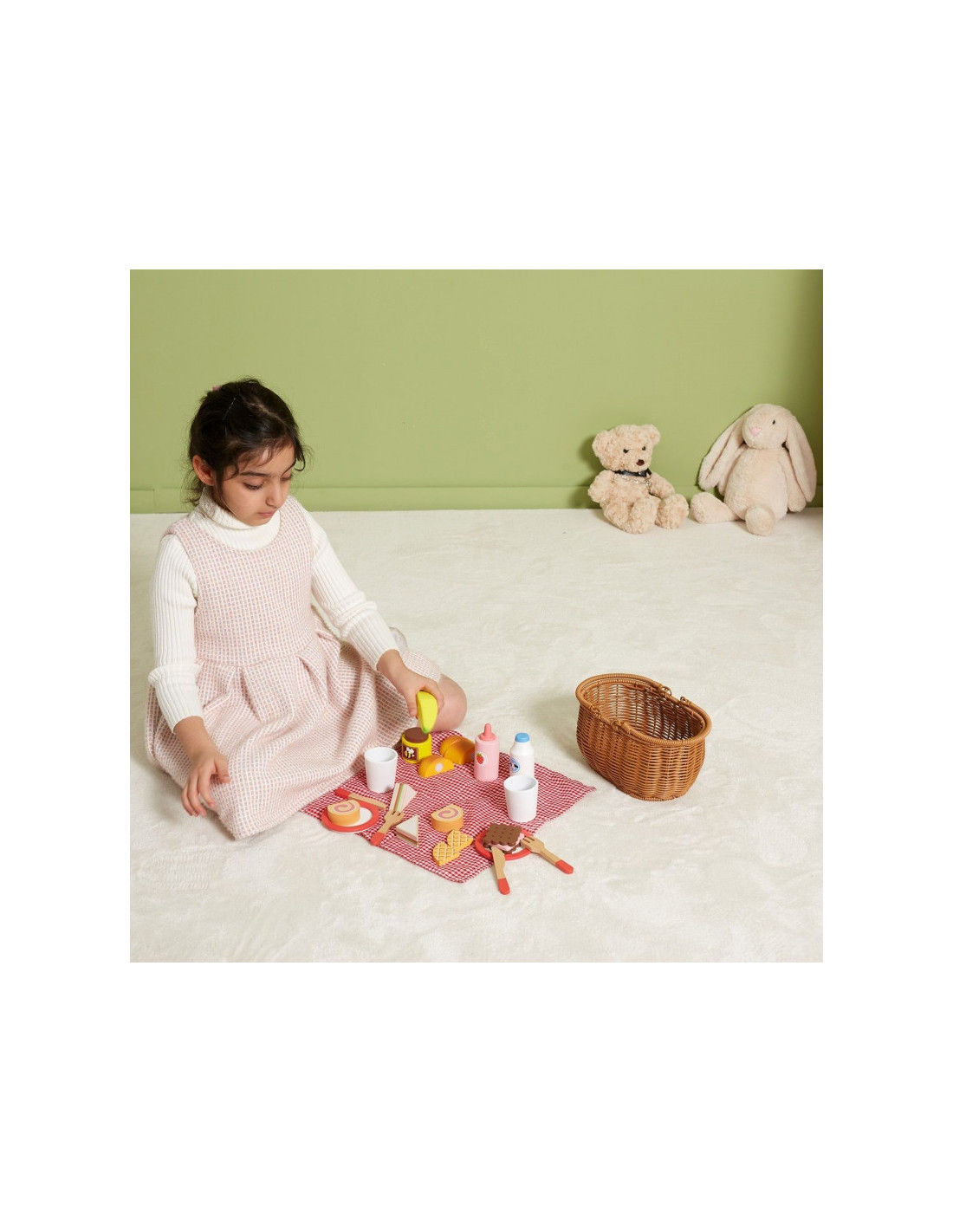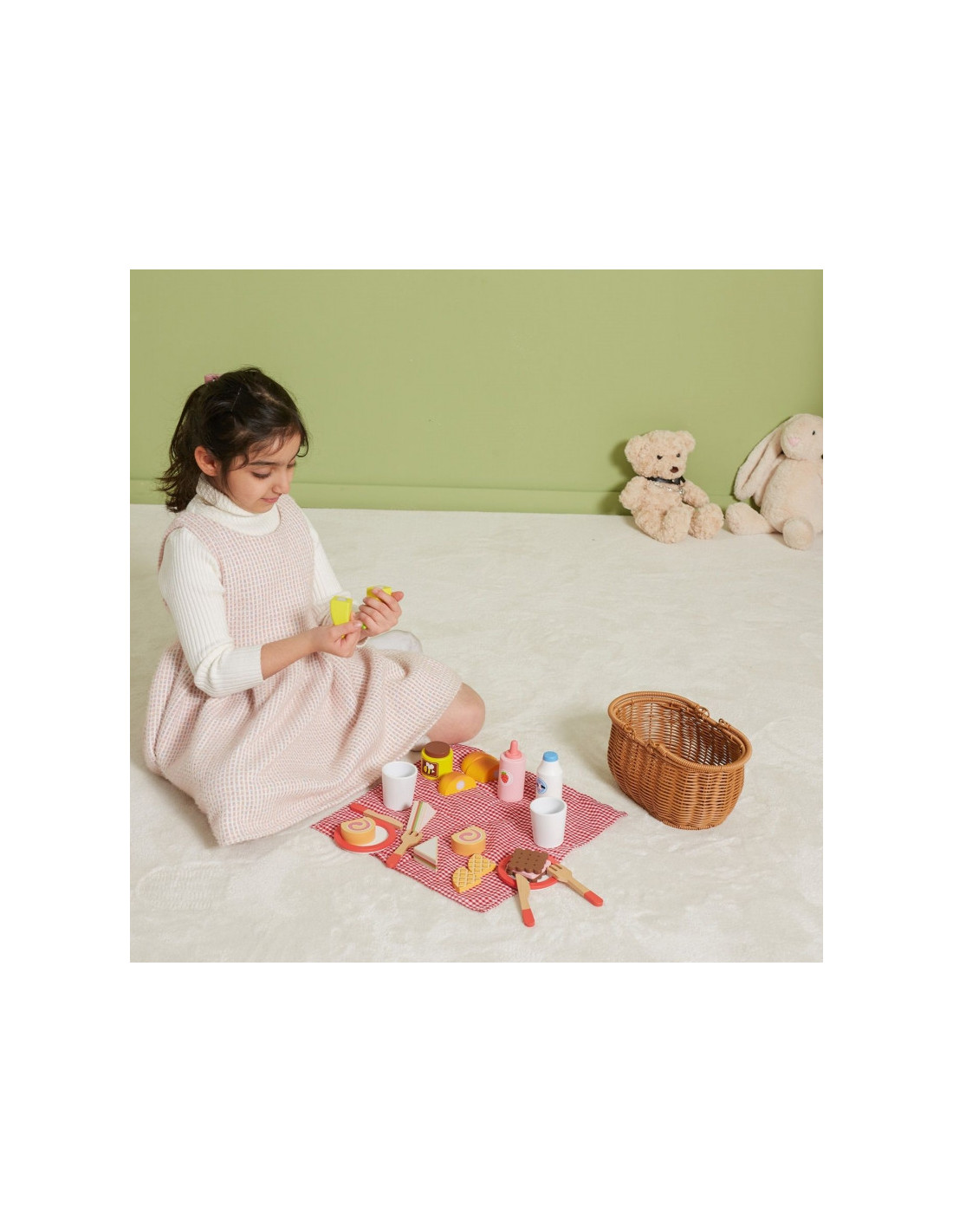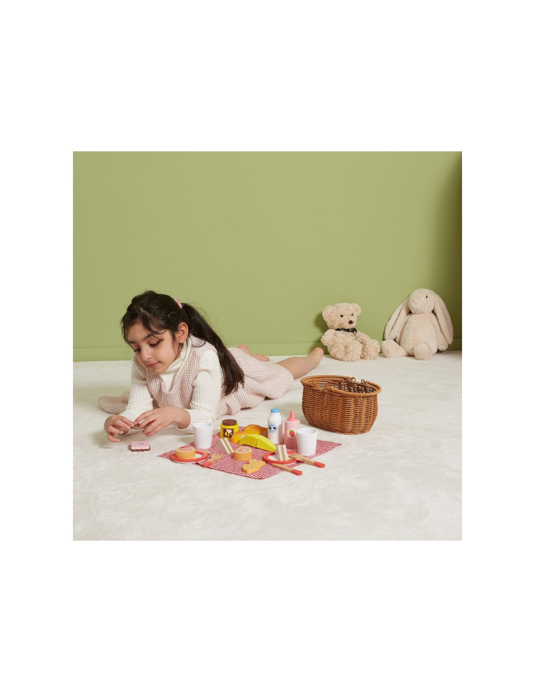 Leiskitės į smagią pikniką su draugais su mediniu VIGA pikniko rinkiniu . Šis gražus krepšelis , pagamintas iš dirbtinės nendrės, yra pripildytas įvairių medinių aksesuarų ir languoto audinio. Dėl tvirtų rankenų jūsų vaikas gali lengvai pasiimti visą rinkinį su savimi, kad ir kur eitų . Pridedami mediniai užkandžiai ir aksesuarai leidžia jam pasiimti mėgstamus žaislus, pliušinius žaislus ar žaisti vaidmenimis su draugu. Šis rinkinys tinka žaisti tiek lauke, tiek viduje. Kai kurie indai susideda iš kelių dalių ir yra pritvirtinti „Velcro“. Naudodamas medinį peilį, jūsų vaikas gali juos supjaustyti gabalėliais, lavindamas smulkiąją motoriką . Suaugusiųjų mėgdžiojimas taip pat prisidės prie socialinių įgūdžių lavinimo .