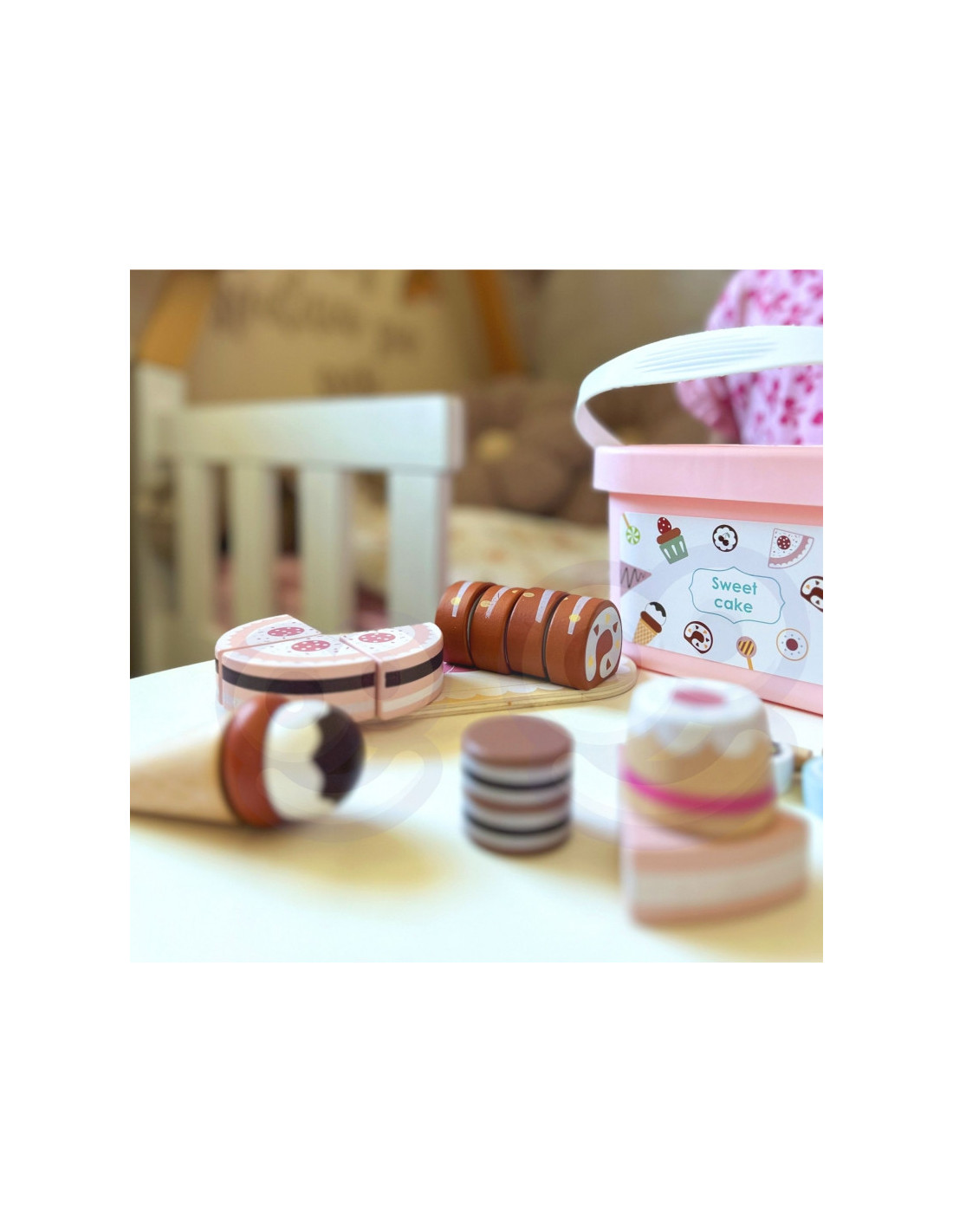 - - Zestaw zawiera: Pudełko, tort, roladę, babeczkę, muffinkę, ciastko, pączka, kawałek ciasta, 4 lizaki, 2 lody w wafelku, 2 filiżanki, 2 łyżeczki, 2 widelce, nożyk