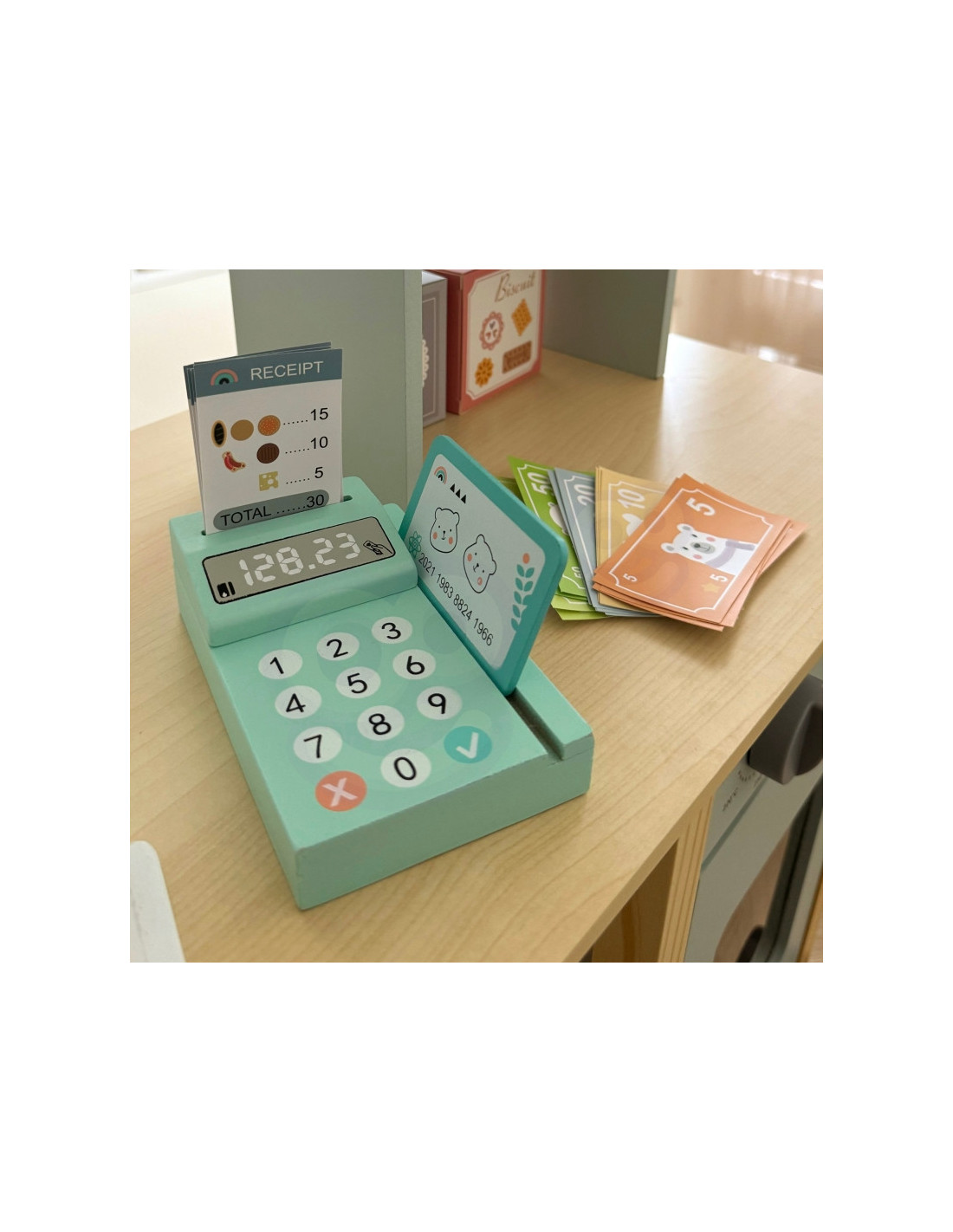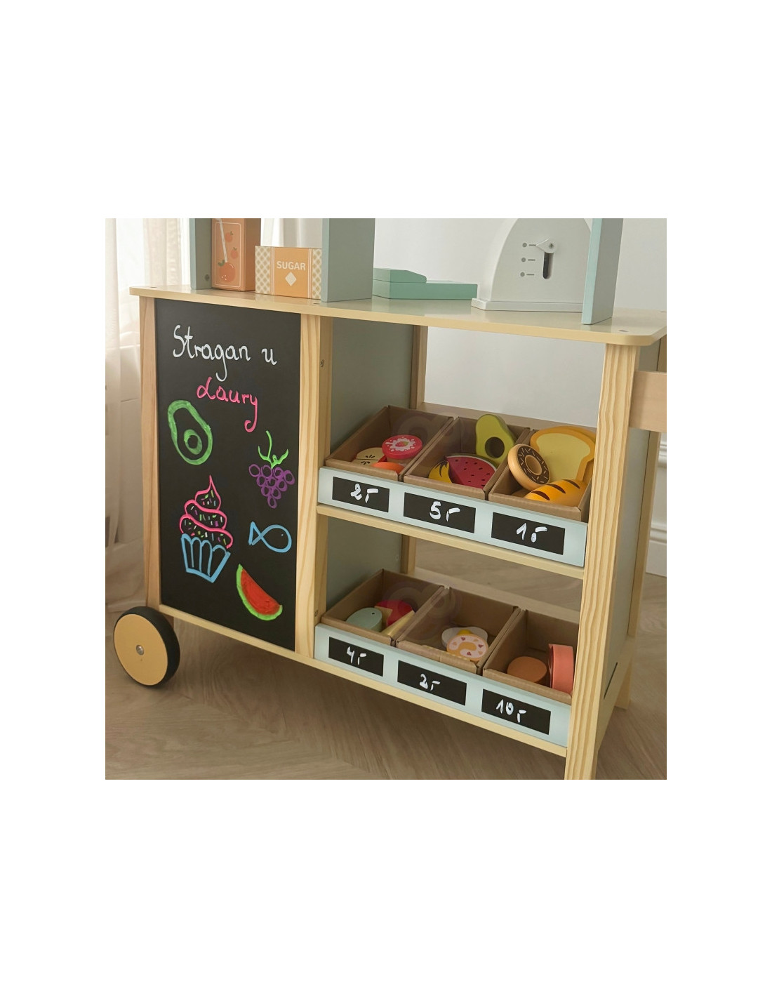 W zestawie znajdziesz aż 73 elementy, w tym wagę, produkty spożywcze, czytnik kart i kredową tablicę, na której możesz napisać, co dziś w promocji! Dzięki zabawie w sklep dziecko rozwija umiejętności społeczne, matematyczne i organizacyjne, a do tego świetnie się bawi, ucząc się przez odgrywanie ról. Wszystko wykonane z bezpiecznego drewna i pomalowane nietoksycznymi farbami.