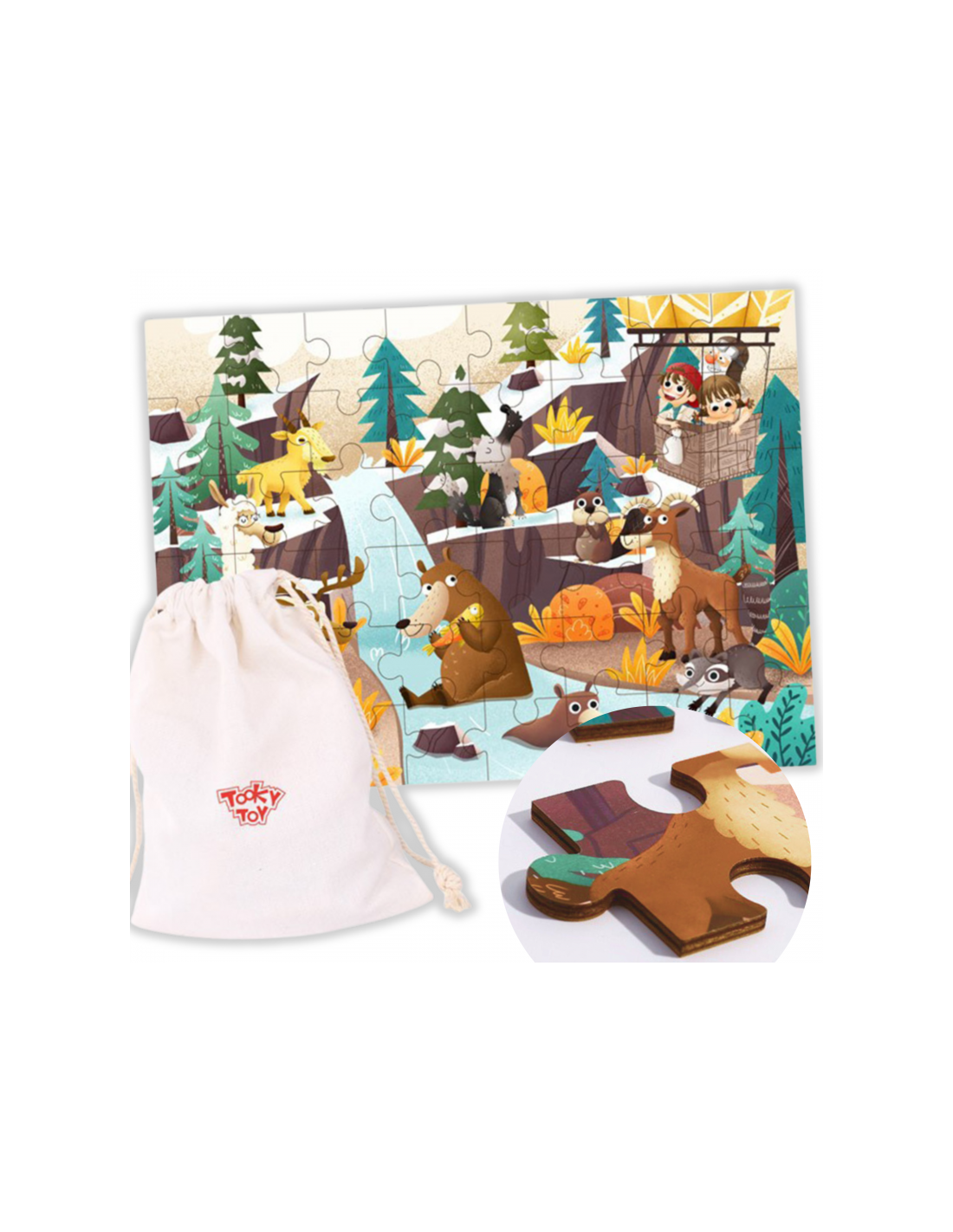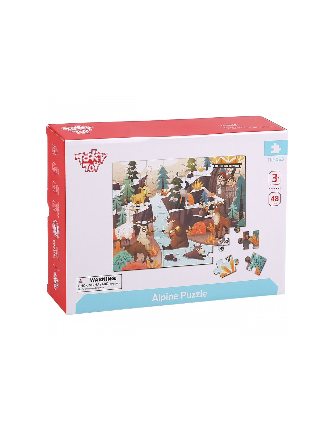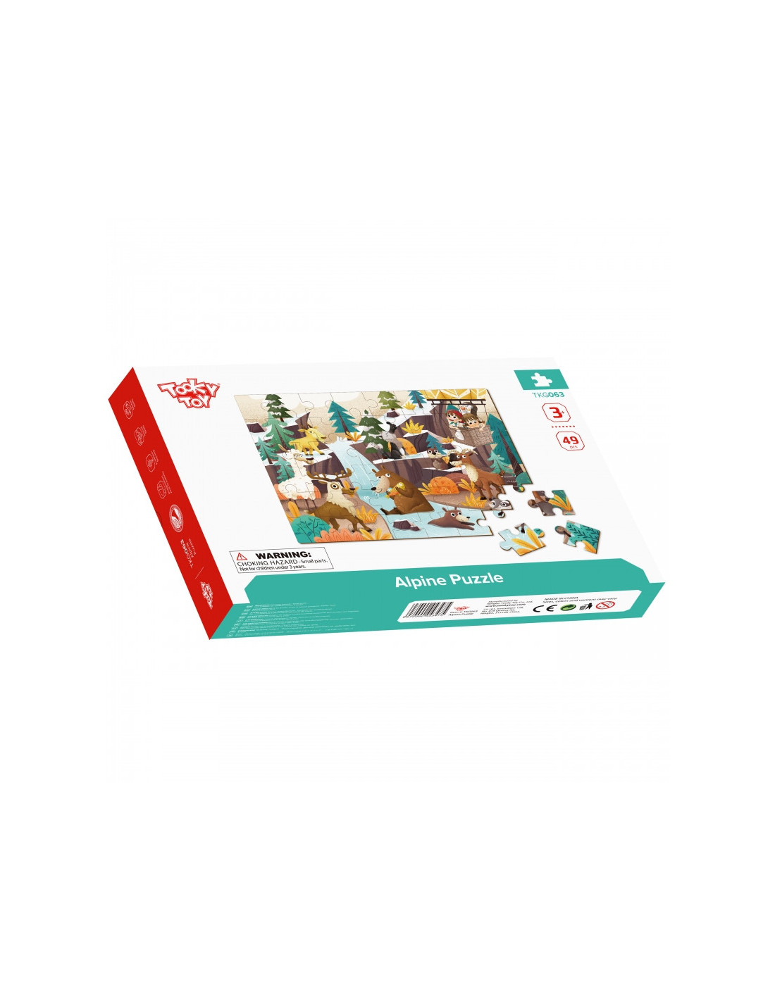 TOOKY TOY Puzzle Alpejskie Zwierzęta i Krajobraz to świetny pomysł na prezent. Zestaw składa się z 49 elementów. Maluch będzie mógł poznać zwierzęta i roślinność występującą w Alpejskim krajobrazie. Idealny dodatek na pierwsze puzzle dla Twojego dziecka. Puzzle znajdują się w woreczku, który potem można wykorzystać jako woreczek ze wspomnieniami z podróży. Produkt wykonany z drewna i pomalowany nietoksycznymi farbami. Zabawka pozwoli na długie godziny zabawy. Kolory i ilustracje przyciągną wzrok każdego małego odkrywcy świata!