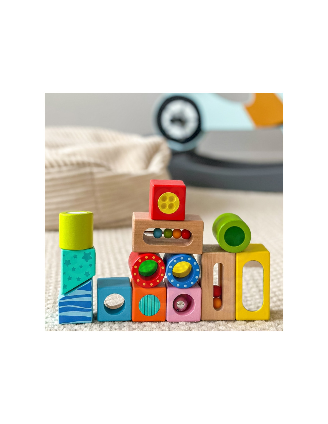 TOOKY TOY Medinė dėžutė Sensoriniai blokai Daugiafunkcinė dėlionė Shapes Sound Touch 12 vnt.