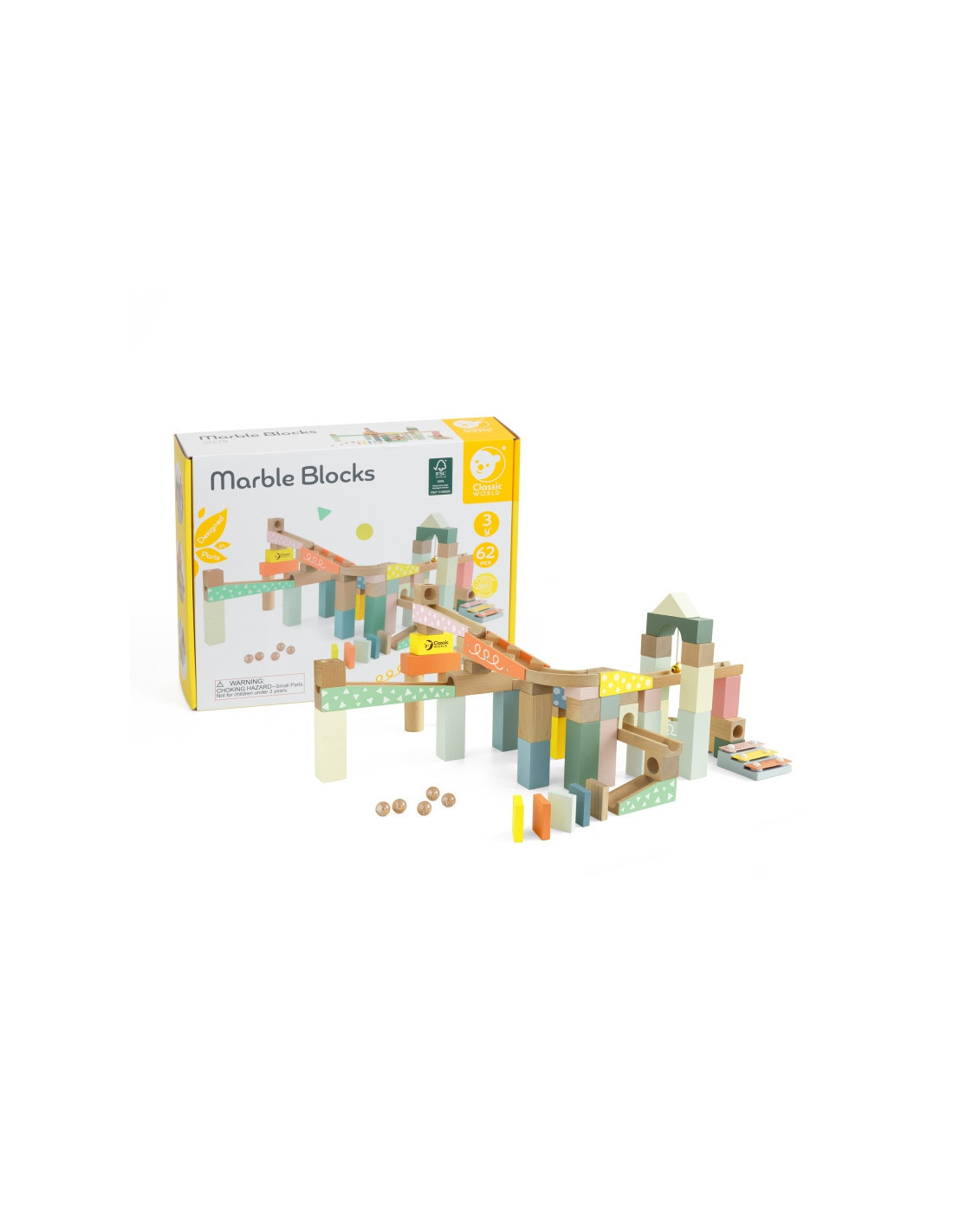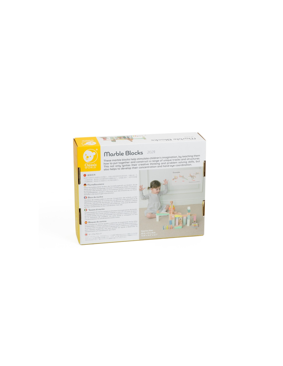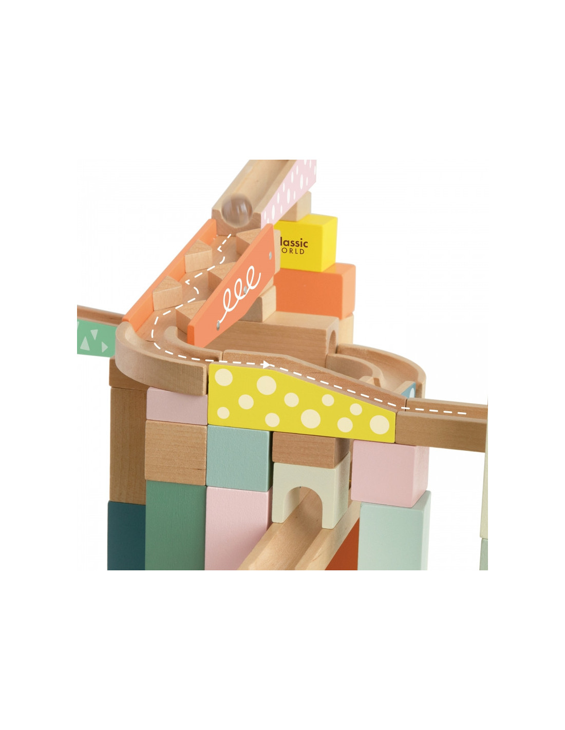 Drewniane Klocki od marki CLASSIC WORLD to śliczny pastelowy zestaw do budowania marmurowego toru, który pobudza u dzieci kreatywność i koncentrację. Wyjątkowe pastelowe kolory i brak ostrych krawędzi umożliwia bezpieczną zabawę,ucząc dzieci jak składać i konstruować szereg unikalnych torów i konstrukcji. Jest to fantastyczna zabawka dla całej rodziny dająca wiele możliwości kreatywnej zabawy przy układaniu torów na wciąż nowe sposoby.