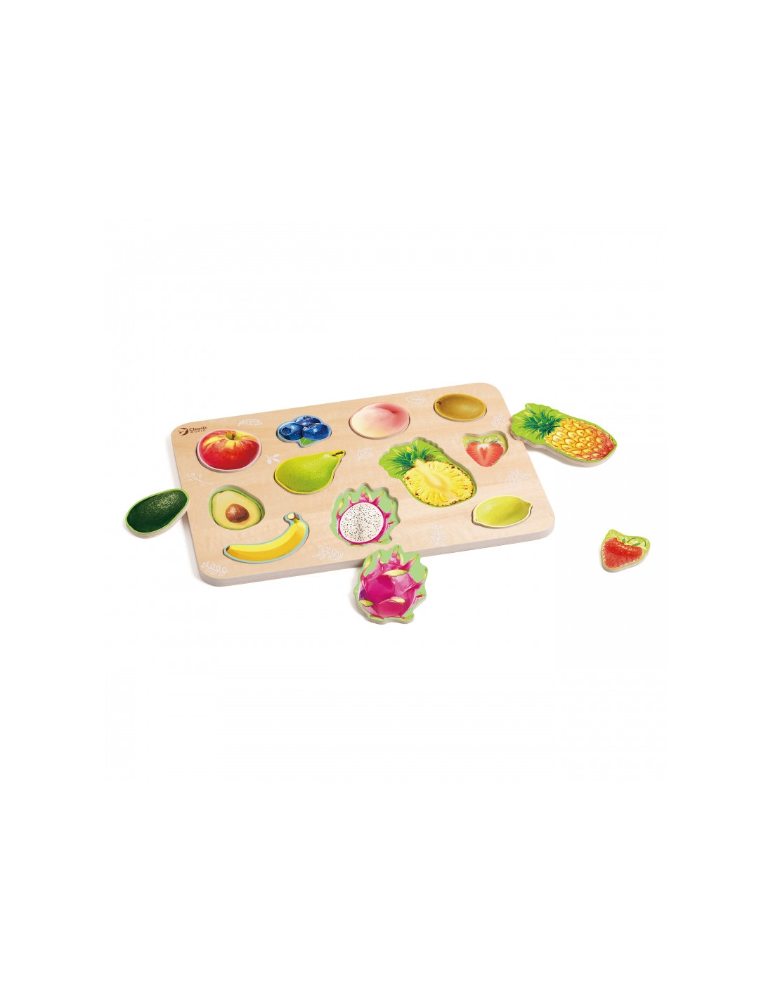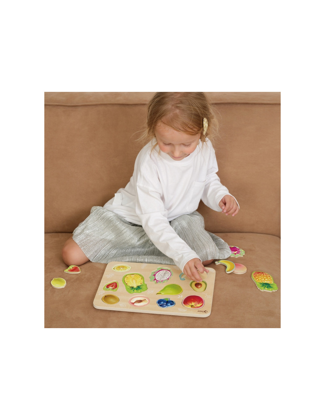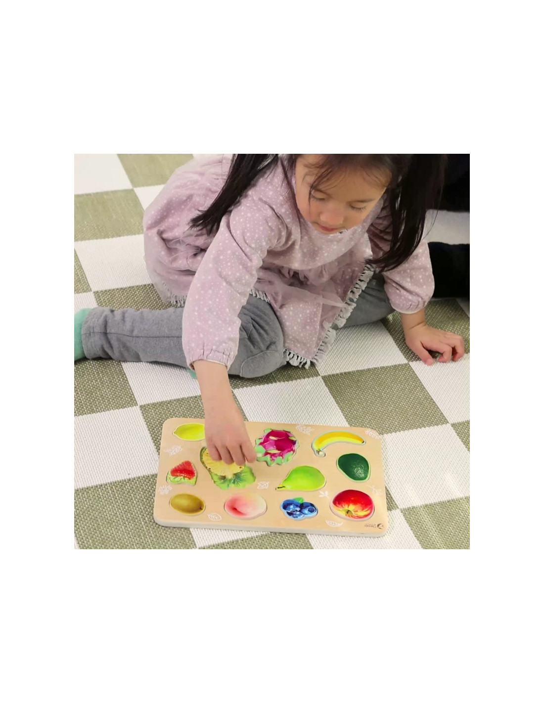 Kolorowa układanka pomaga dziecku rozwijać rozpoznawanie kształtów i kolorów, logiczne myślenie i koordynację ręka-oko. Maluch poznaje różnorodne owoce, dopasowując je do odpowiednich miejsc na tablicy.