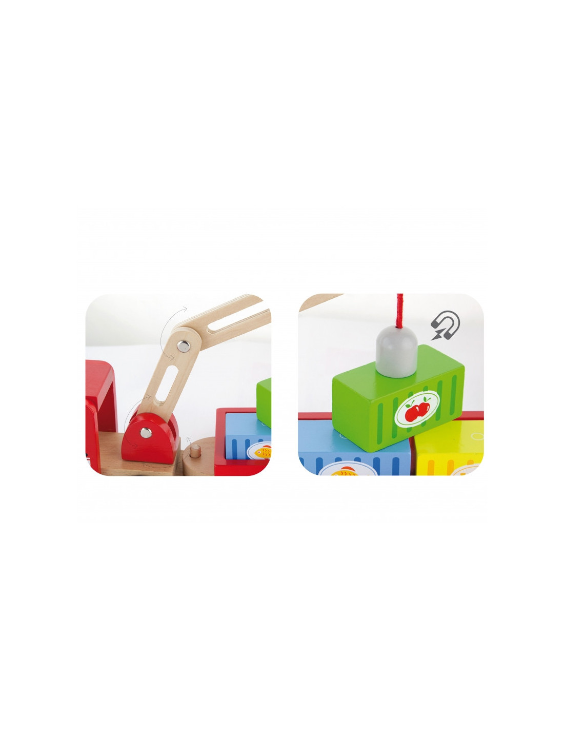 Drewniany Dźwig posiada ruchome ramię i 4 drewniane kontenery wyposażone w magnesy, dzięki którym można je podnosić. Podstawa dźwigu jest obrotowa. Kolorowy dźwig z kontenerami cieszy oko i zachęca do zabawy. Przyczepkę można odpinać od pojazdu, ściągając ją z drewnianego kołeczka.