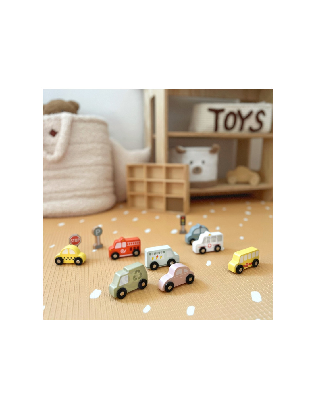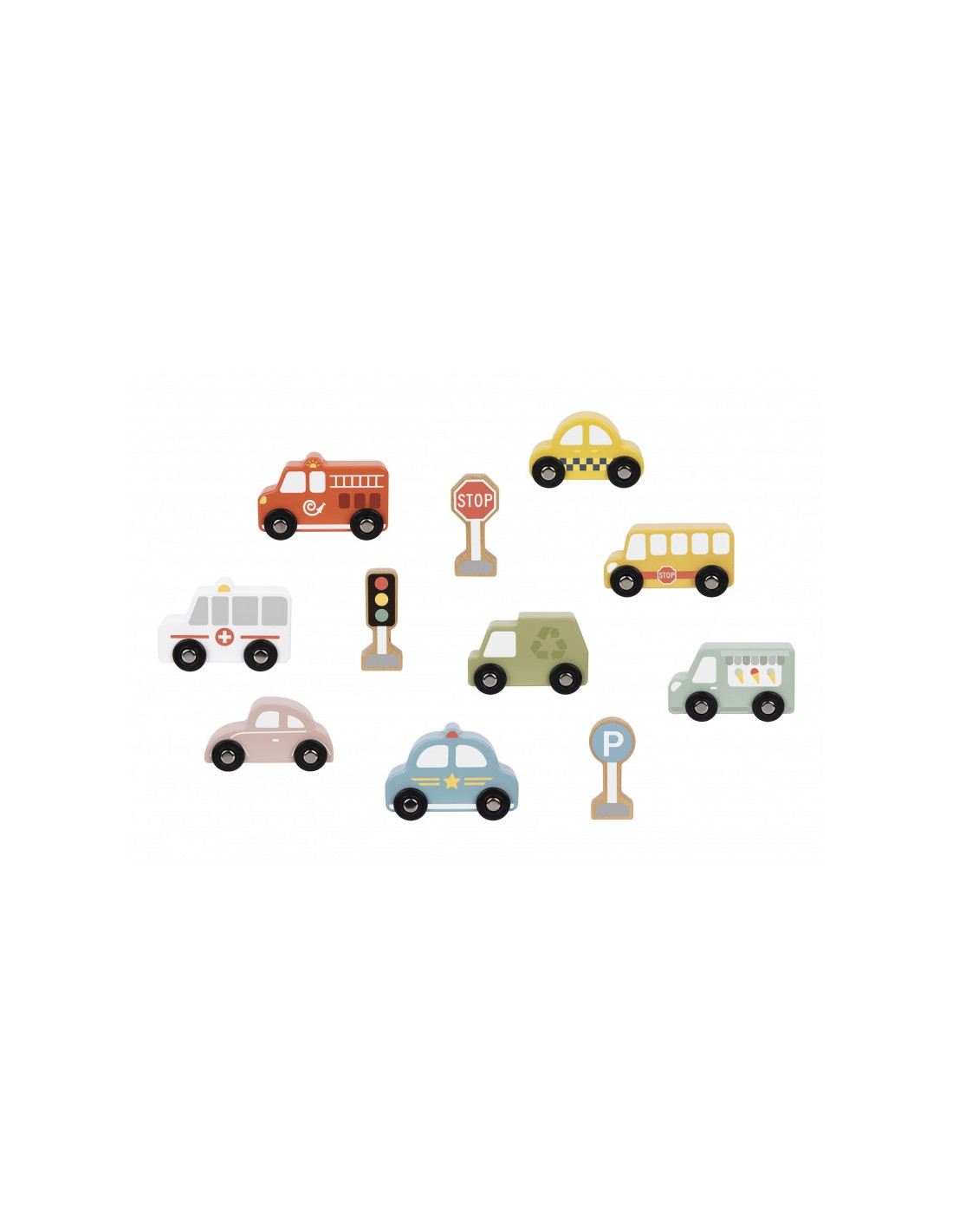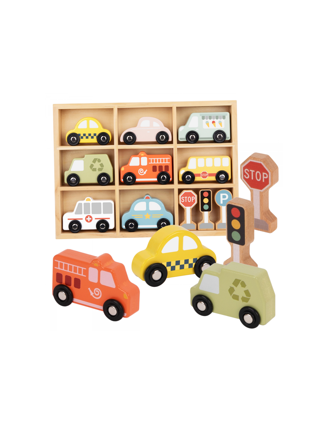 - - W pudełku znajduje się 8 pojazdów: taxi, samochód osobowy, food truck, śmieciarka, straż pożarna, autobus szkolny, karetka, samochód policyjny,
