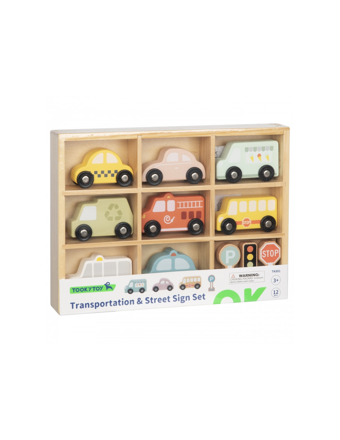 TOOKY TOY Medinių transporto priemonių ir kelio ženklų rinkinys dėžutėje