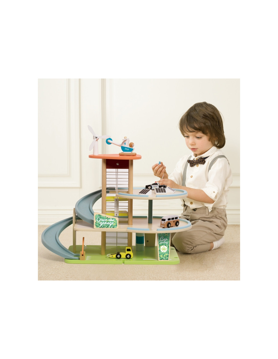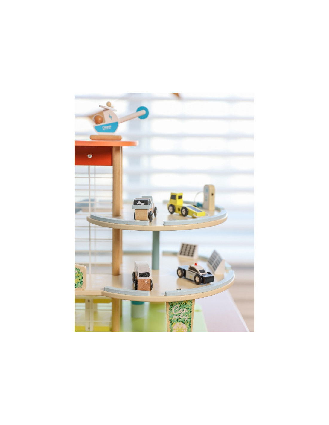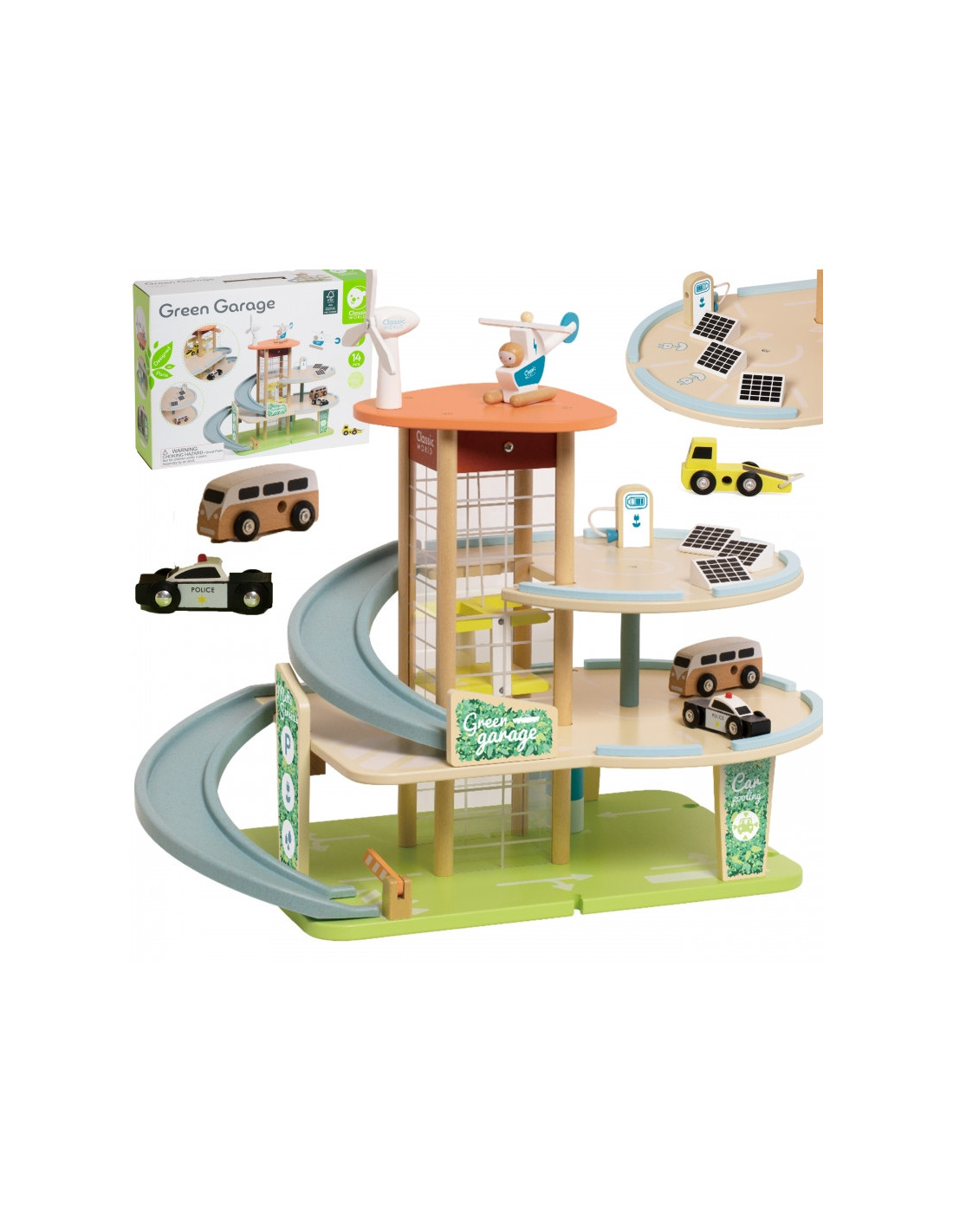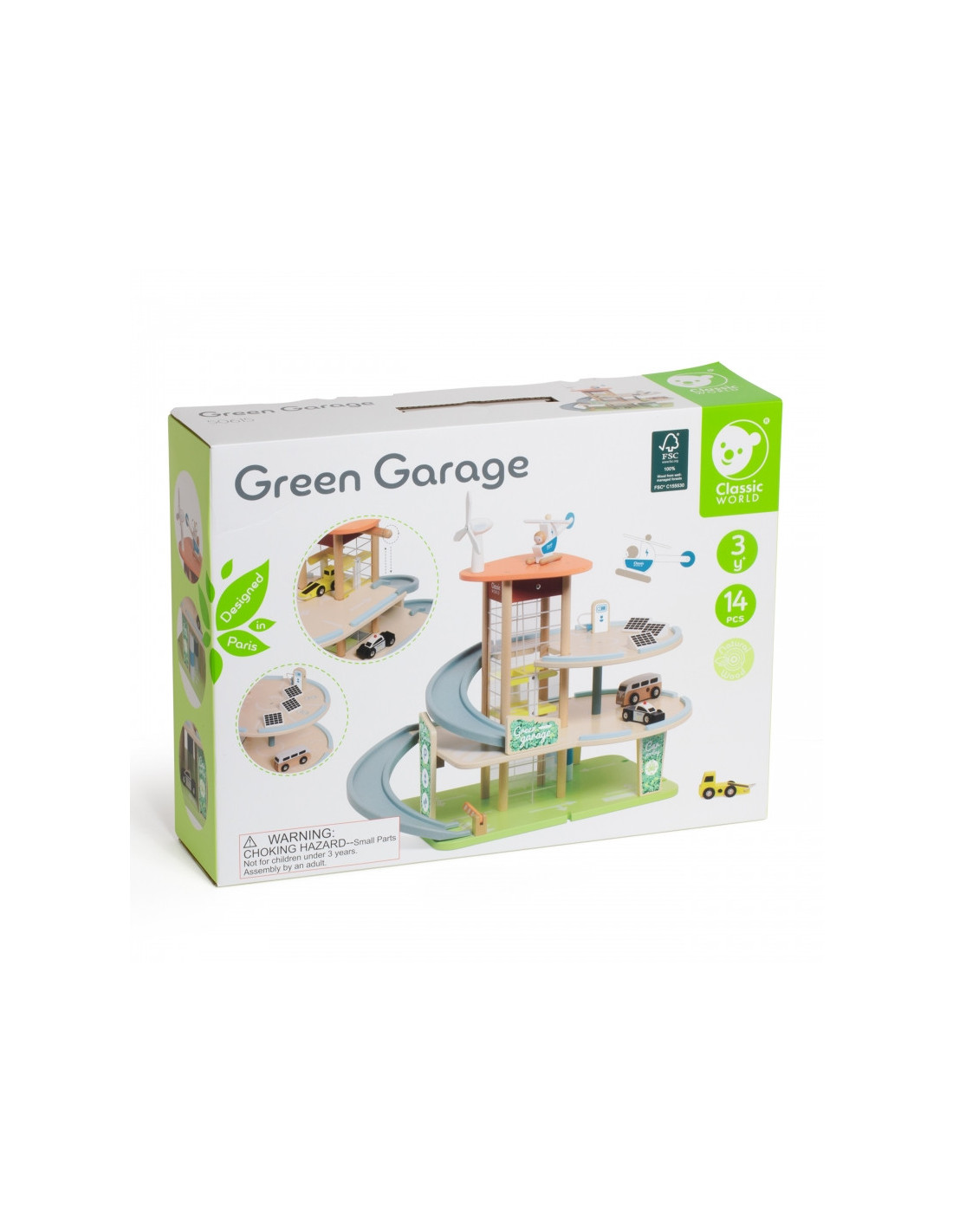 Drewniany wielopoziomowy parking od marki Classic World ze stacją ładowania pojazdów elektrycznych, windą, panelami fotowoltaicznymi, wiatrakiem oraz lądowiskiem dla helikoptera rozbudzi wyobraźnię każdego fana samochodów oraz motoryzacji. Aby pojazd mógł dostać się na parking lub z niego wyjechać należy podnieść szlaban. Dzięki windzie (która porusza się ręcznie) pojazdy mogą przemieszczać się pomiędzy piętrami. Szybki zjazd samochodów z poszczególnych poziomów umożliwia specjalny, kręty zjazd. Garaż wyposażony jest także w stację ładowania pojazdów elektrycznych. Ponadto w zestawie znajdują się 3 samochodziki oraz helikopter.