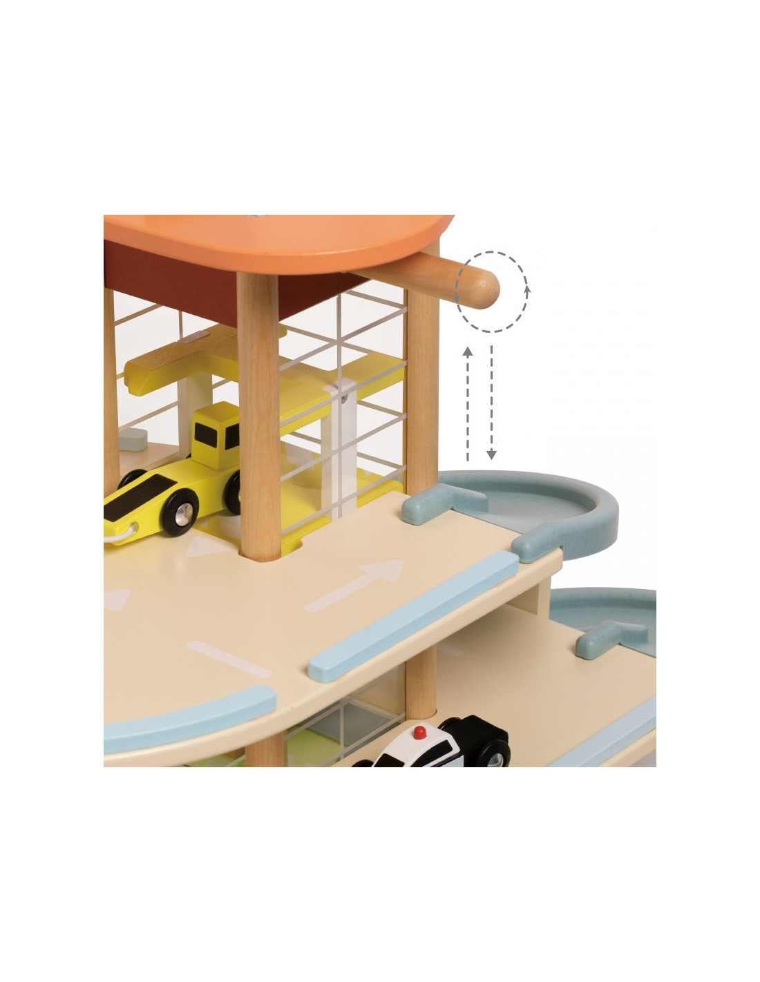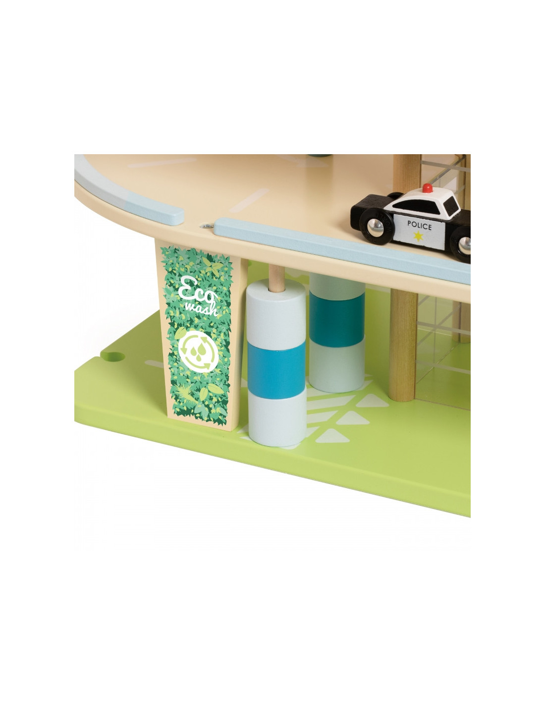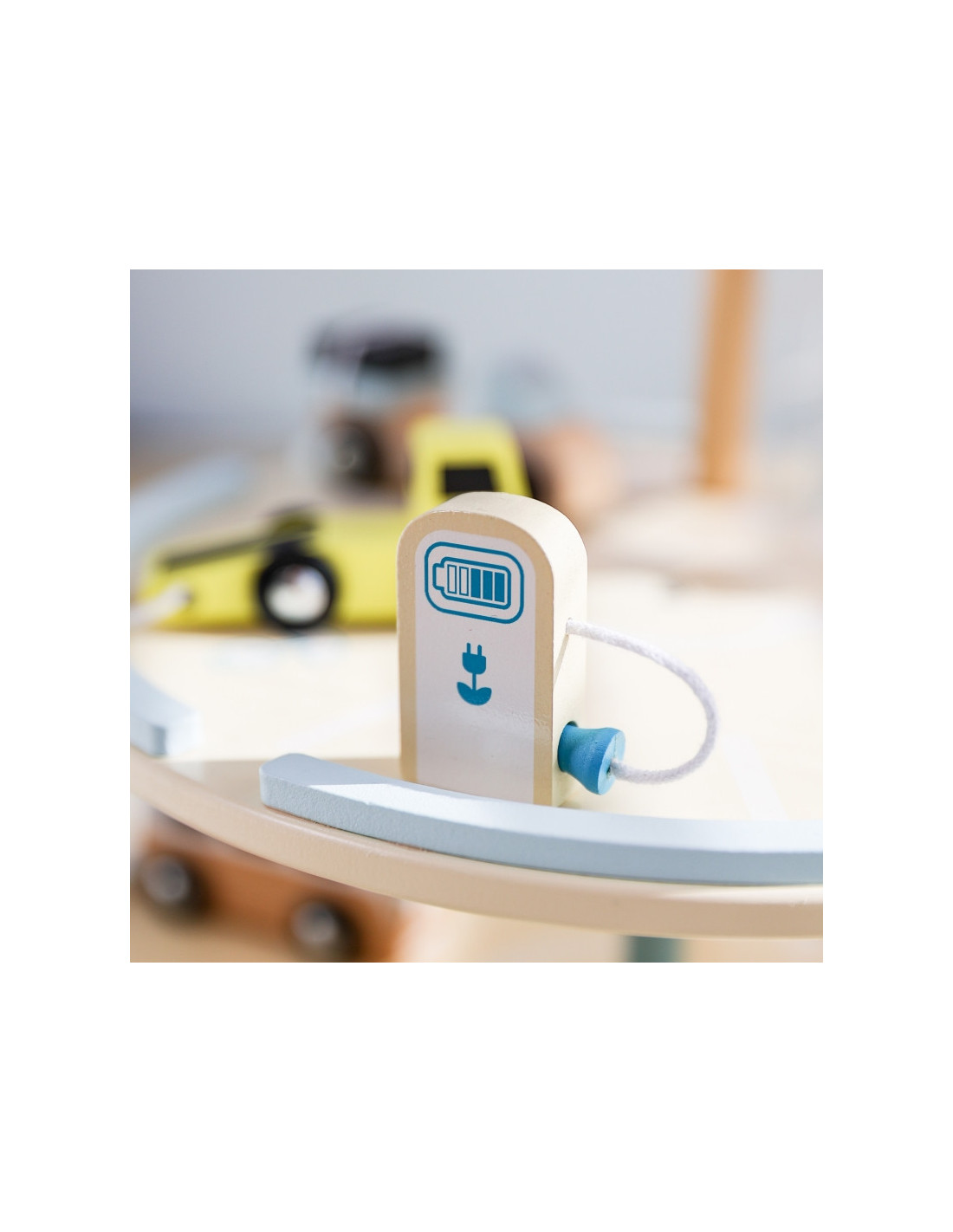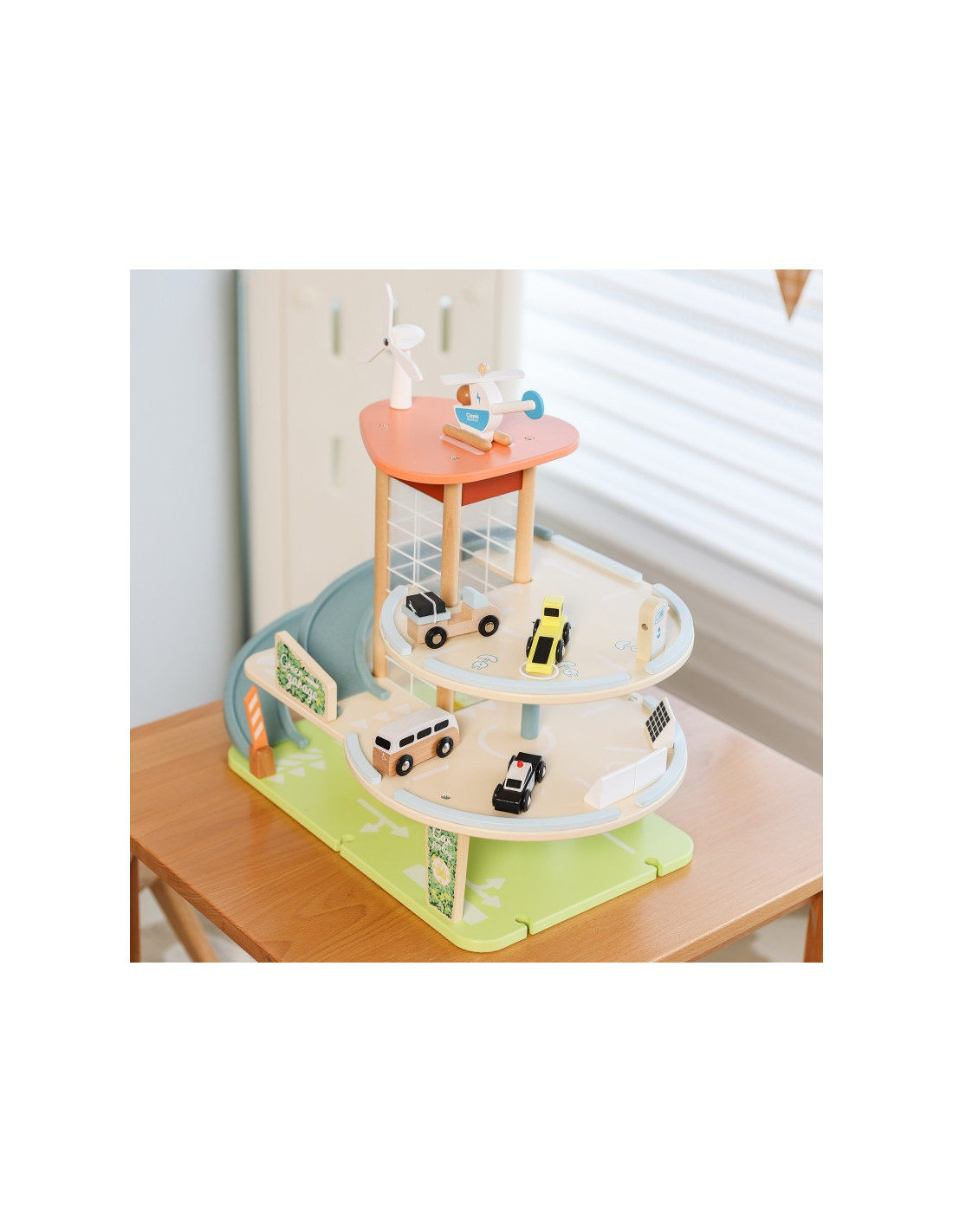 Drewniany wielopoziomowy parking od marki Classic World ze stacją ładowania pojazdów elektrycznych, windą, panelami fotowoltaicznymi, wiatrakiem oraz lądowiskiem dla helikoptera rozbudzi wyobraźnię każdego fana samochodów oraz motoryzacji. Aby pojazd mógł dostać się na parking lub z niego wyjechać należy podnieść szlaban. Dzięki windzie (która porusza się ręcznie) pojazdy mogą przemieszczać się pomiędzy piętrami. Szybki zjazd samochodów z poszczególnych poziomów umożliwia specjalny, kręty zjazd. Garaż wyposażony jest także w stację ładowania pojazdów elektrycznych. Ponadto w zestawie znajdują się 3 samochodziki oraz helikopter.
