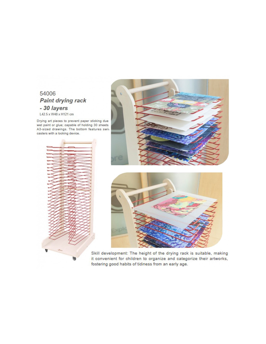 EDU serijos prekės ženklo CLASSIC WORLD meninis džiovintuvas išryškins geriausius mažųjų menininkų darbus! Daugiasluoksnėje džiovykloje telpa ne daugiau kaip 30 piešinių (maks. A3 dydžio). Dėl ratų fiksavimo mechanizmo darbai saugiai išdžius, o dėl rankenos ir efektyvių ratų stovą perkelti labai paprasta. Būtina turėti bet kuriame kambaryje, kambaryje ar kultūros vietoje!