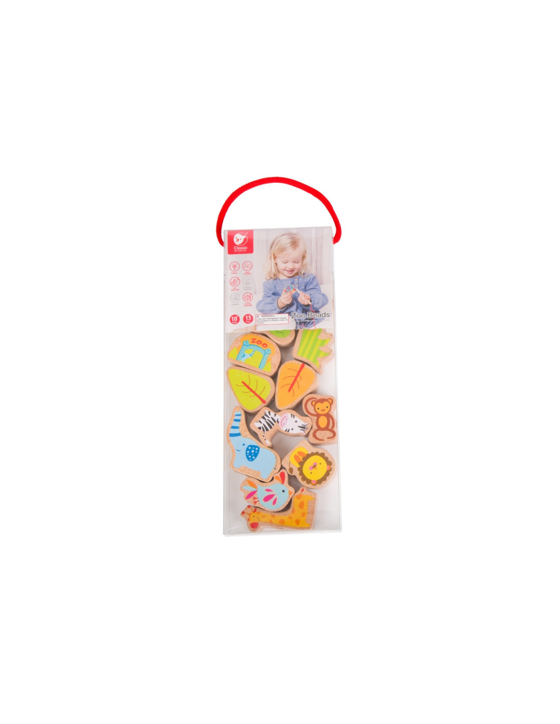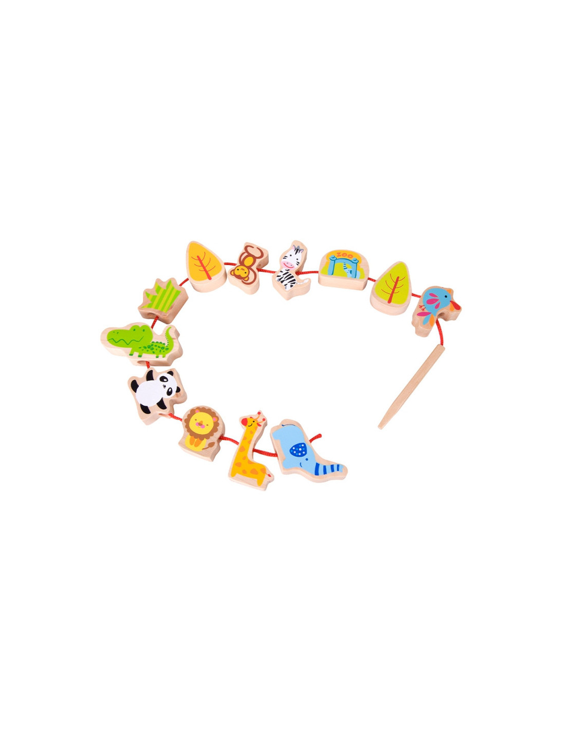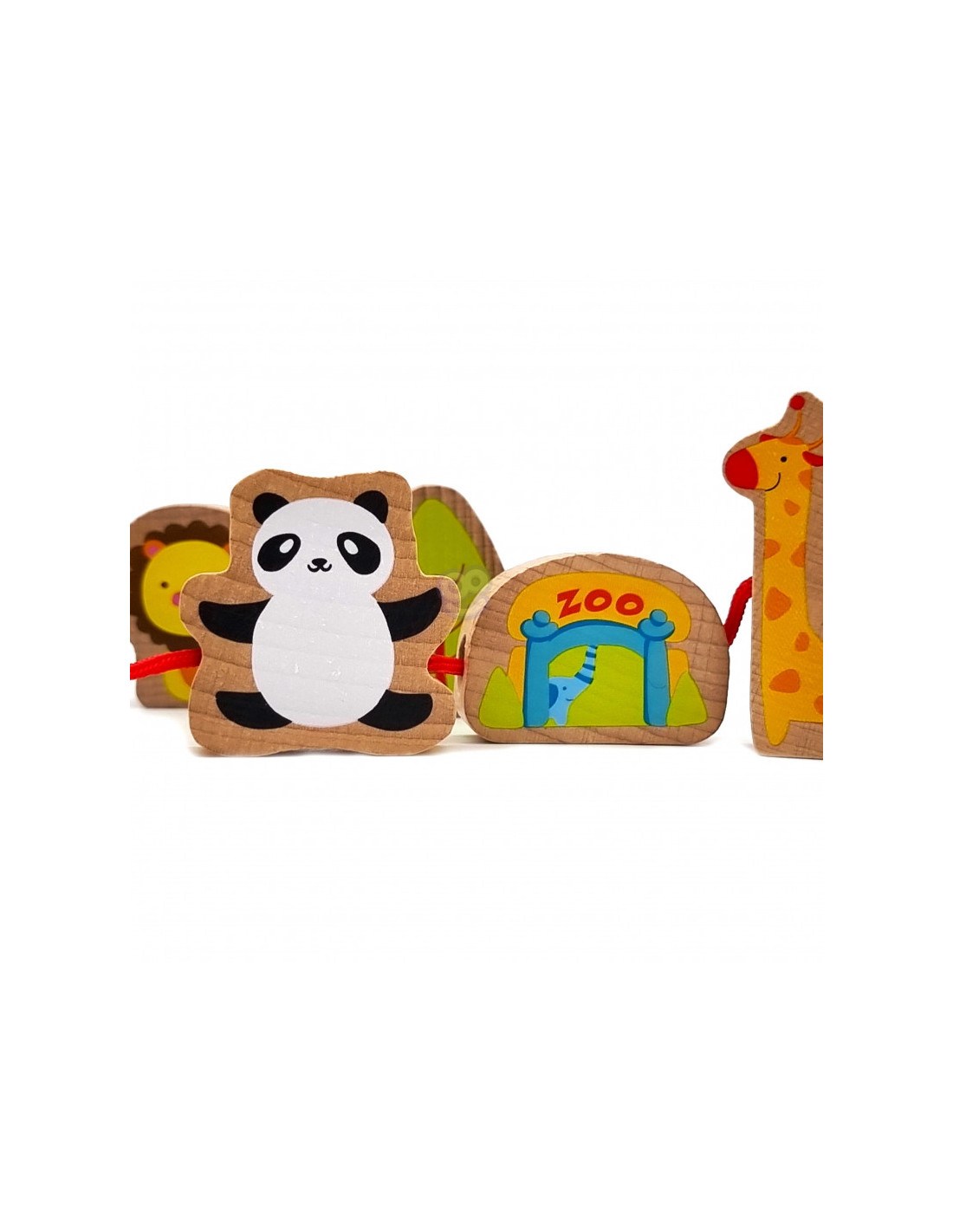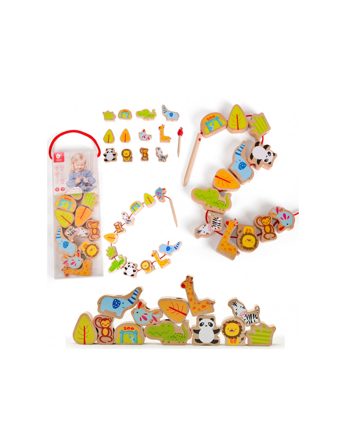 Drewniana sznurowanka ZOO marki Classic World to świetna zabawka dla dzieci, która pozwoli maluchom na rozwinięcie swojej zręczności, precyzji oraz koordynacji wzrokowo-ruchowej, pozwala poznać różne gatunki zwierząt zamieszkujących ZOO. Drewniane klocki do nawlekania na sznureczek posiadają kształty i motywy związane ze zwierzątkami z ZOO. Zadaniem dziecka jest nawlekanie koralików o różnych kształtach na sznureczek. Zabawka składa się z 12 klocków przedstawiających pandę, lwa, żyrafę, krokodyla, oraz inne elementy scenerii ZOO. Zabawka uczy również cierpliwości, oraz determinacji, gdyż nawleczenie wszystkich elementów na pewno pochłonie malucha bez reszty na wiele godzin.