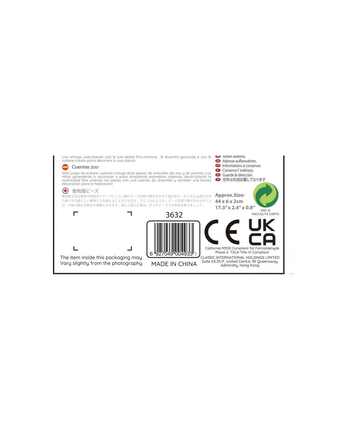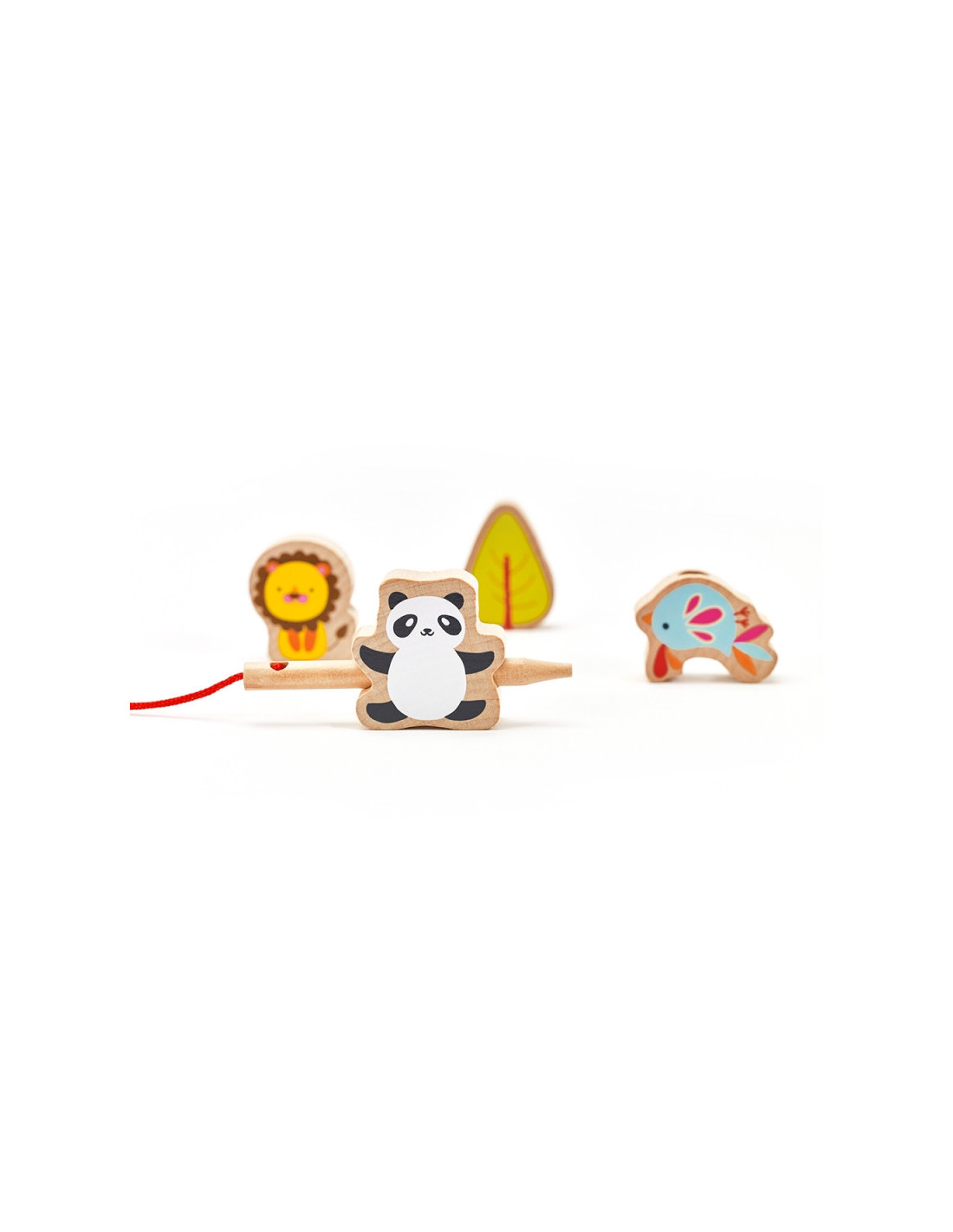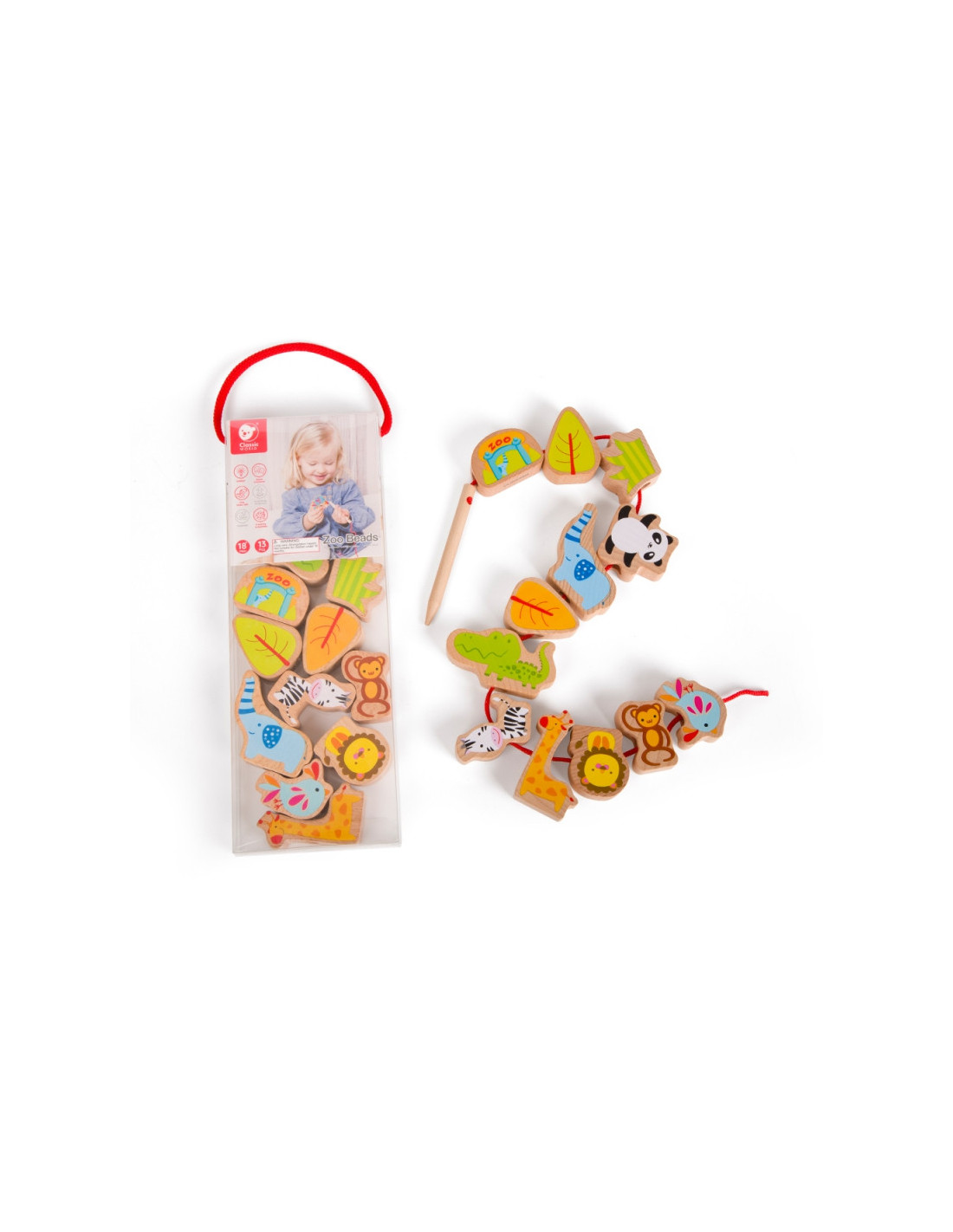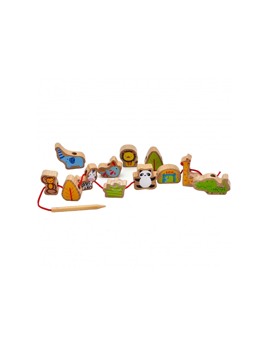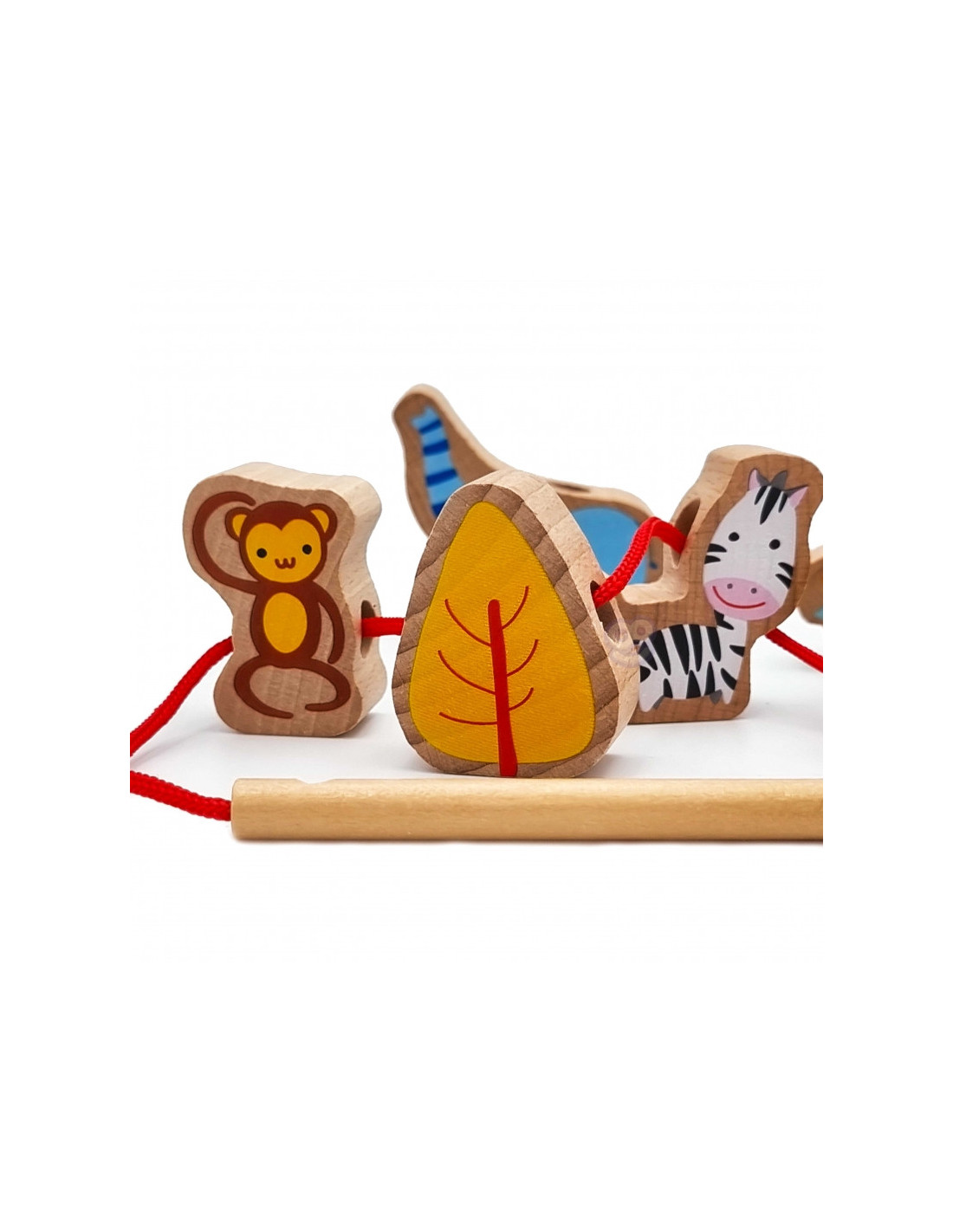 Drewniana sznurowanka ZOO marki Classic World to świetna zabawka dla dzieci, która pozwoli maluchom na rozwinięcie swojej zręczności, precyzji oraz koordynacji wzrokowo-ruchowej, pozwala poznać różne gatunki zwierząt zamieszkujących ZOO. Drewniane klocki do nawlekania na sznureczek posiadają kształty i motywy związane ze zwierzątkami z ZOO. Zadaniem dziecka jest nawlekanie koralików o różnych kształtach na sznureczek. Zabawka składa się z 12 klocków przedstawiających pandę, lwa, żyrafę, krokodyla, oraz inne elementy scenerii ZOO. Zabawka uczy również cierpliwości, oraz determinacji, gdyż nawleczenie wszystkich elementów na pewno pochłonie malucha bez reszty na wiele godzin.
