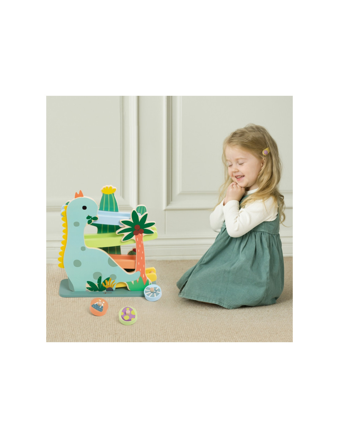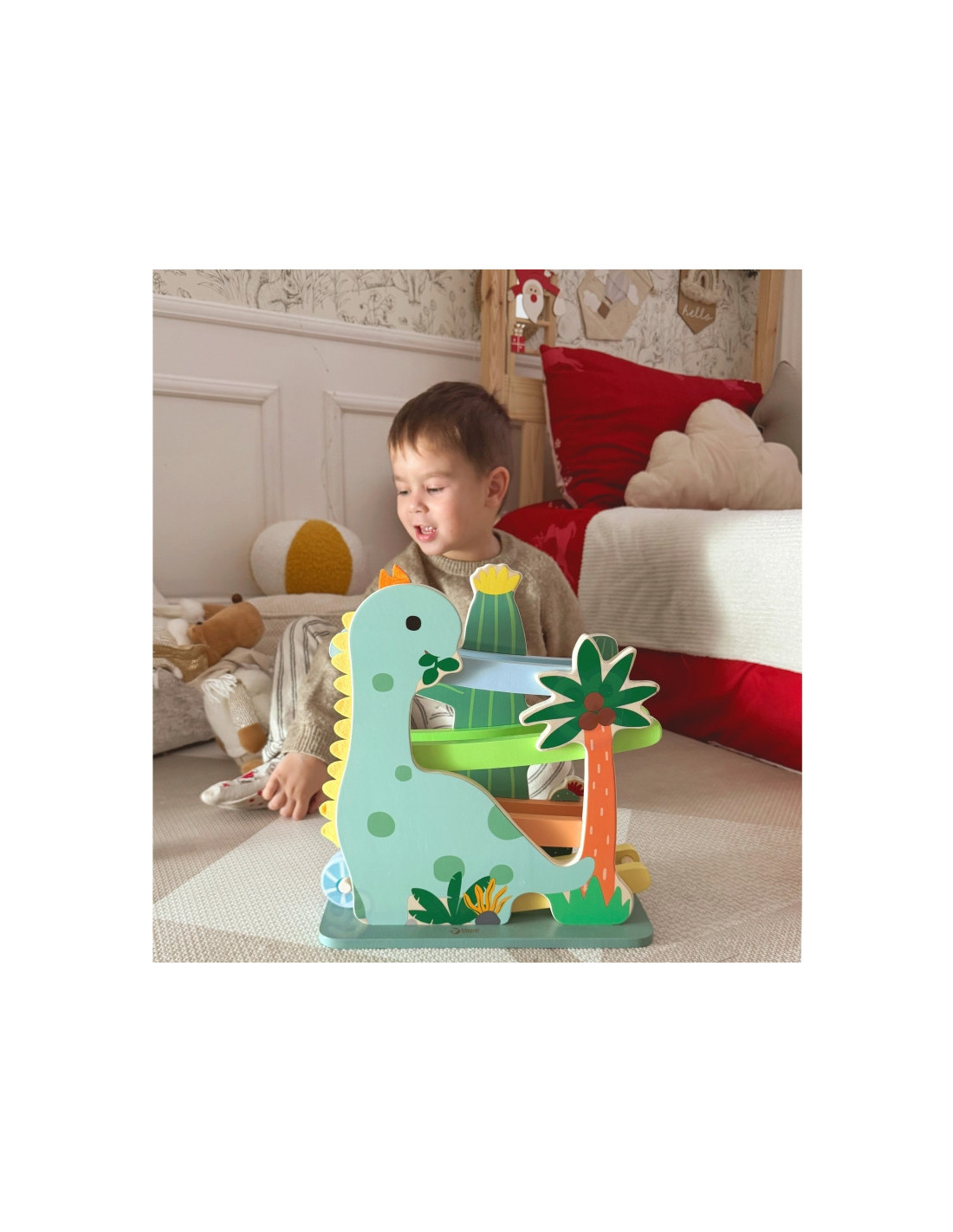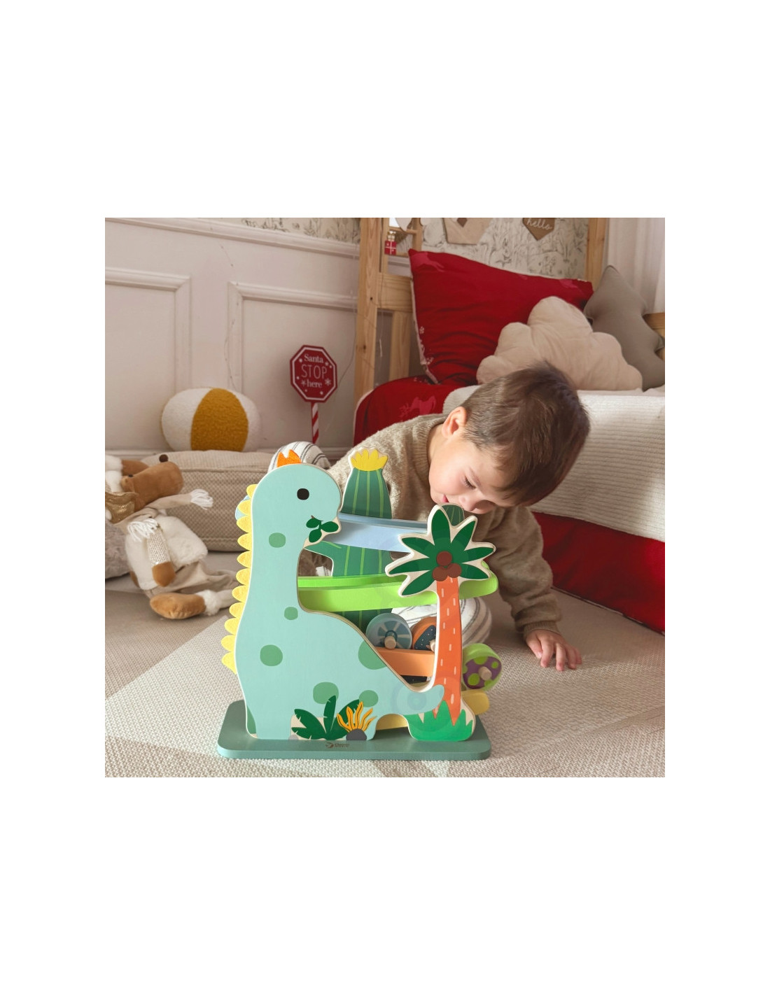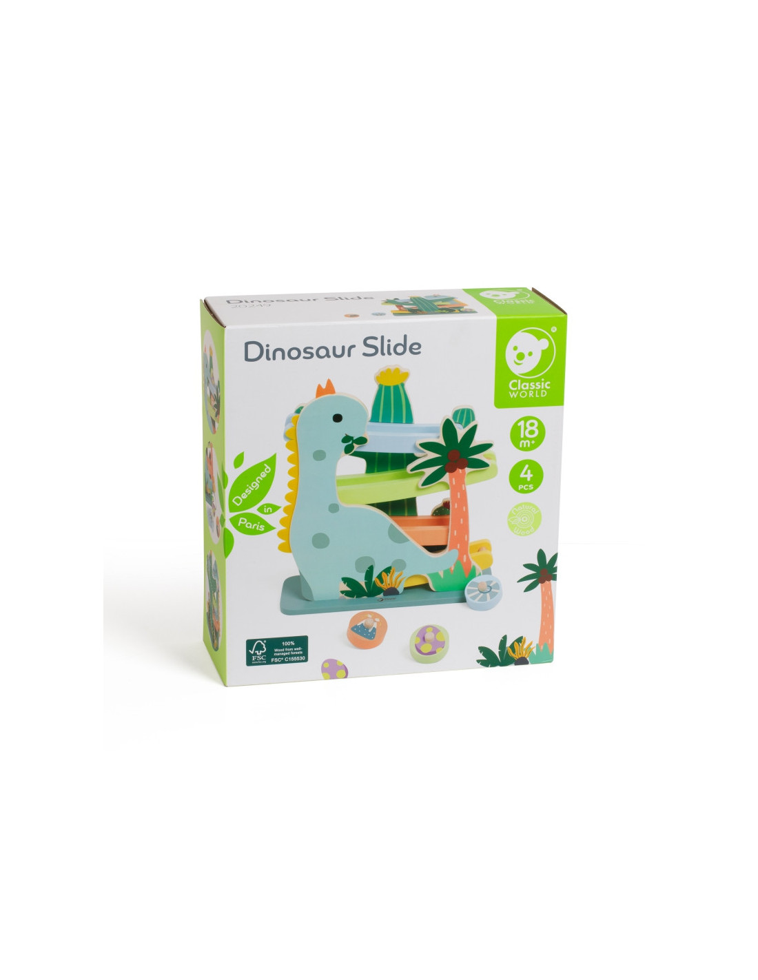 Ta kolorowa zjeżdżalnia dla dinozaurów od marki CLASSIC WORLD to fantastyczna zabawka, która zapewni Twojemu dziecku mnóstwo radości. Składa się z solidnej, drewnianej konstrukcji i 4 uroczych, okrągłych elementów, które inspirują wyobraźnię do przygód w świecie dinozaurów. Poprzez zabawę kinetyczną, maluch może obserwować, jak elementy zjeżdżają w dół toru, co w naturalny sposób uczy go podstawowych zasad fizyki.